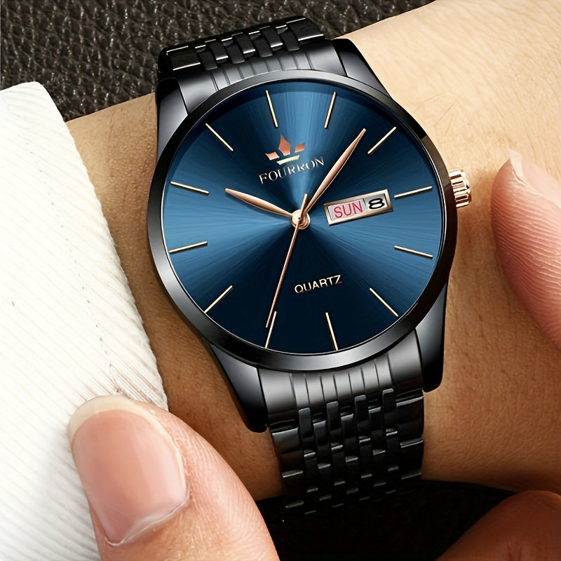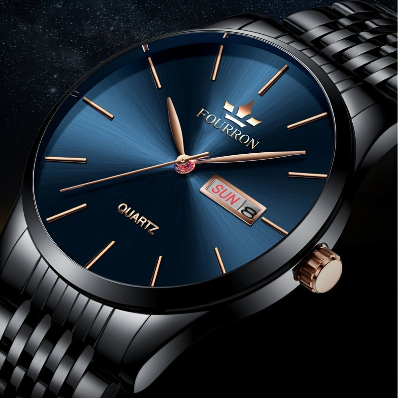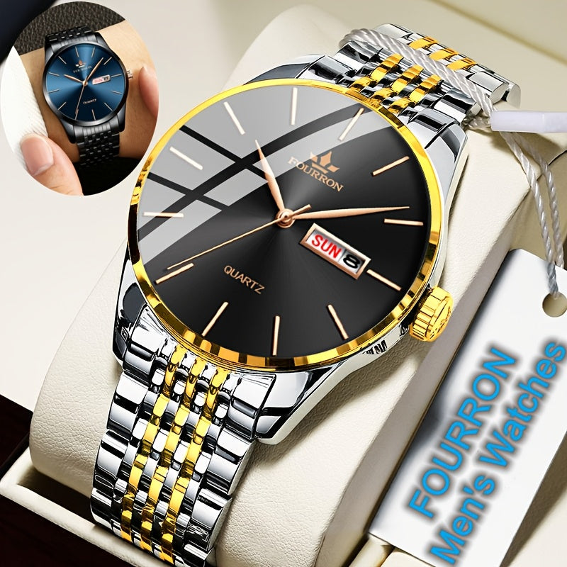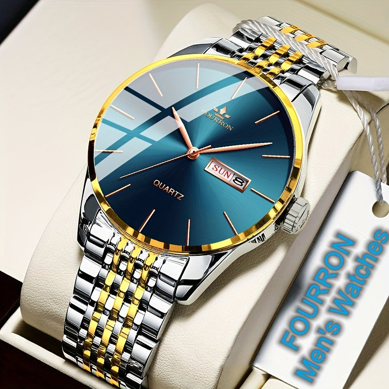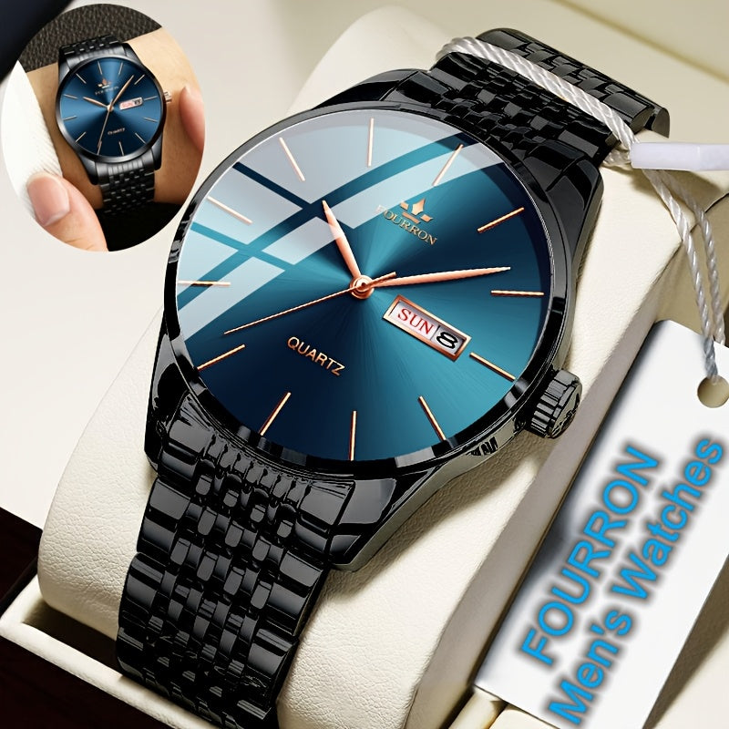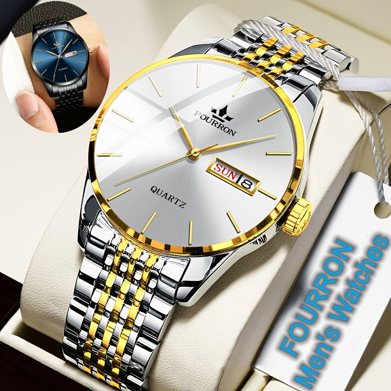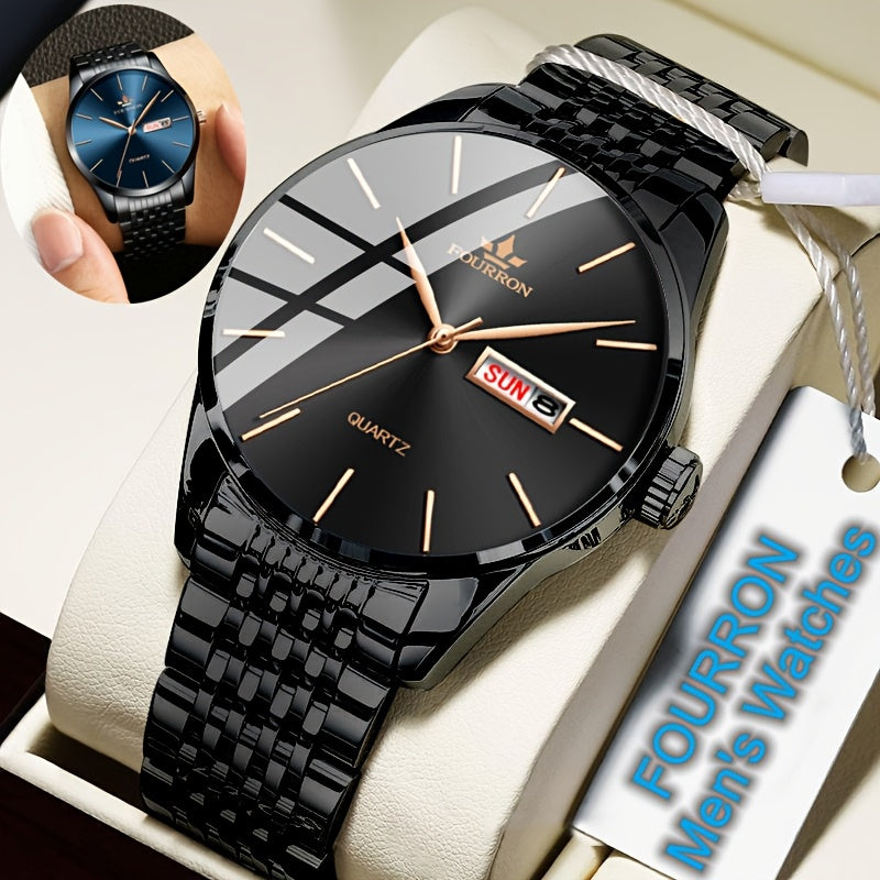 An Ideal Choice For A New FOURRON Brand Men's Luxury Stainless Steel Strap Simple Dial Quartz Watch With Date Calendar, Trendy Fashion Sports Casual Lifestyle Travel Multi-function Watch, Ideal For Friends' Birthdays, Holiday