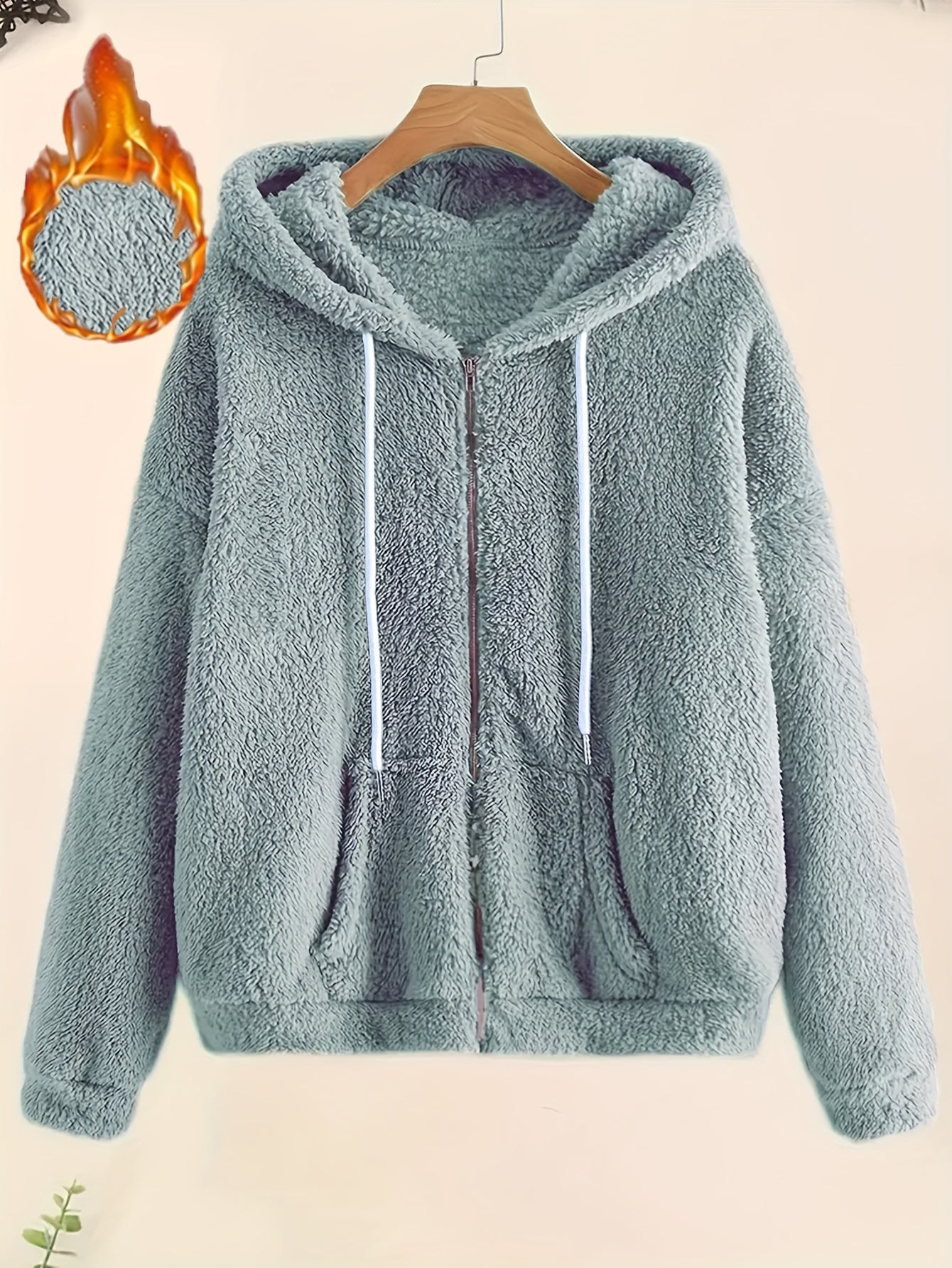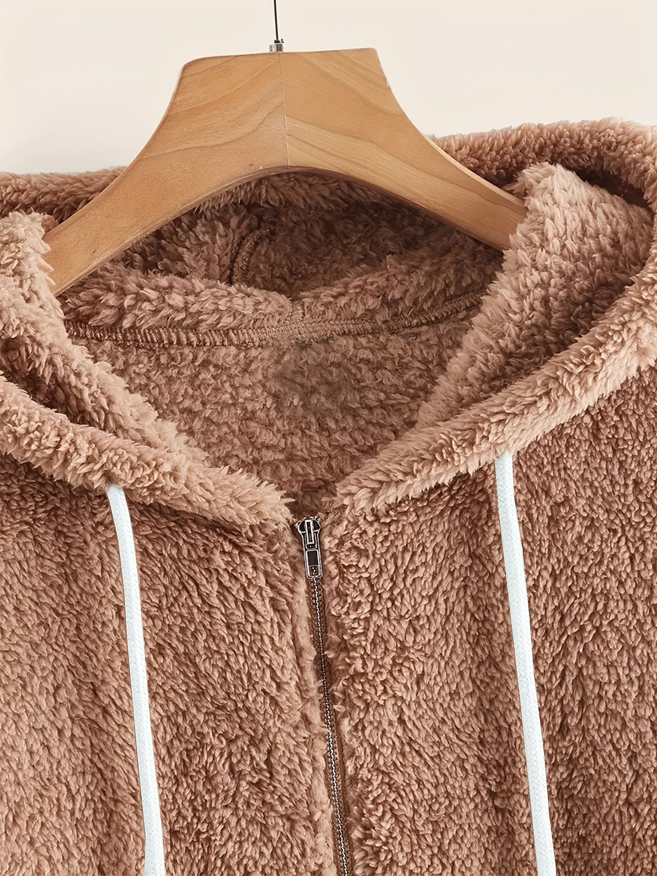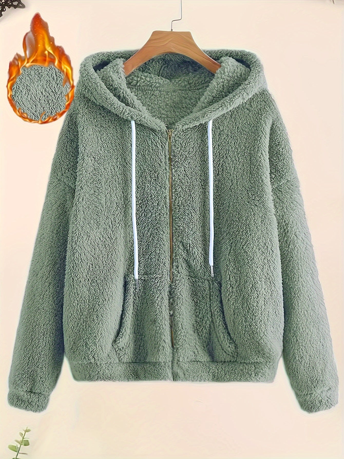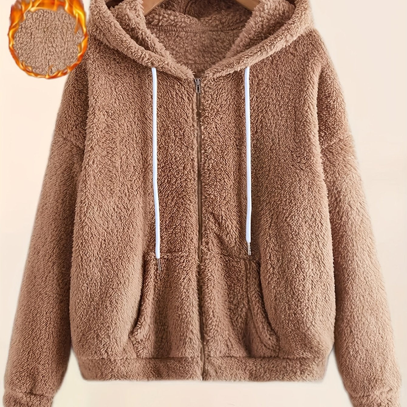Cozy Fleece-Lined Hooded Jacket for Women - Casual Solid Color with Drawstring, Zip-Up Front, Long Sleeves - Perfect for Fall & Winter