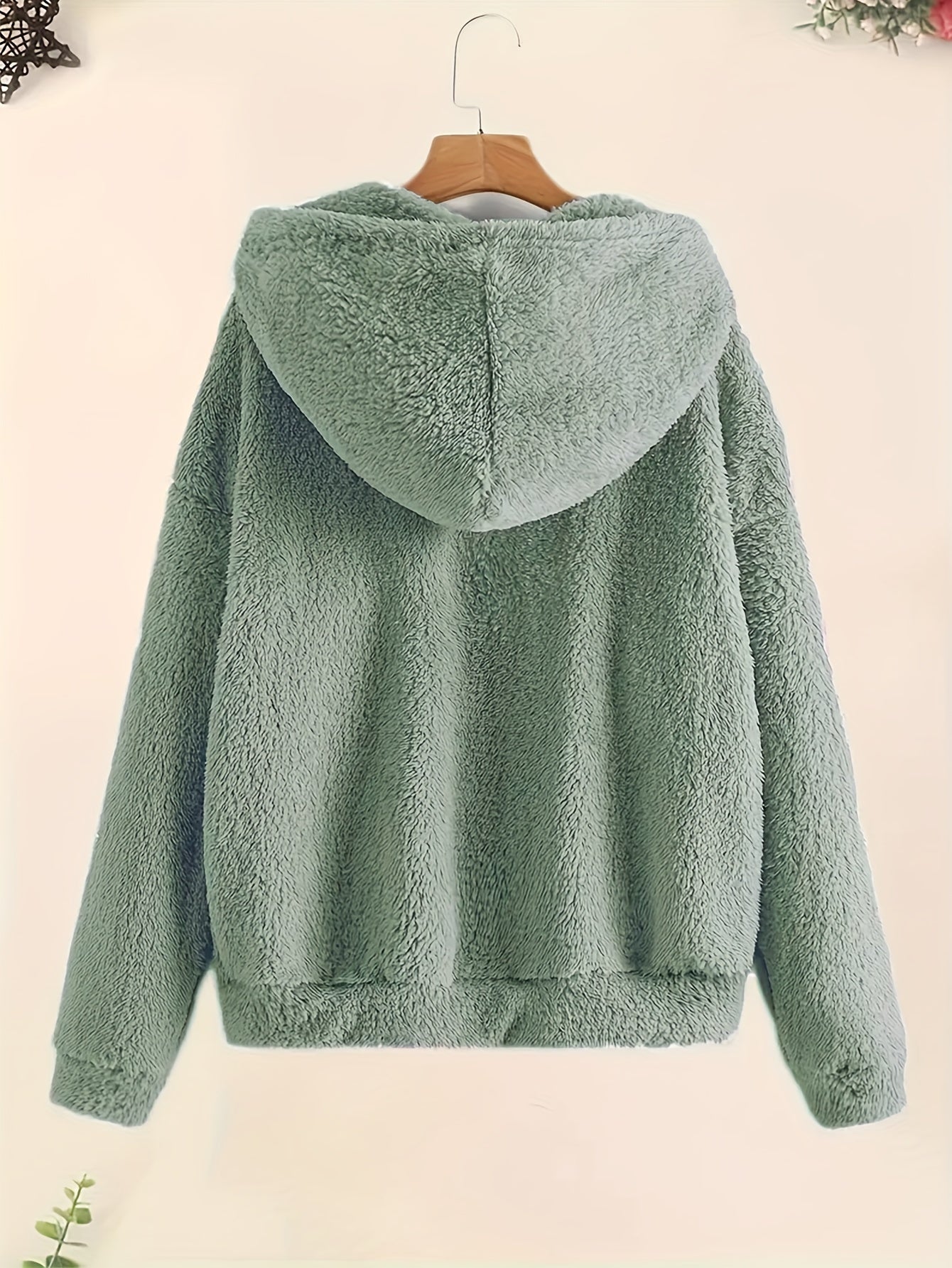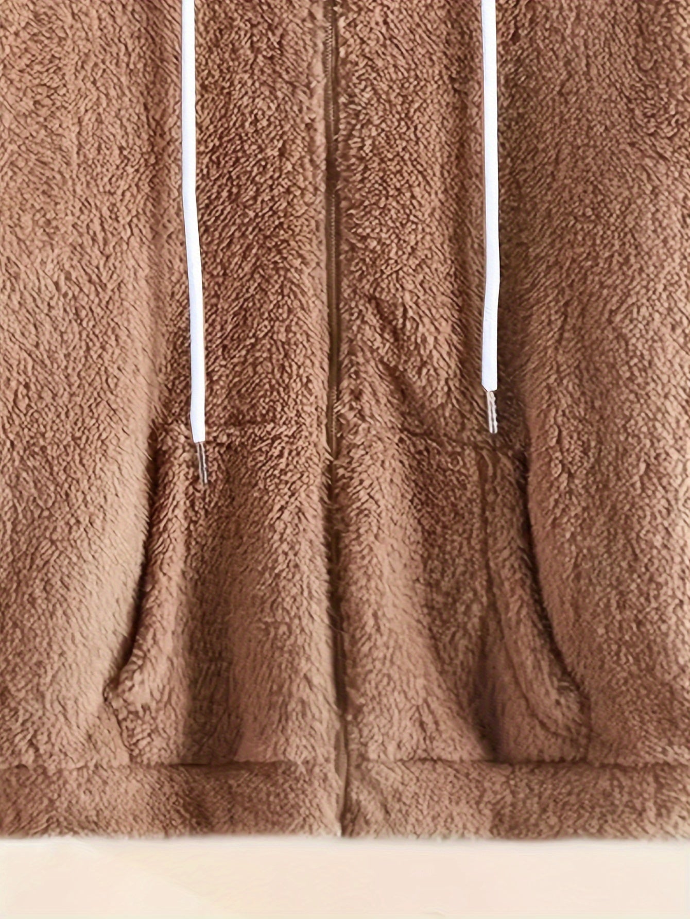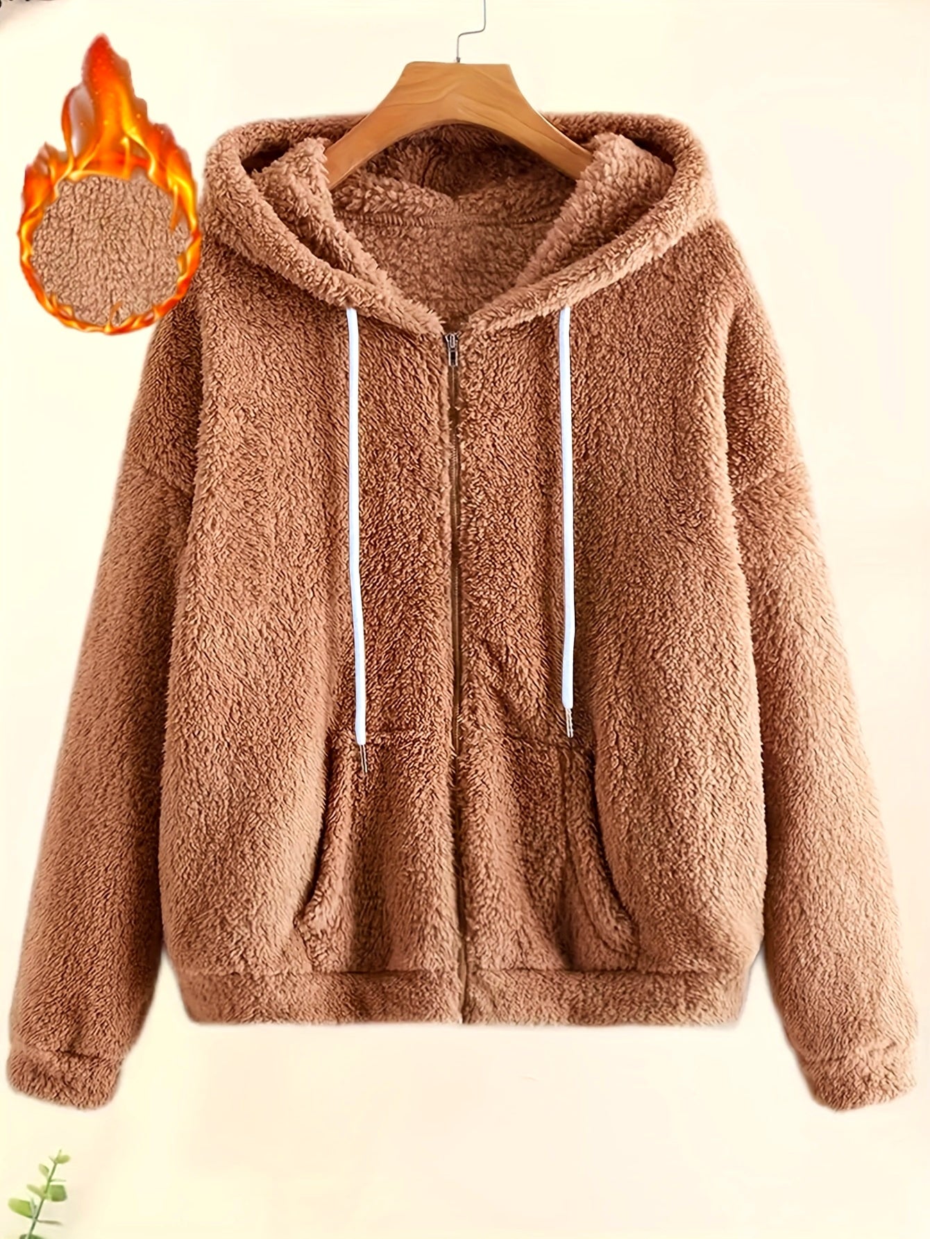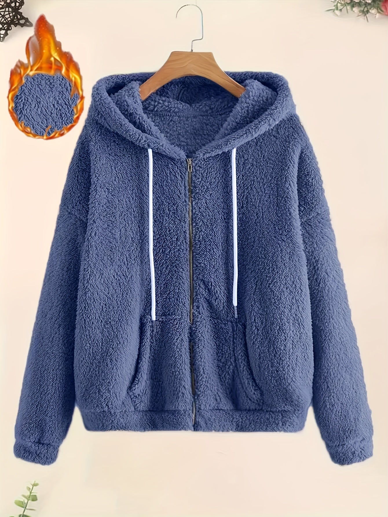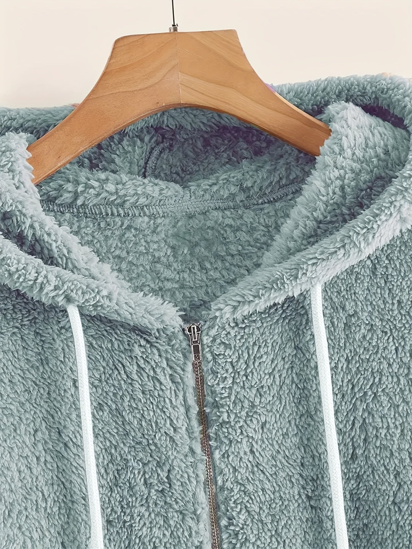 Cozy Fleece-Lined Hooded Jacket for Women - Casual Solid Color with Drawstring, Zip-Up Front, Long Sleeves - Perfect for Fall & Winter