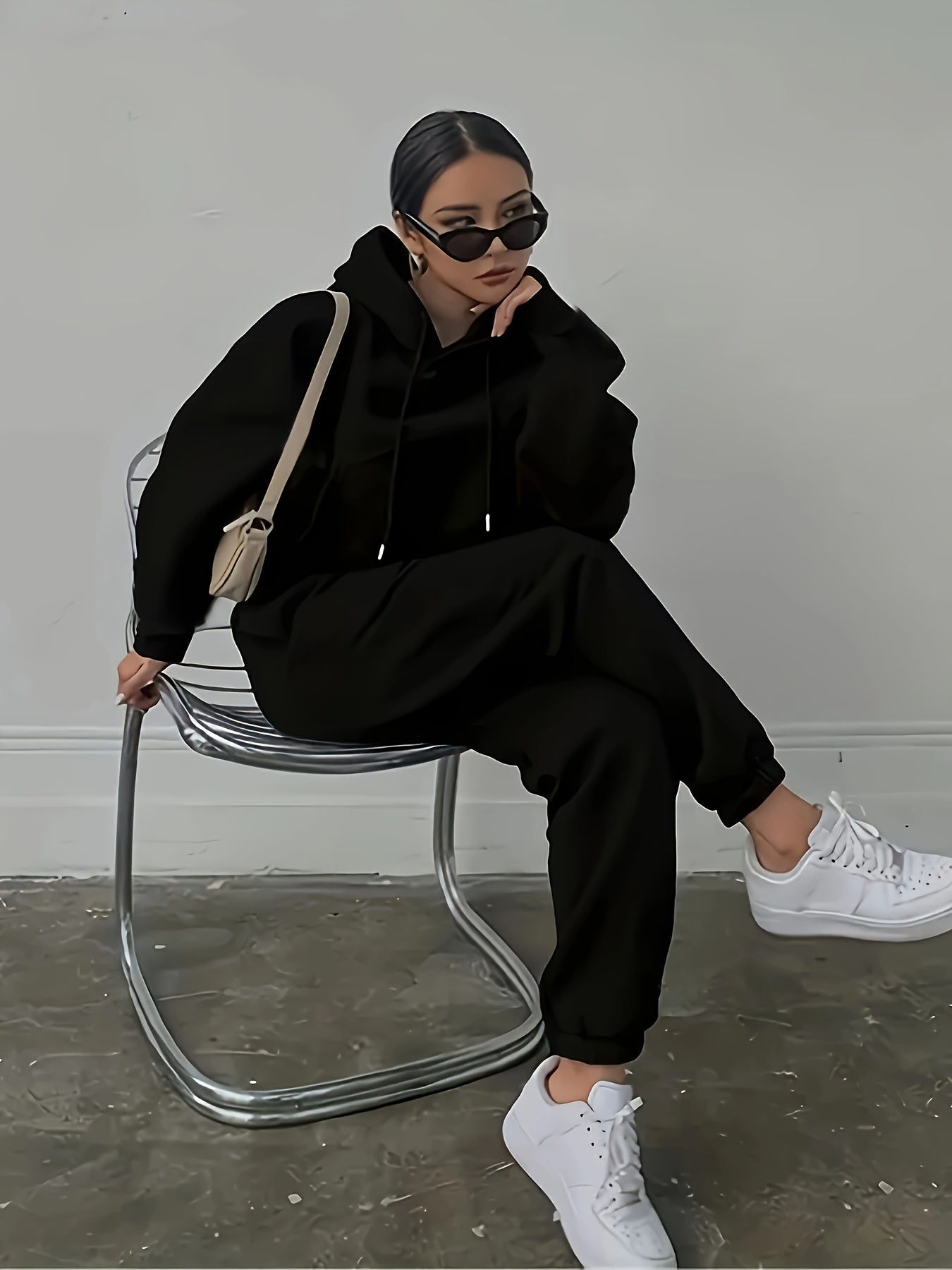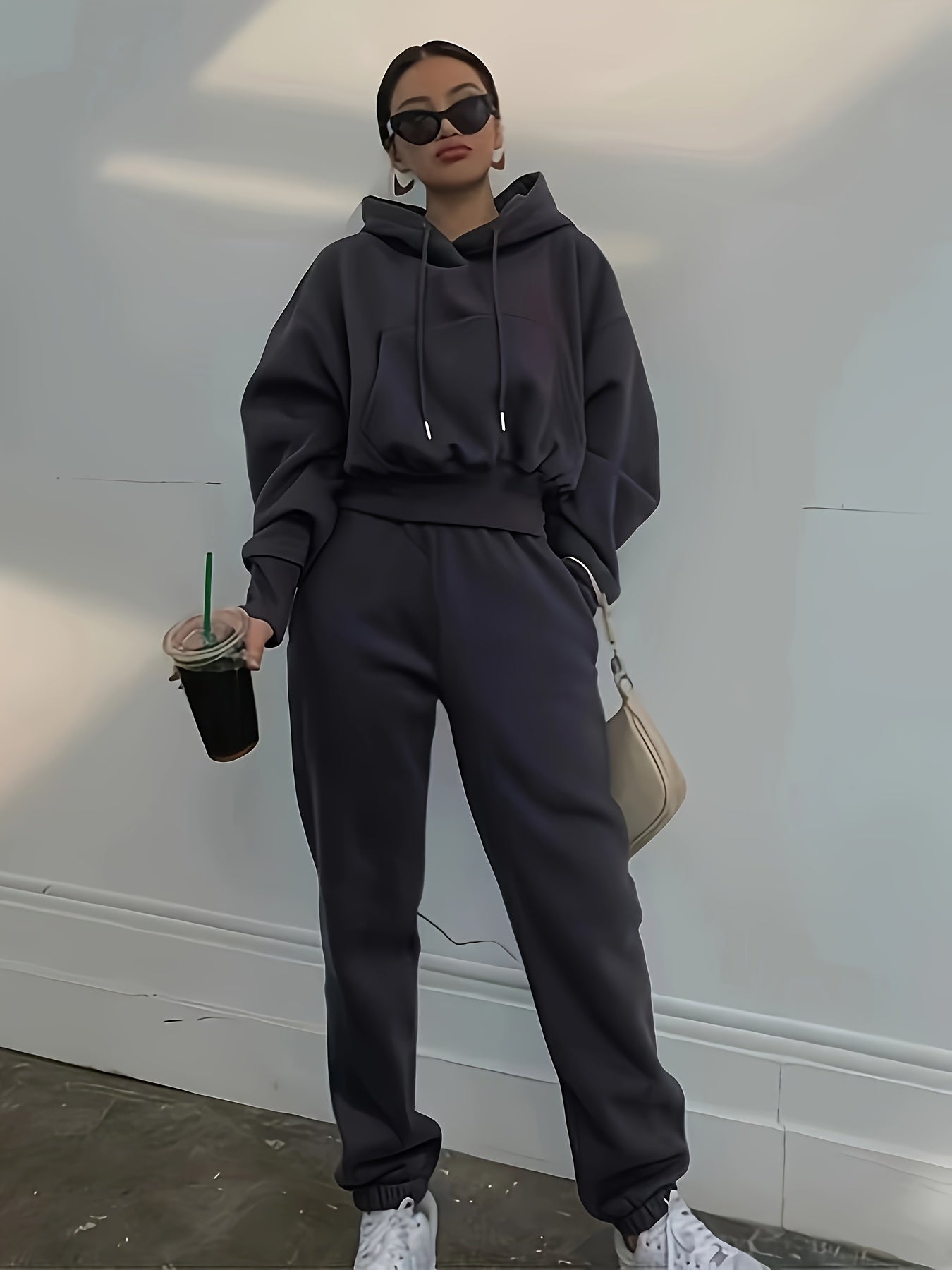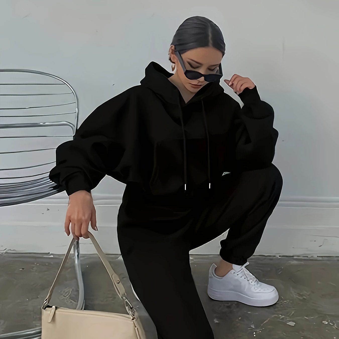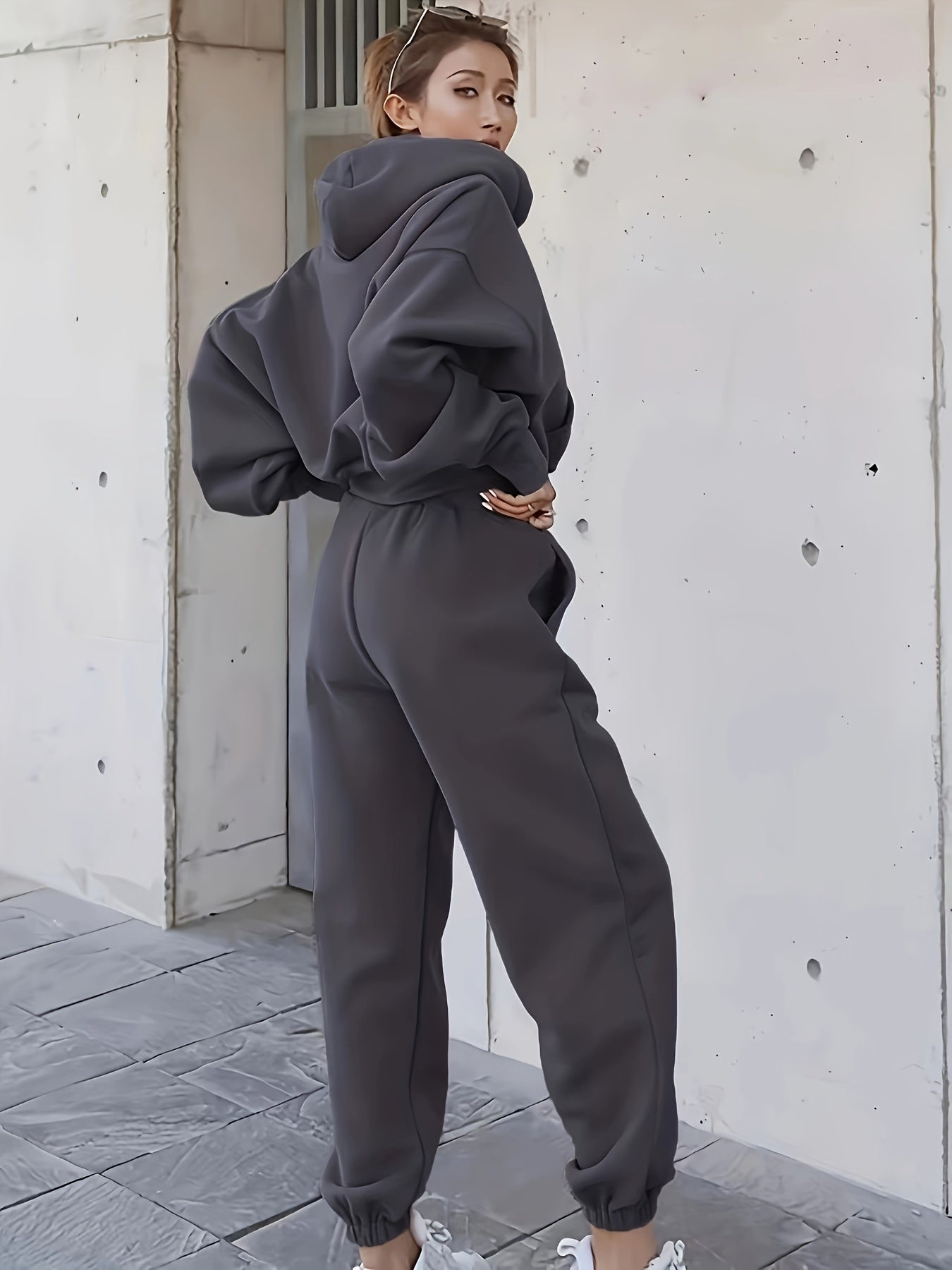Cozy Fleece-Lined Hoodie & Joggers Set for Women - Casual Solid Color, Long Sleeve with Drawstring Waist, Machine Washable - Perfect for Fall/Winter