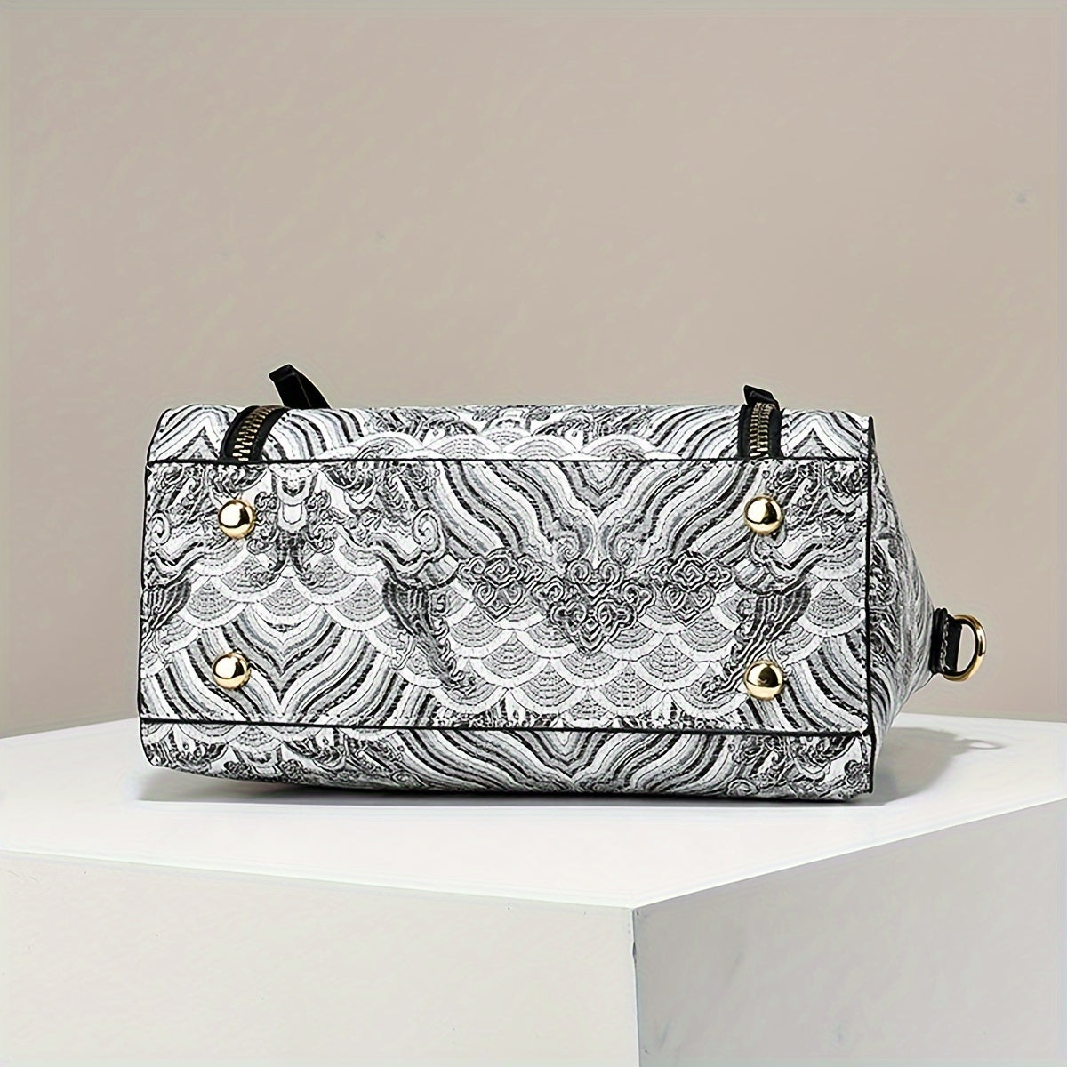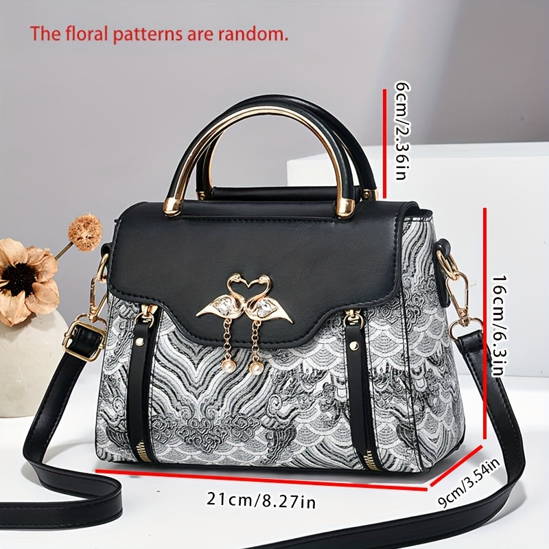 Elegant Floral Embroidered Handbag for Women - Adjustable Strap, Zipper Closure, Polyester Lining, Black & White Floral Pattern, Perfect Gift for Mom Or Family, Small Crossbody Purse, Stylish Accessory, Durable Construction
