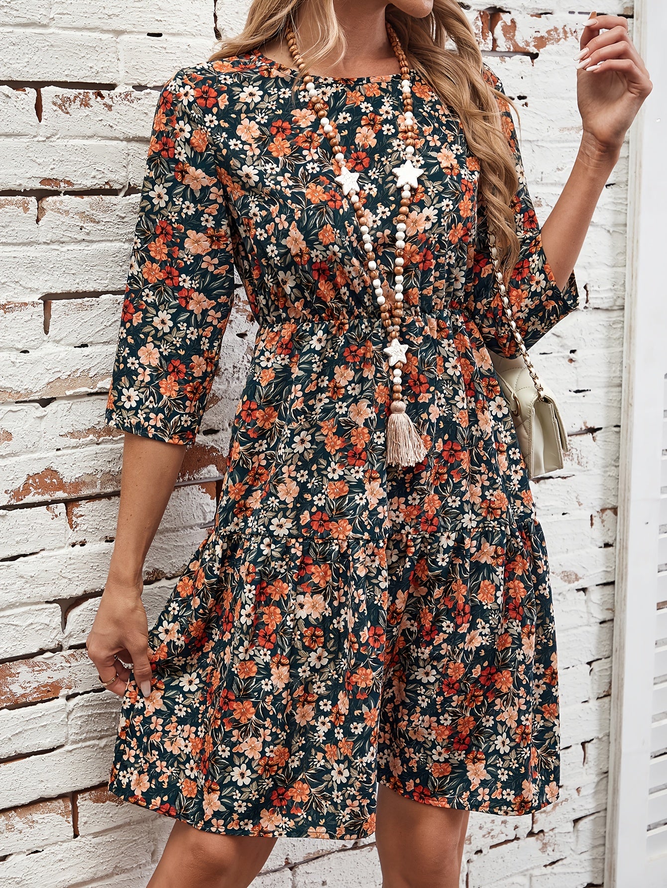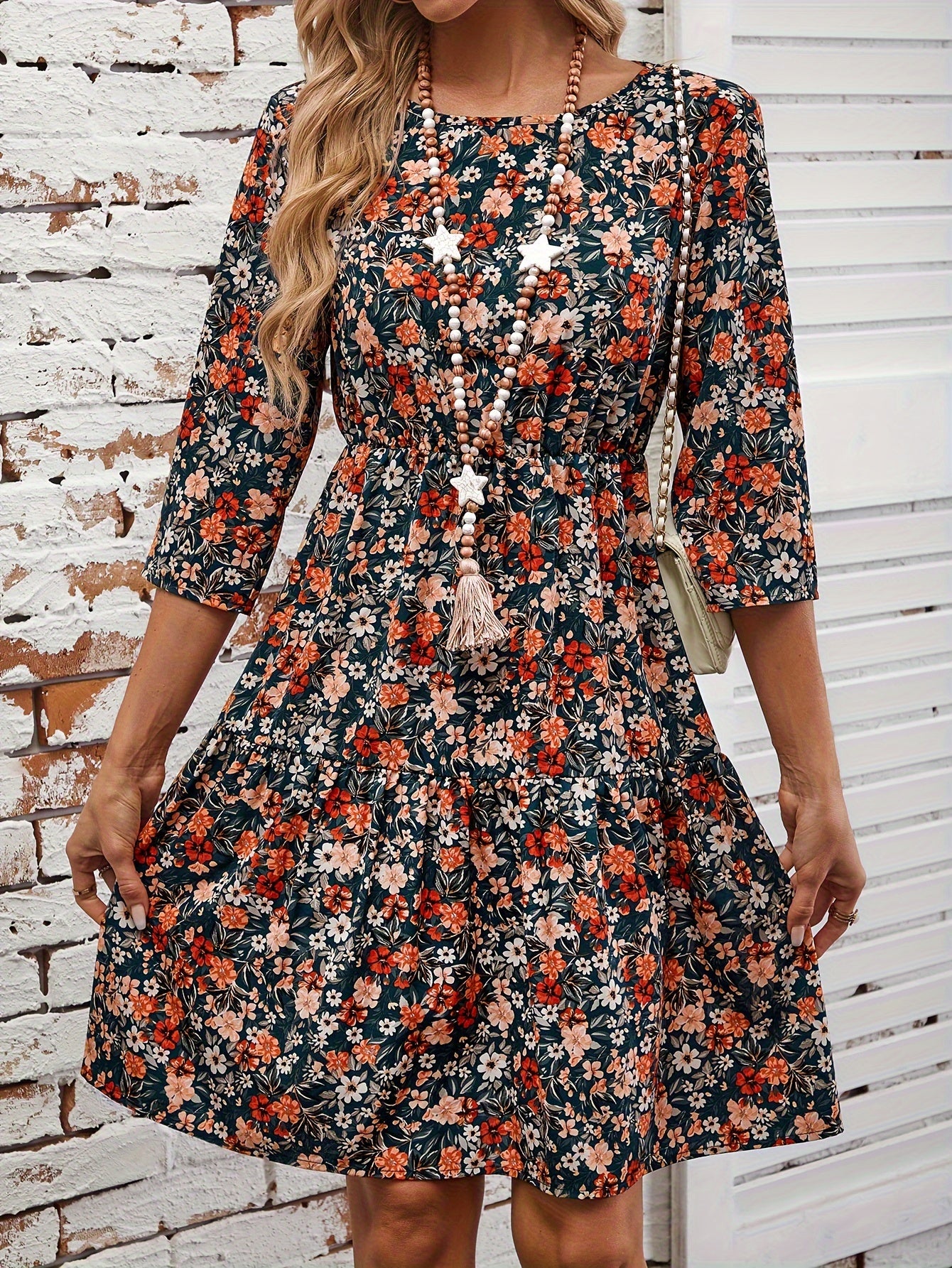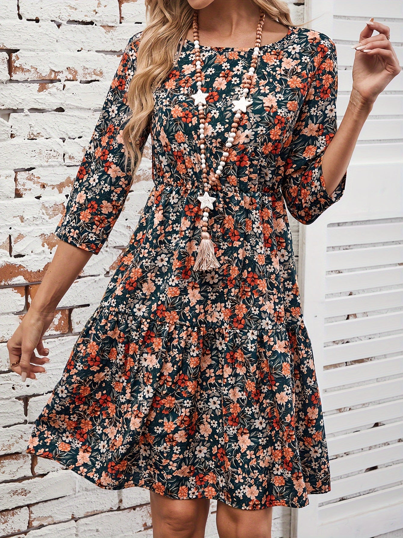 Elegant Floral Print Midi Dress for Women - Crew Neck, 3/4 Sleeve, A-Line with Ruffle Hem, Machine Washable - Perfect for Fall, for Autumn, Spring