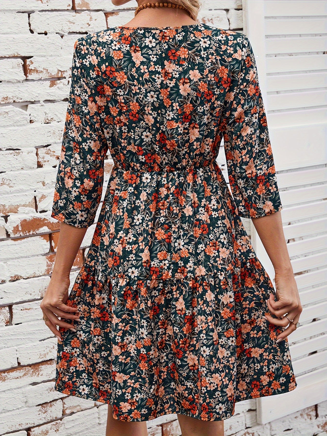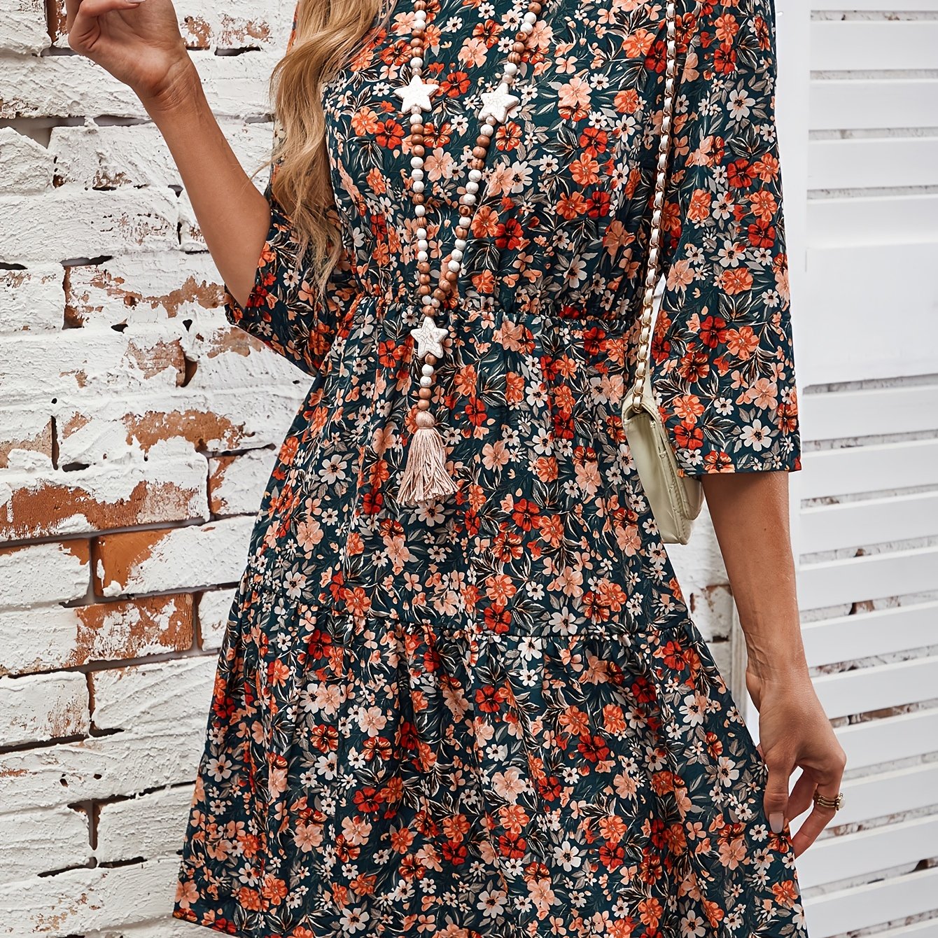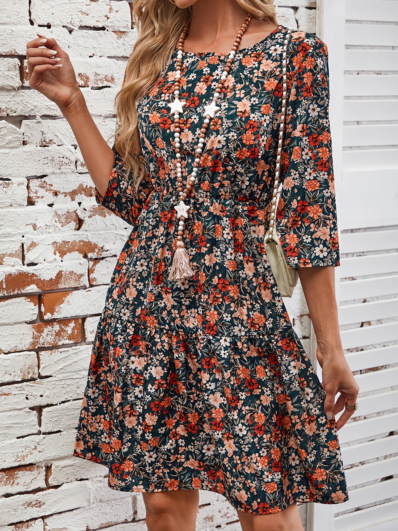 Elegant Floral Print Midi Dress for Women - Crew Neck, 3/4 Sleeve, A-Line with Ruffle Hem, Machine Washable - Perfect for Fall, for Autumn, Spring