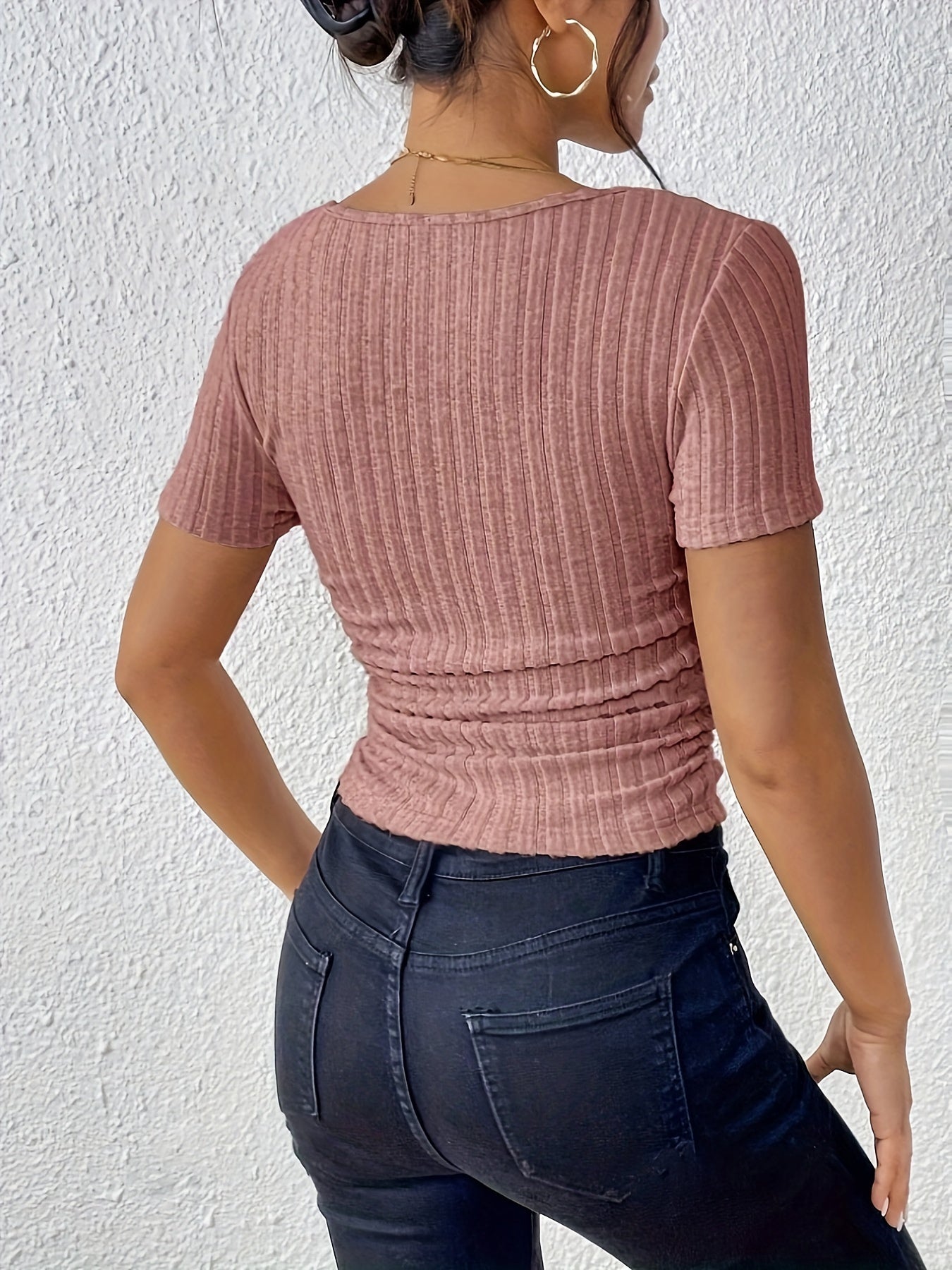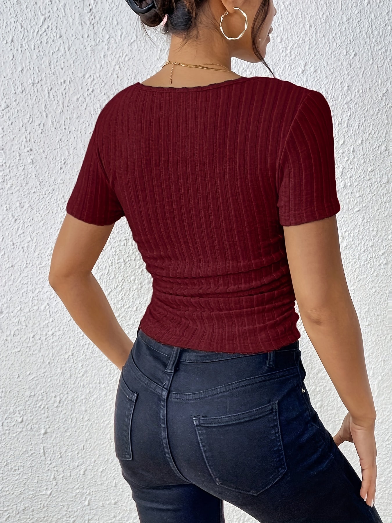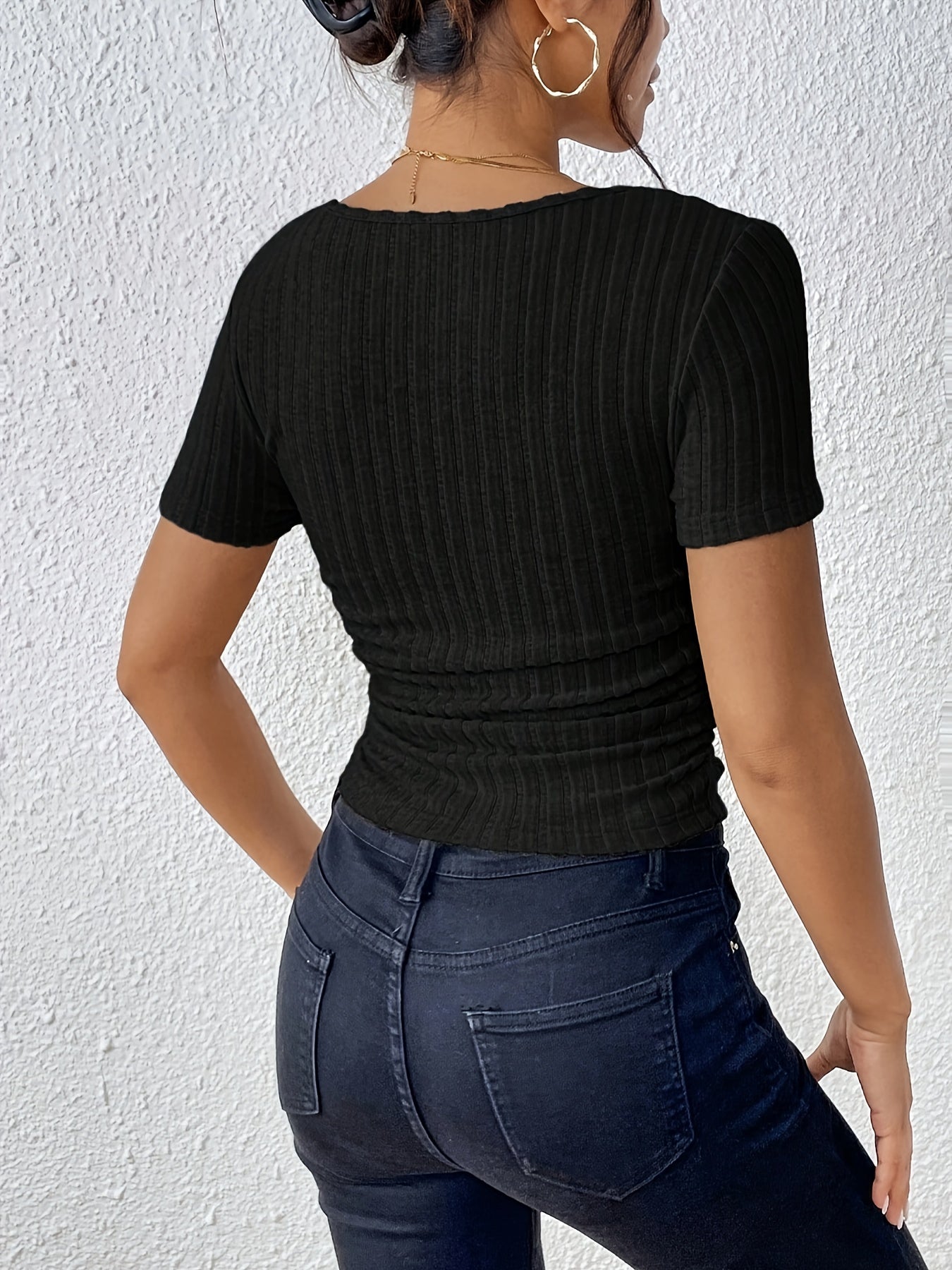 Elegant French Square Neck Ruched Side T-Shirt - Black, Stretchy & Machine Washable, Perfect for Spring/Summer, Casual Chic Style, Ladies T Shirts