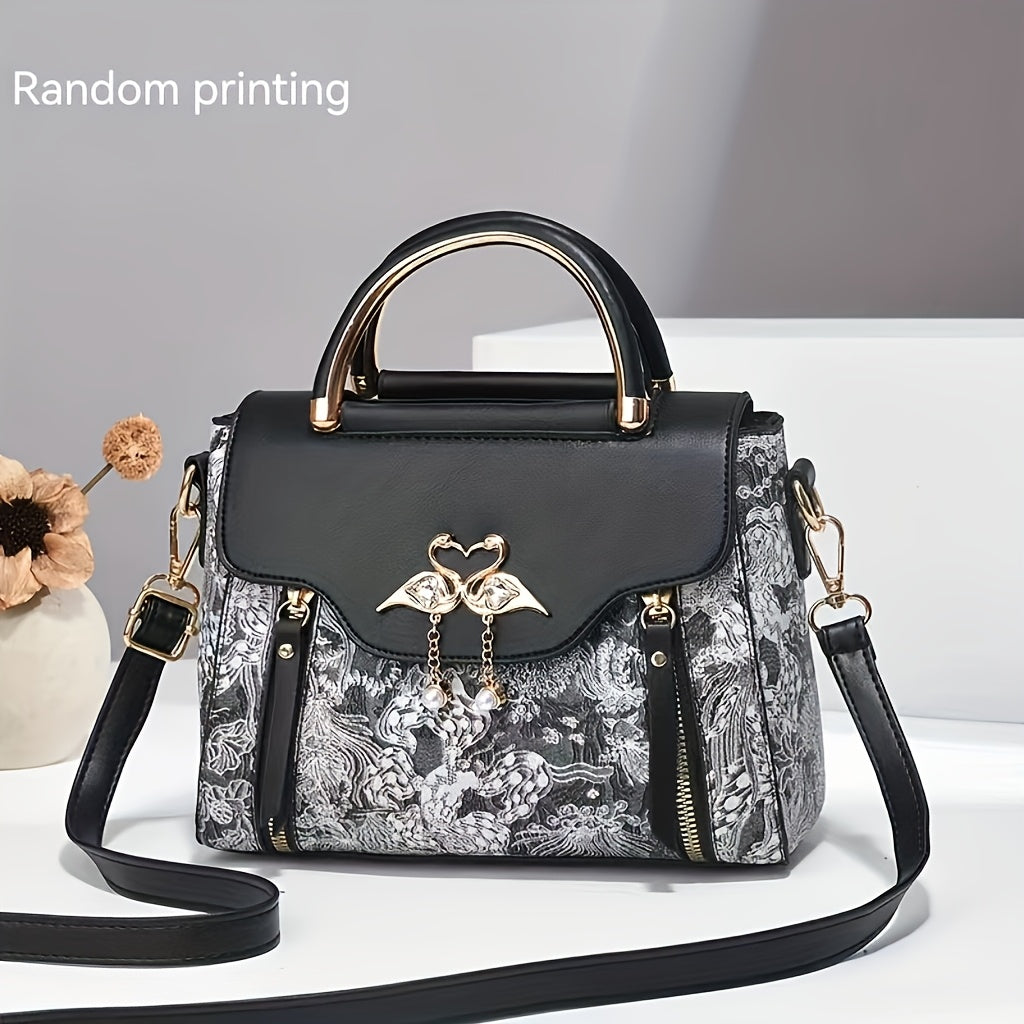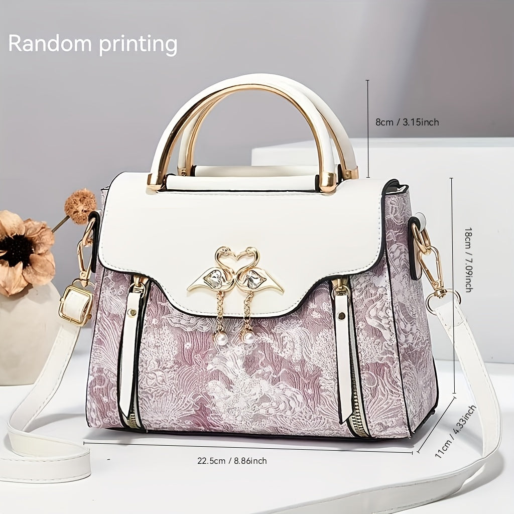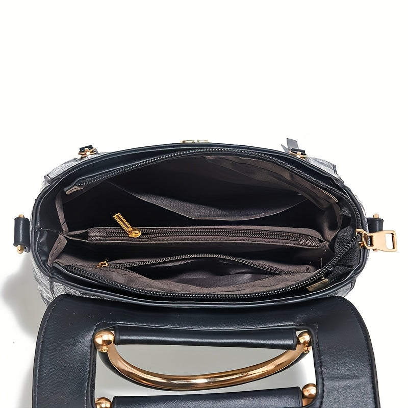 Elegant Handbag for Wo, Geometric Print, Multi-Layered Fashion Handbag with Zipper Closure, Polyester Lined, Edge Paint Detail, Versatile for Various Occasions - Blue/White/Pink/Black
