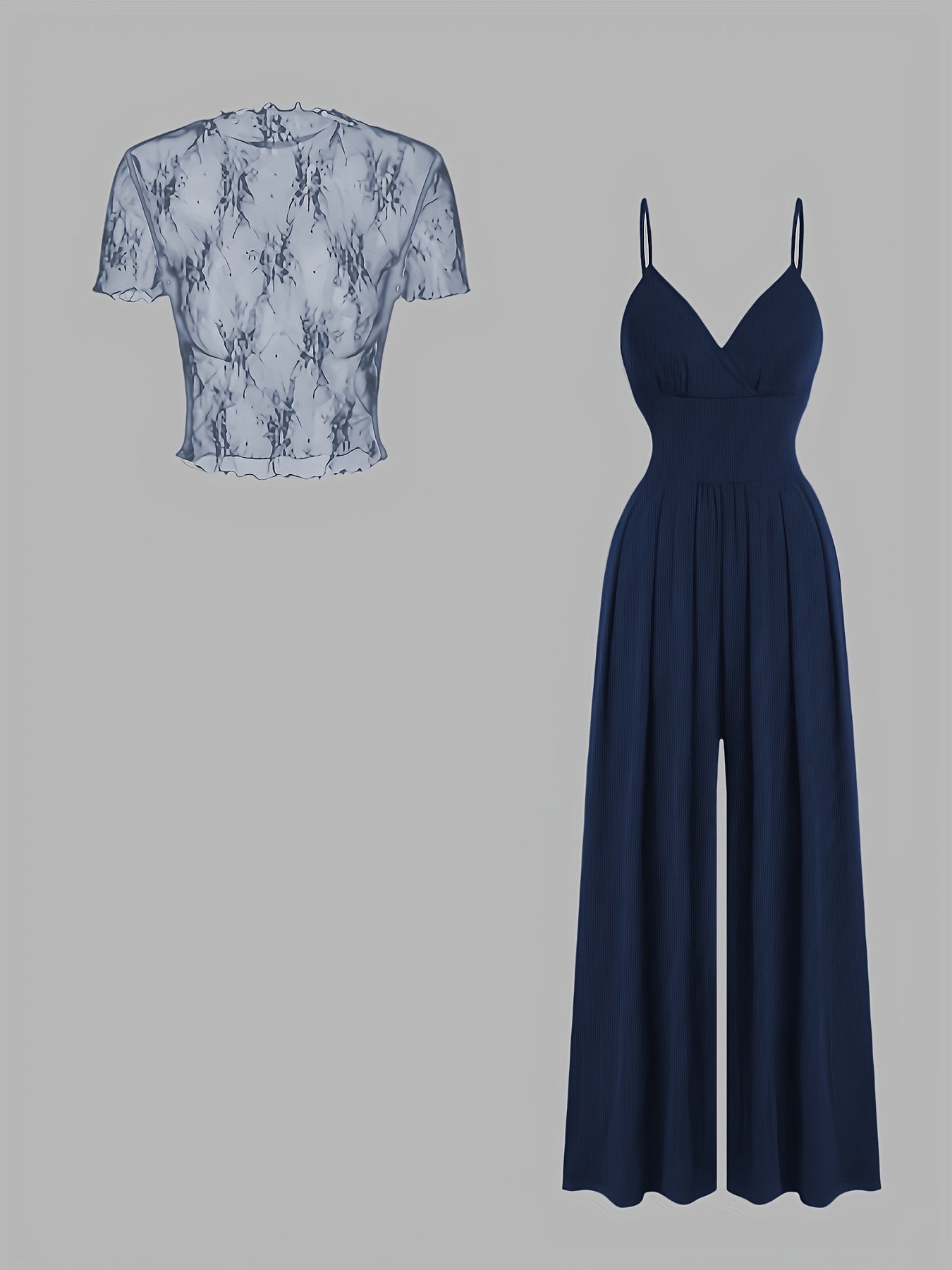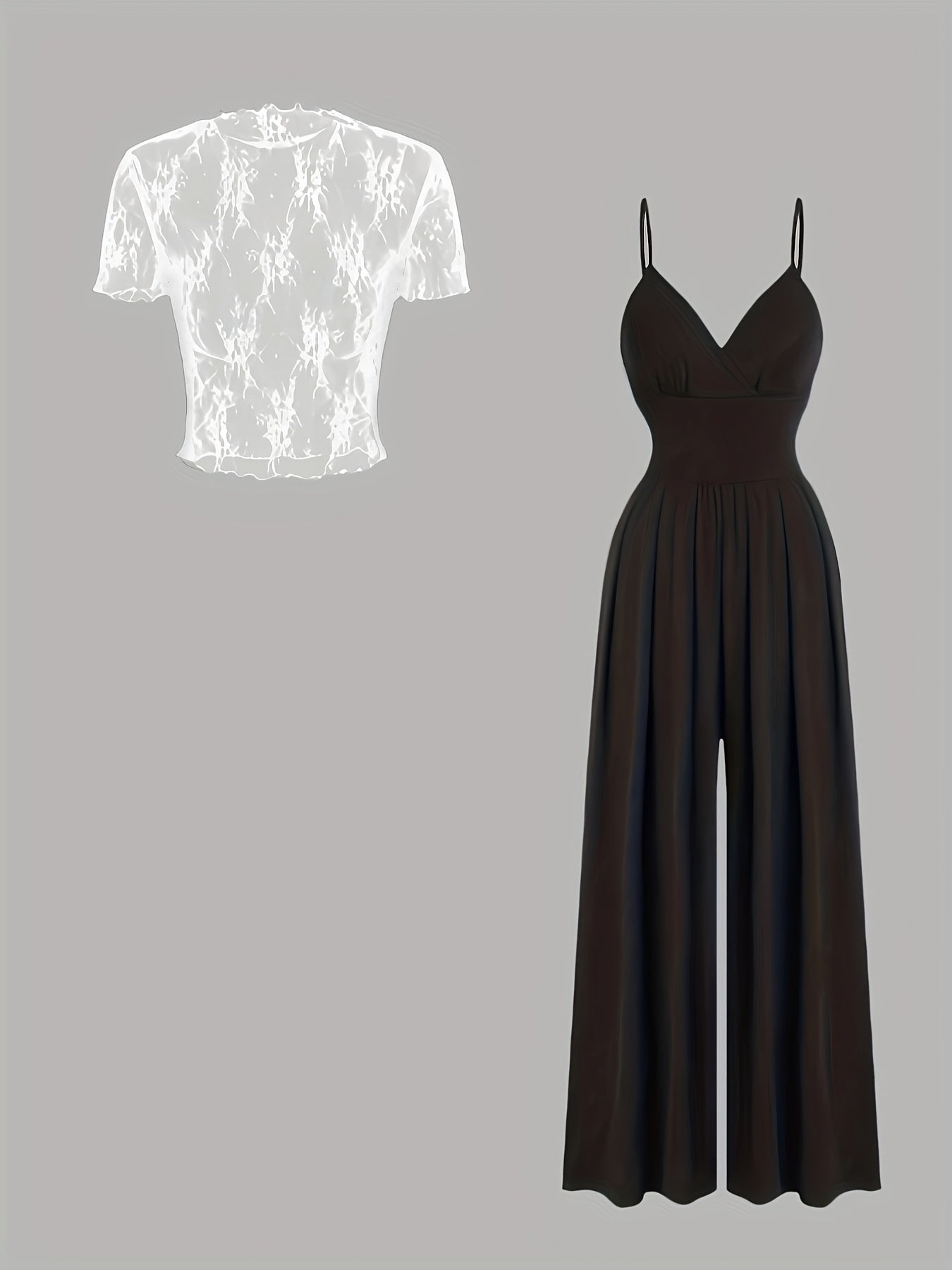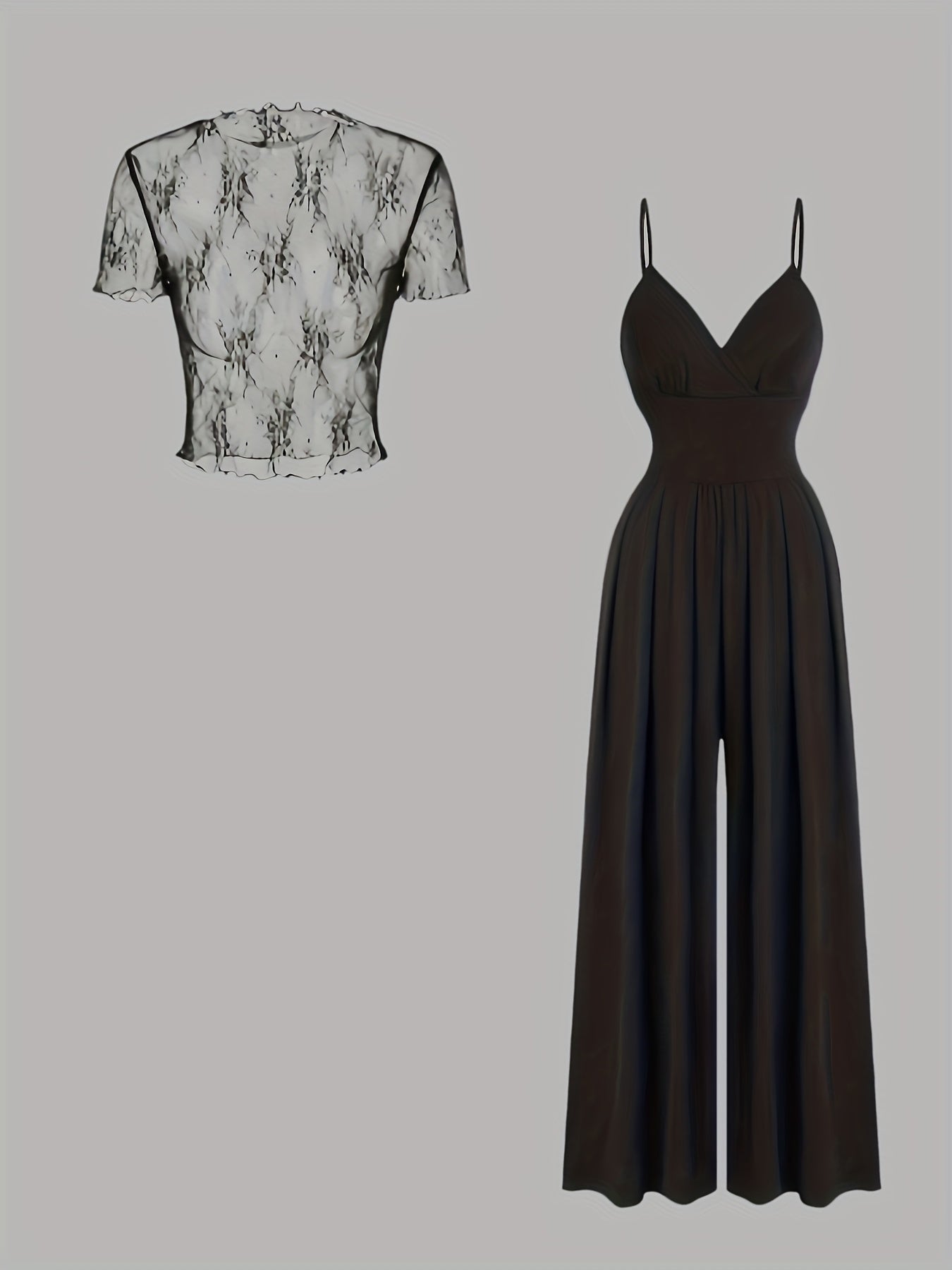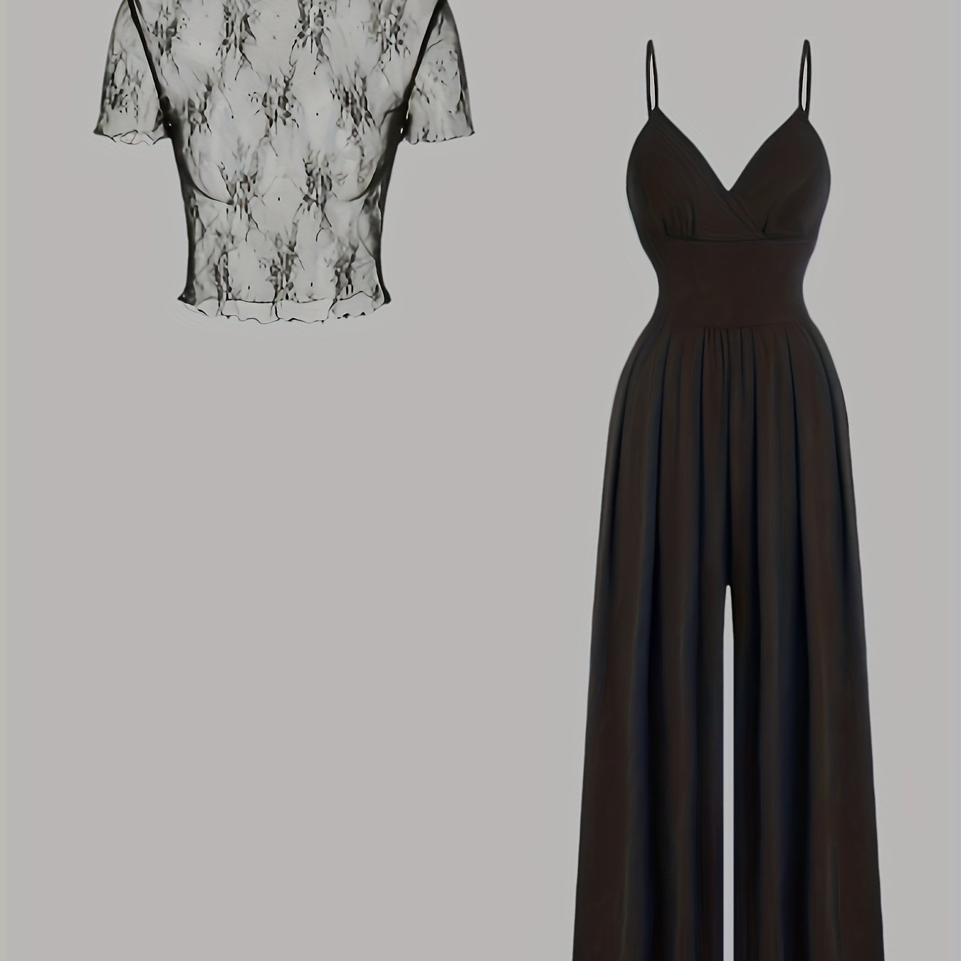Elegant Mesh Long Sleeve Crop Top & Bodycon Wide-Leg Jumpsuit Set - Chic V-Neck, Ruched Detail, Black Mesh Blouse with Spaghetti Straps, Wide Leg Pants for Spring/Summer, Women'S Fashion, Clothing | Relaxed Fit | Chic Desig