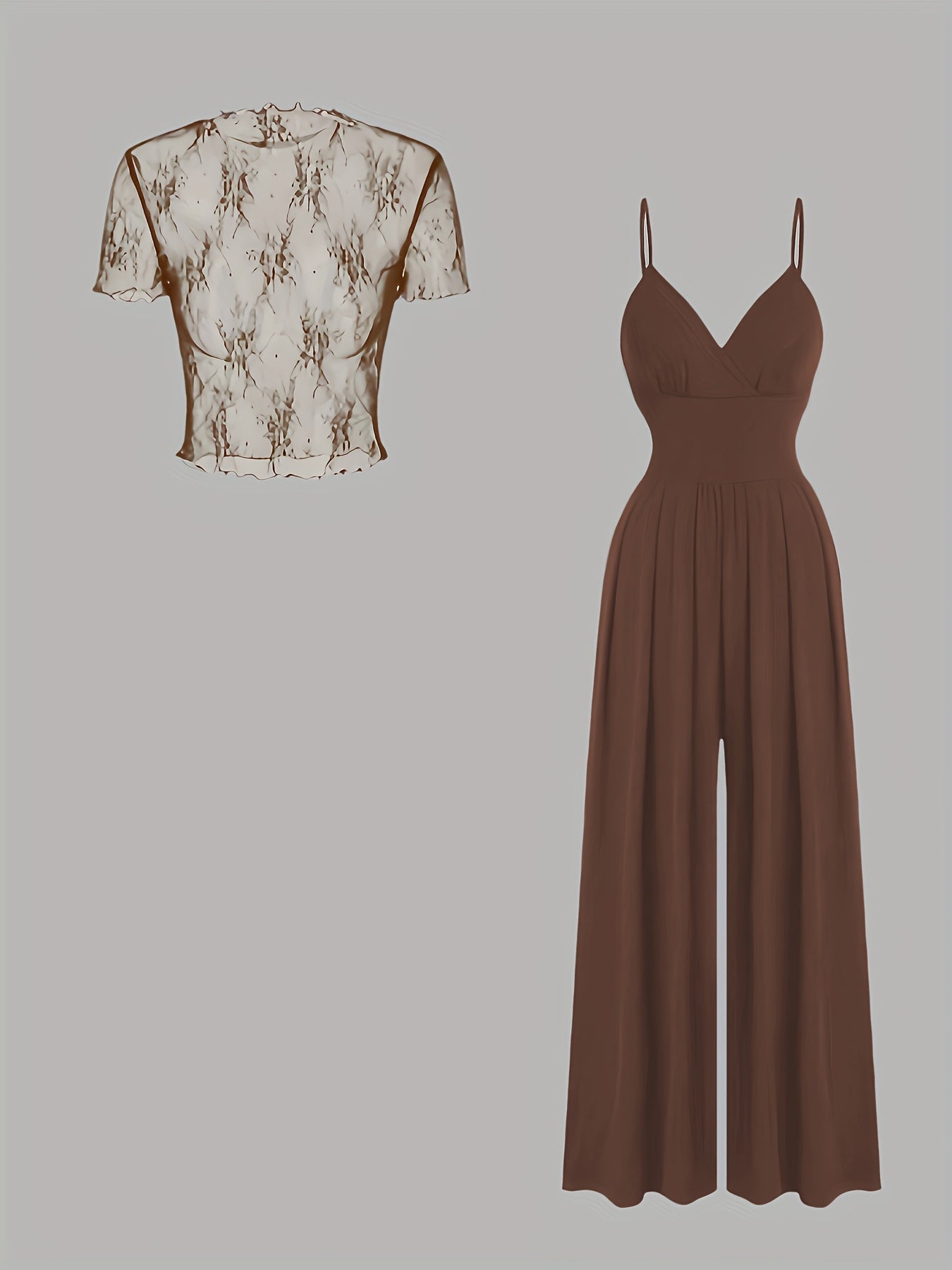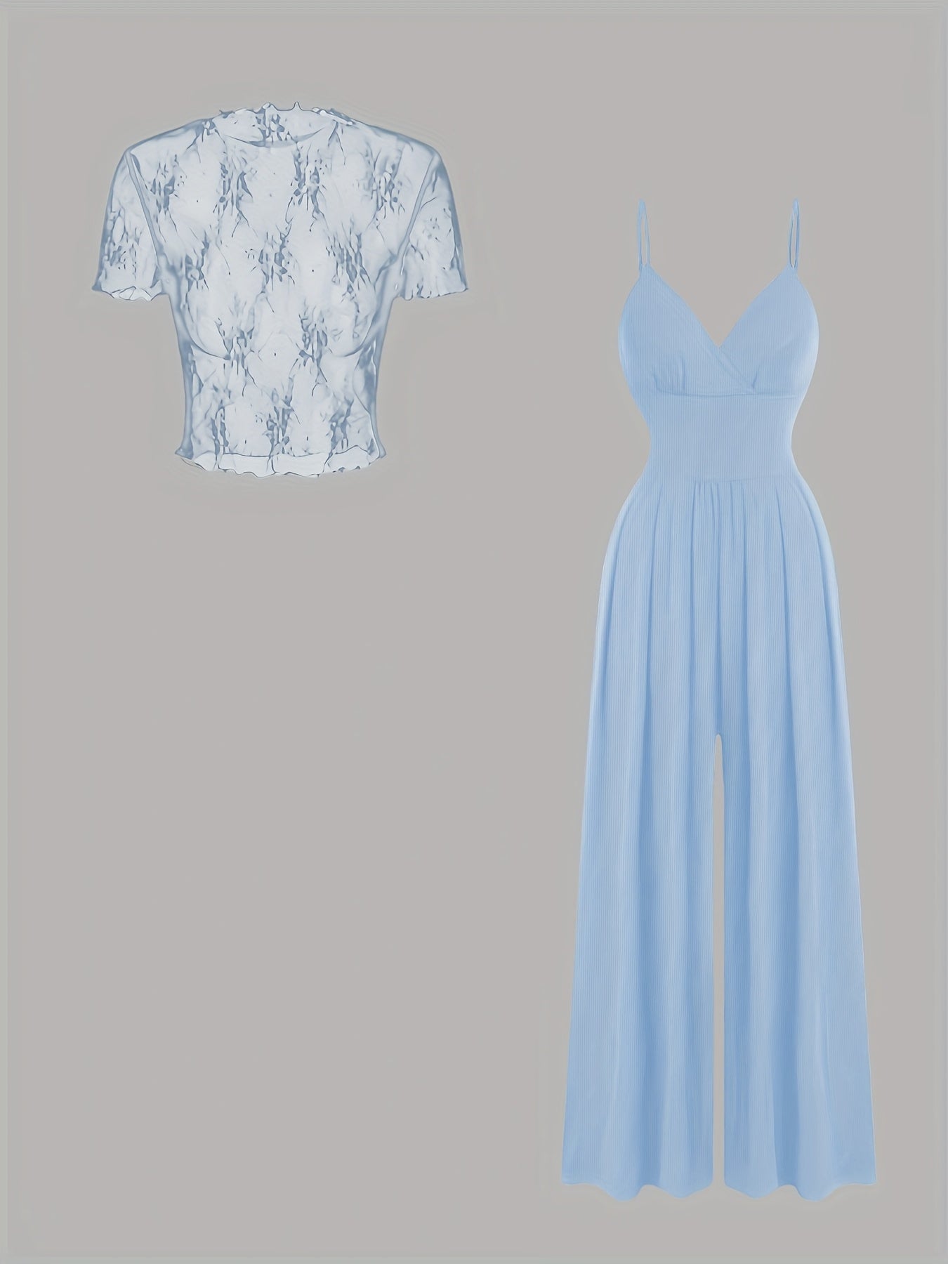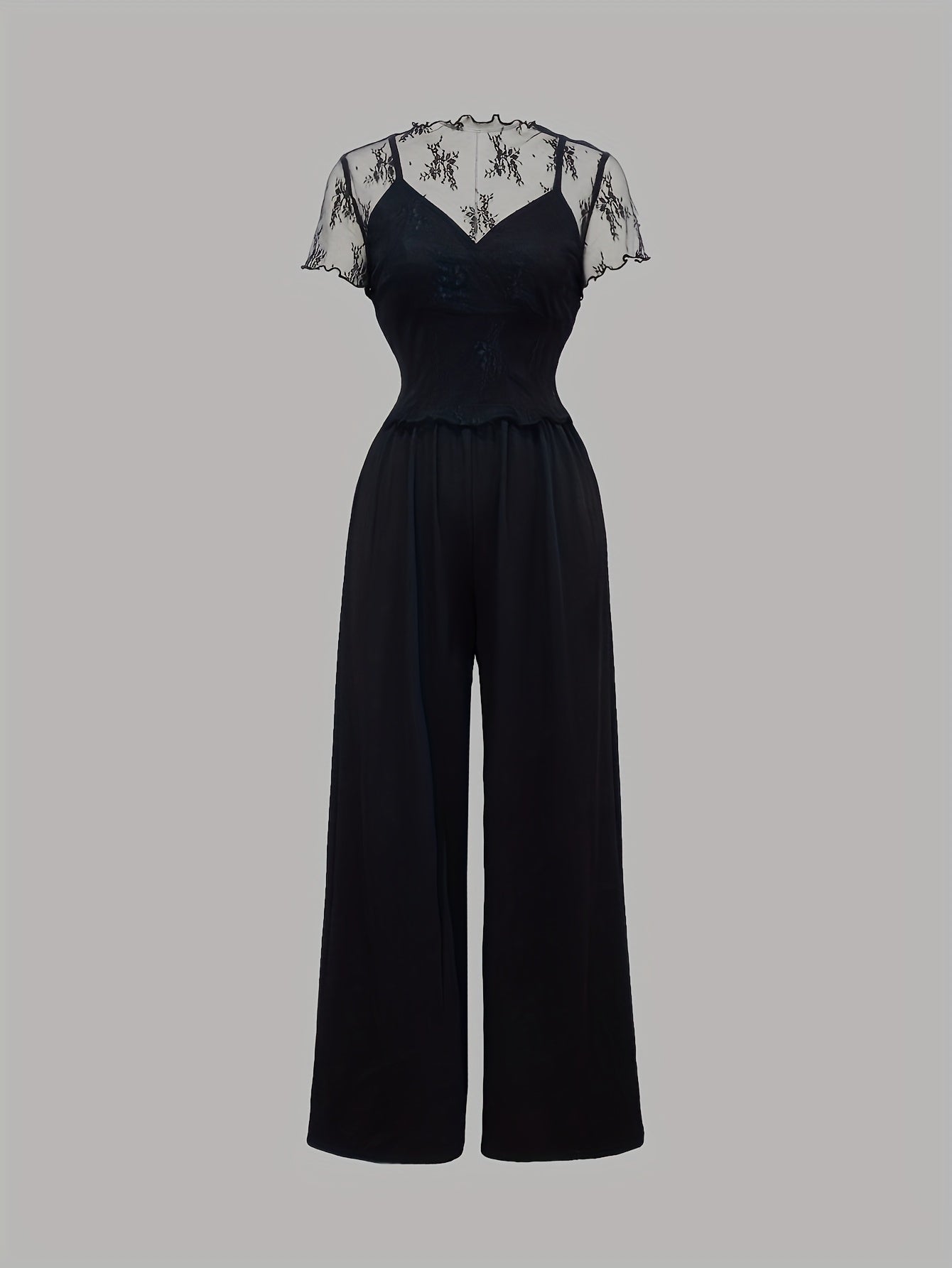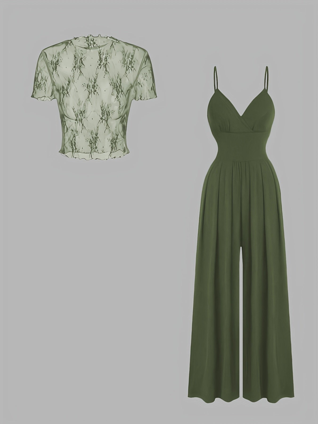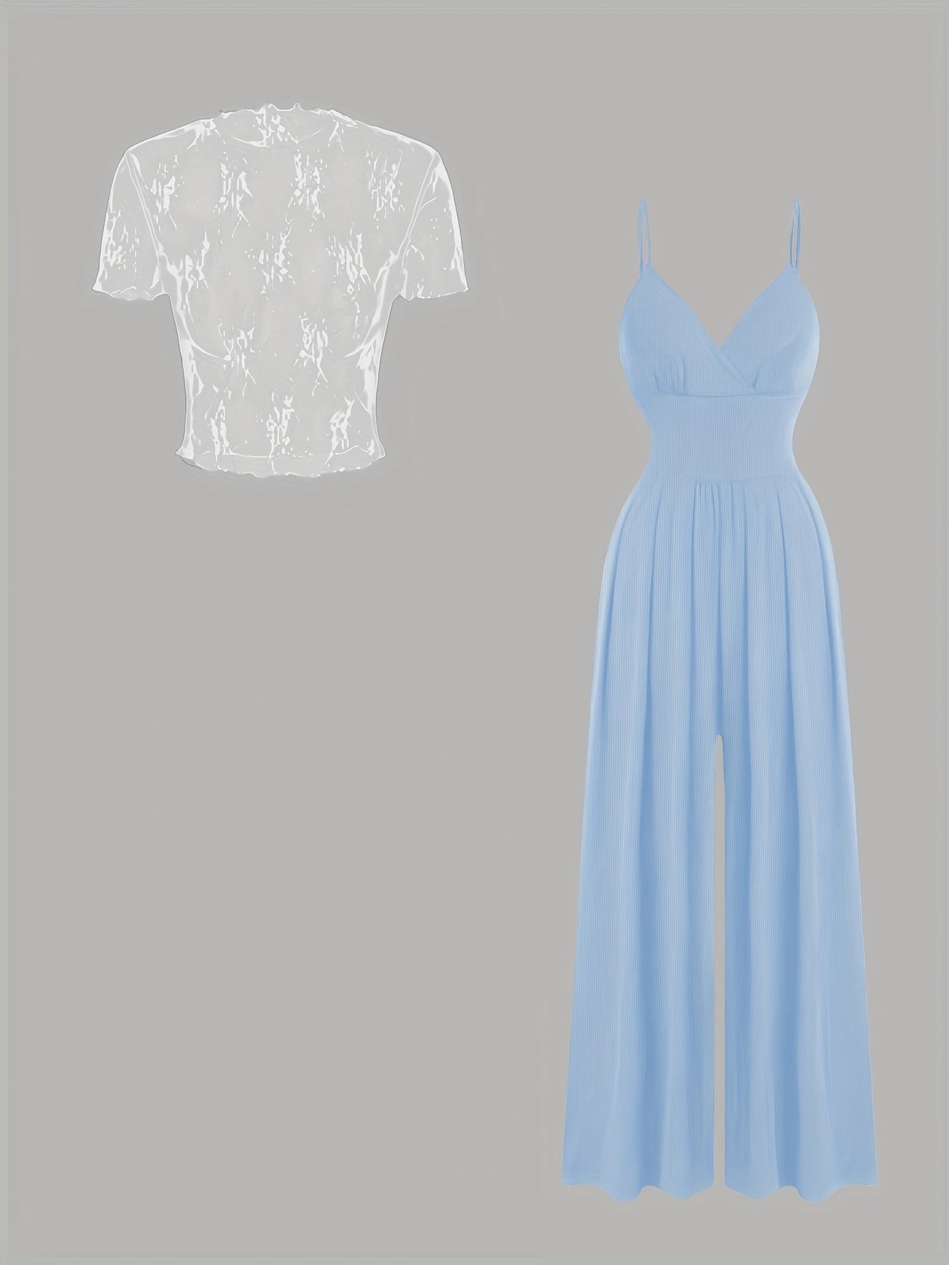 Elegant Mesh Long Sleeve Crop Top & Bodycon Wide-Leg Jumpsuit Set - Chic V-Neck, Ruched Detail, Black Mesh Blouse with Spaghetti Straps, Wide Leg Pants for Spring/Summer, Women'S Fashion, Clothing | Relaxed Fit | Chic Desig