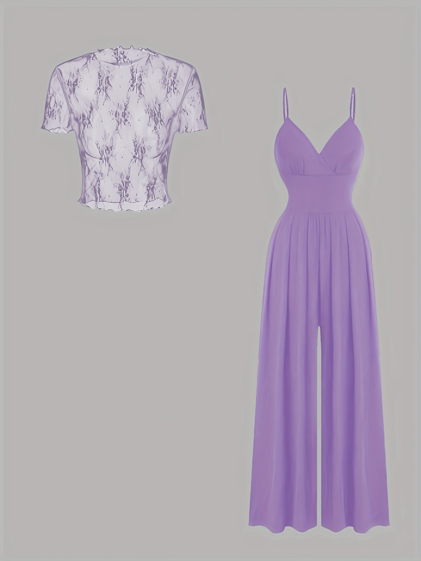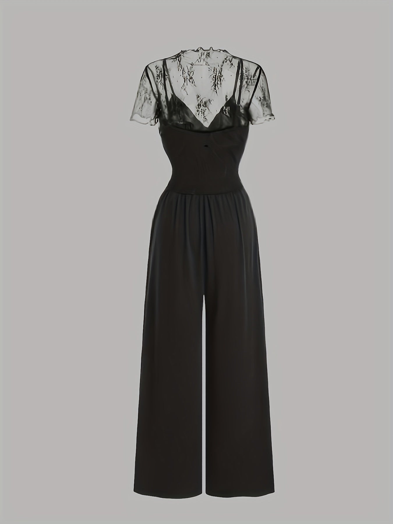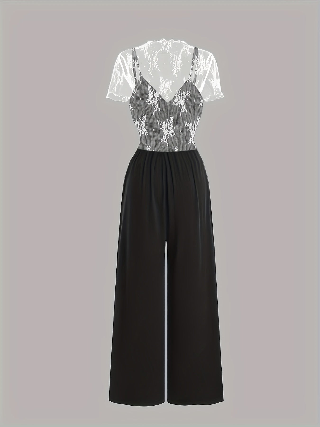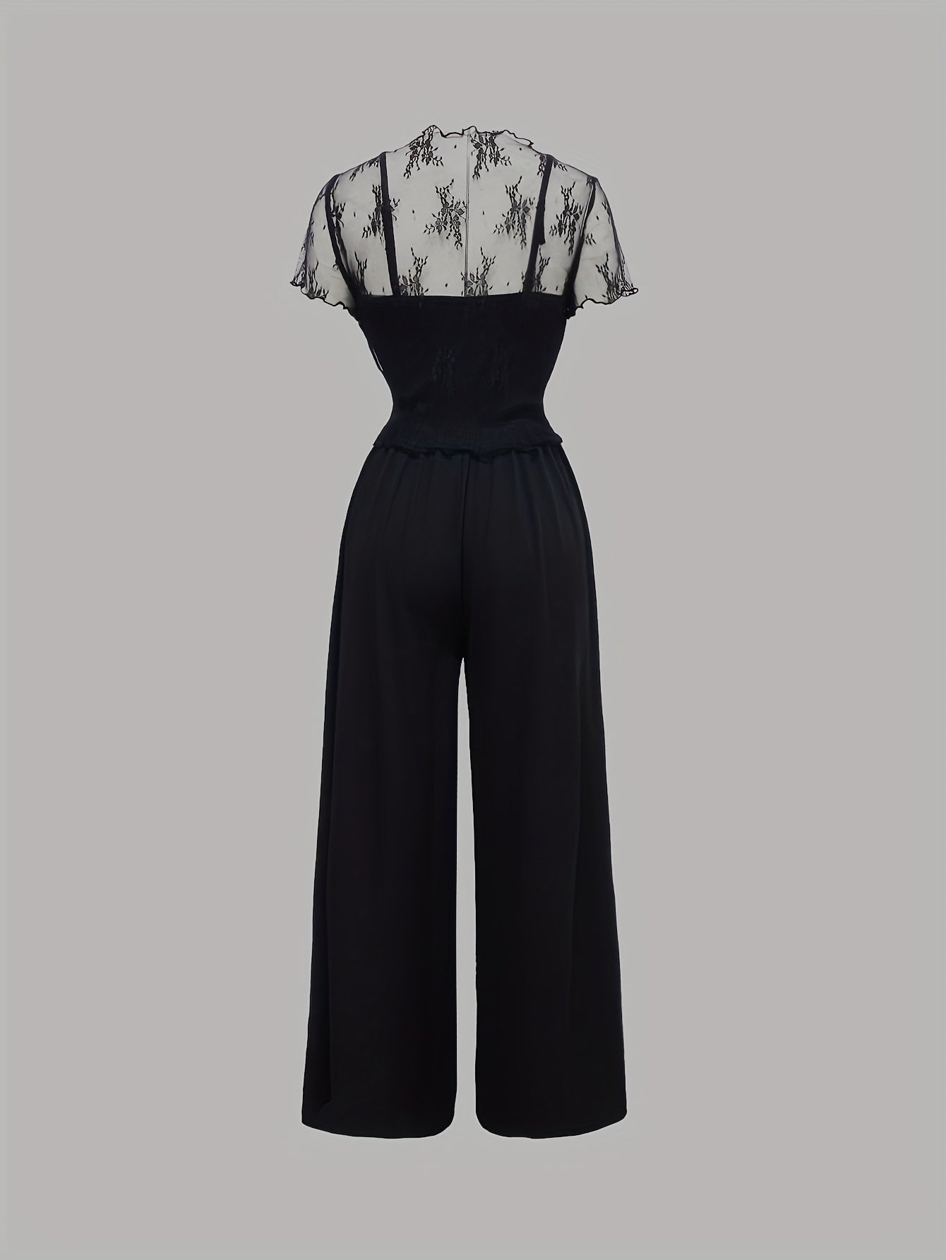 Elegant Mesh Long Sleeve Crop Top & Bodycon Wide-Leg Jumpsuit Set - Chic V-Neck, Ruched Detail, Black Mesh Blouse with Spaghetti Straps, Wide Leg Pants for Spring/Summer, Women'S Fashion, Clothing | Relaxed Fit | Chic Desig