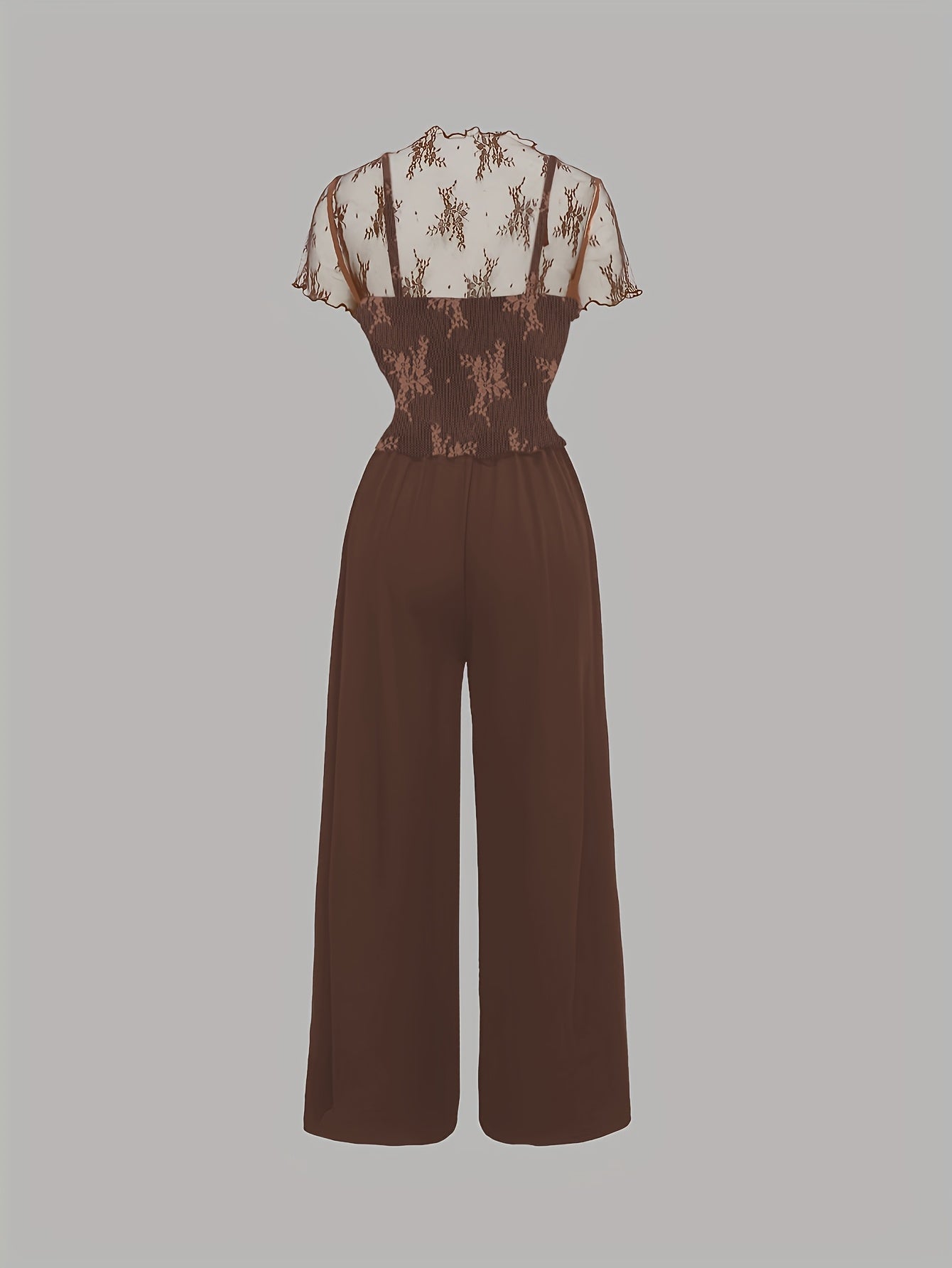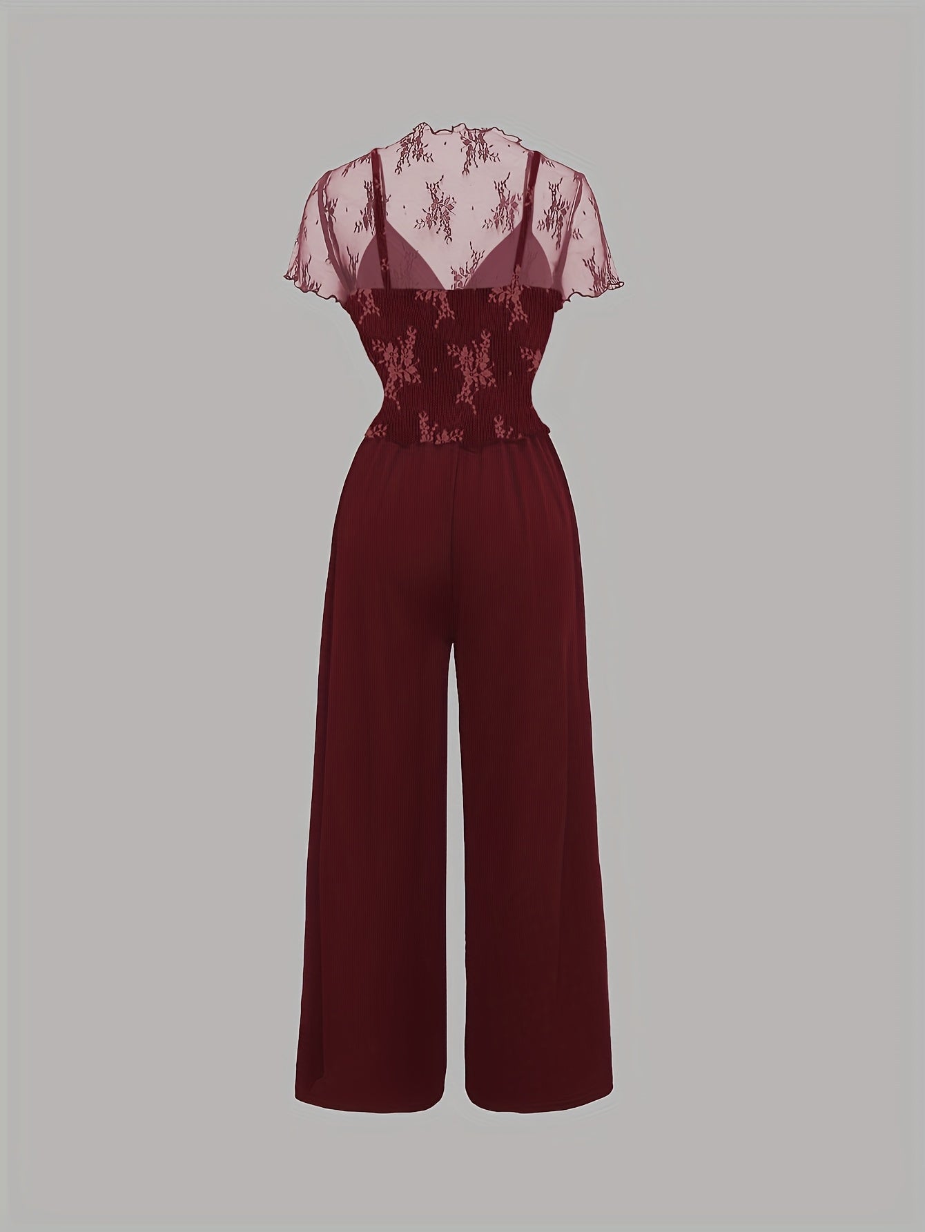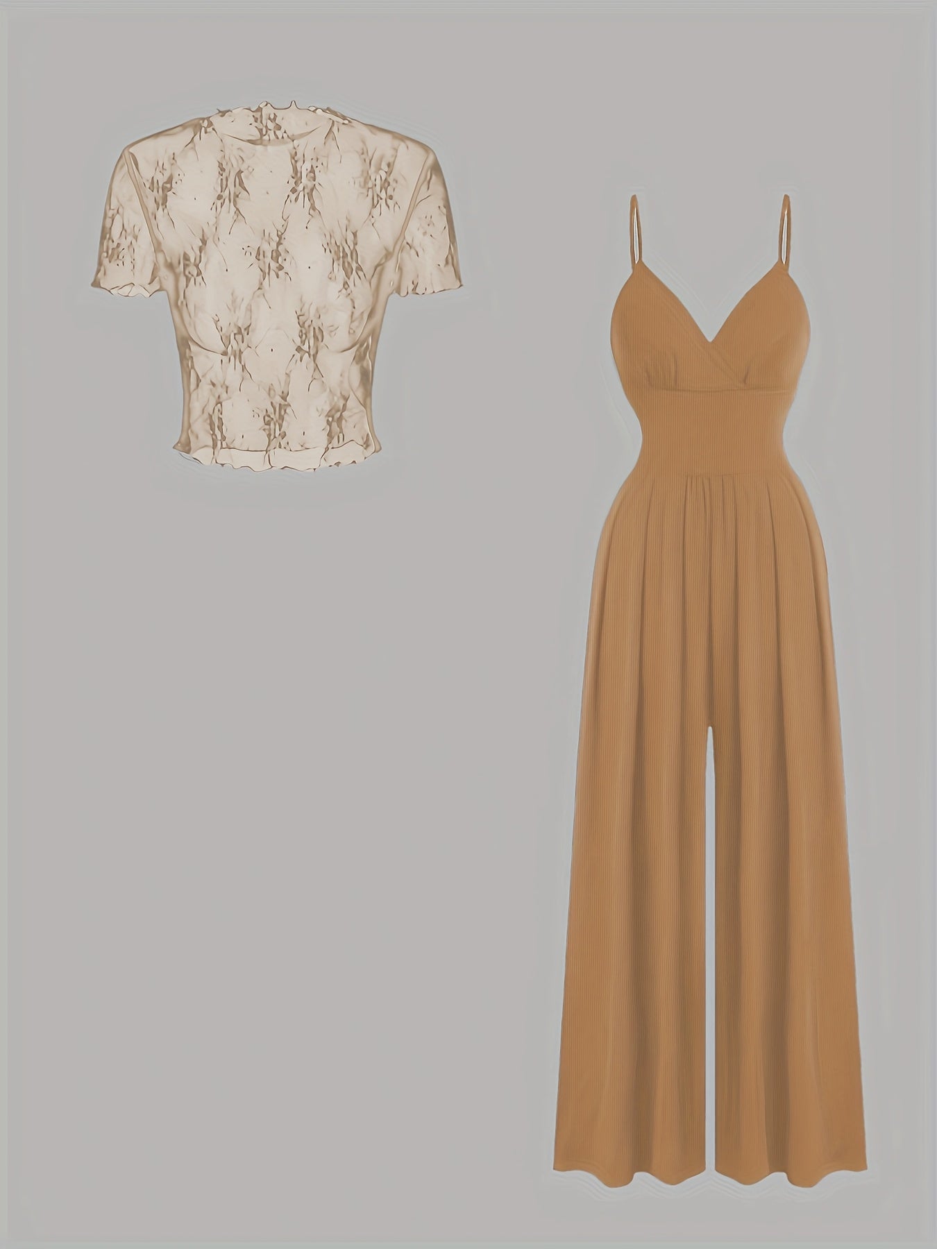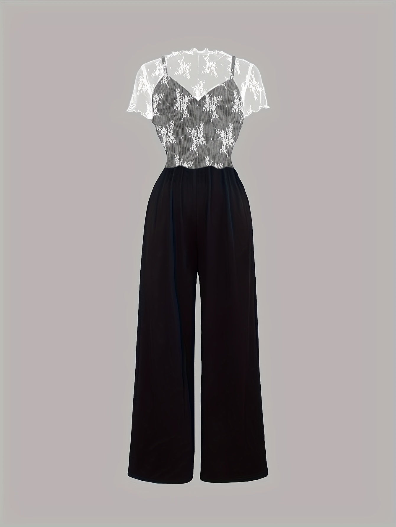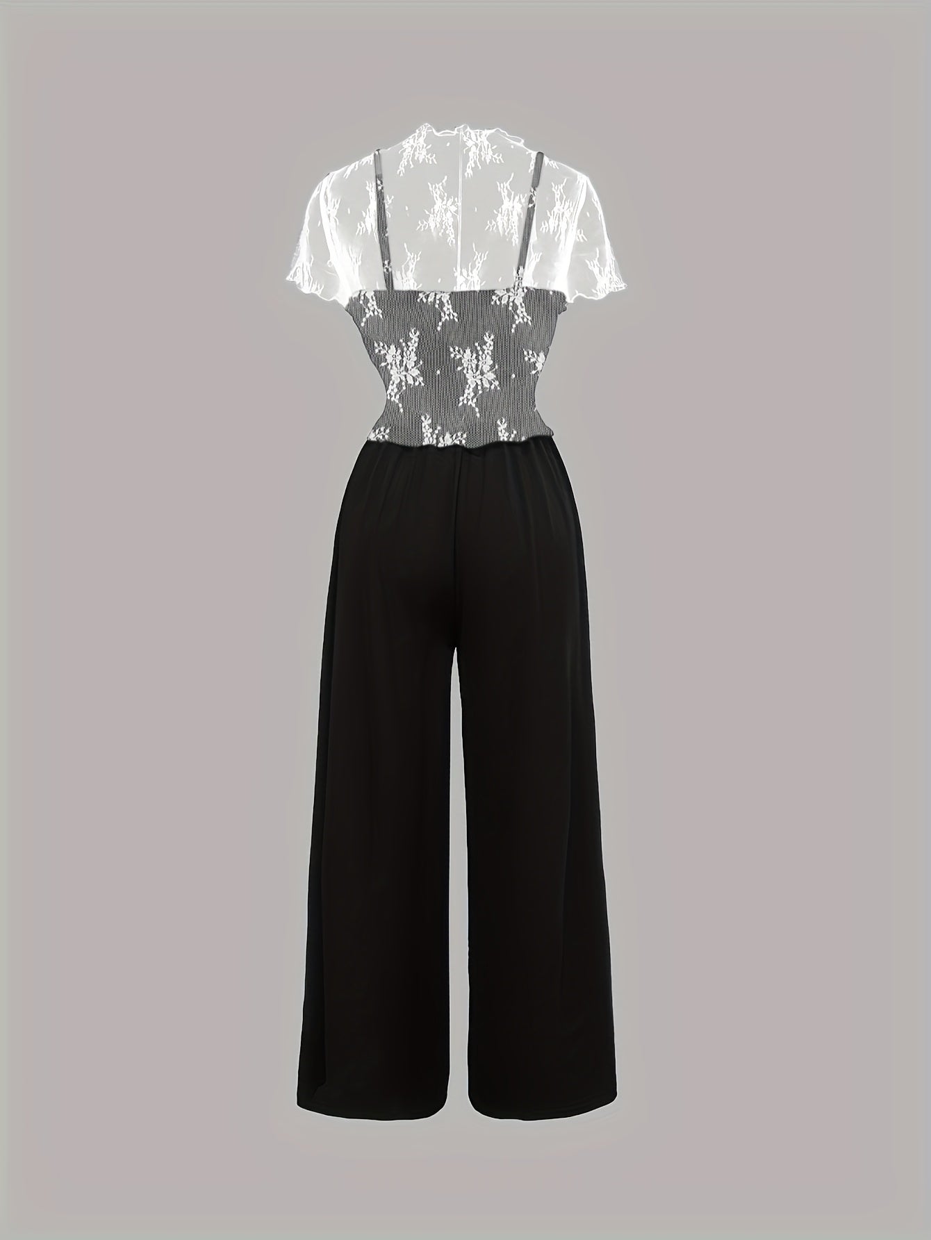 Elegant Mesh Long Sleeve Crop Top & Bodycon Wide-Leg Jumpsuit Set - Chic V-Neck, Ruched Detail, Black Mesh Blouse with Spaghetti Straps, Wide Leg Pants for Spring/Summer, Women'S Fashion, Clothing | Relaxed Fit | Chic Desig