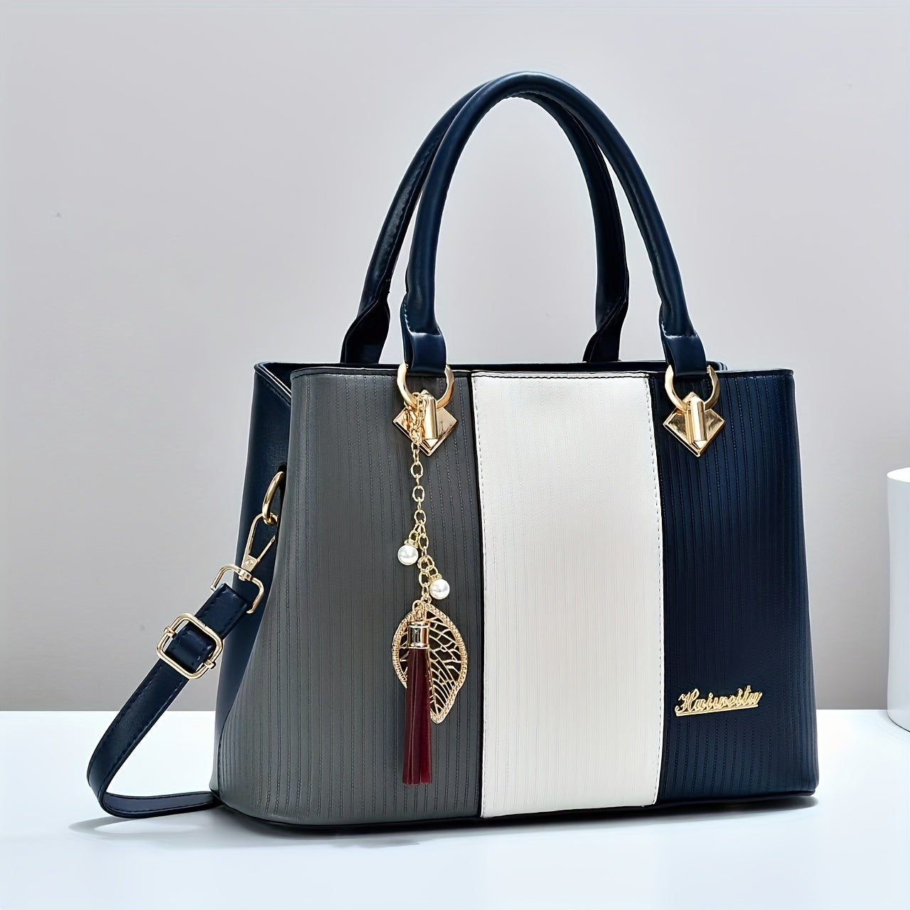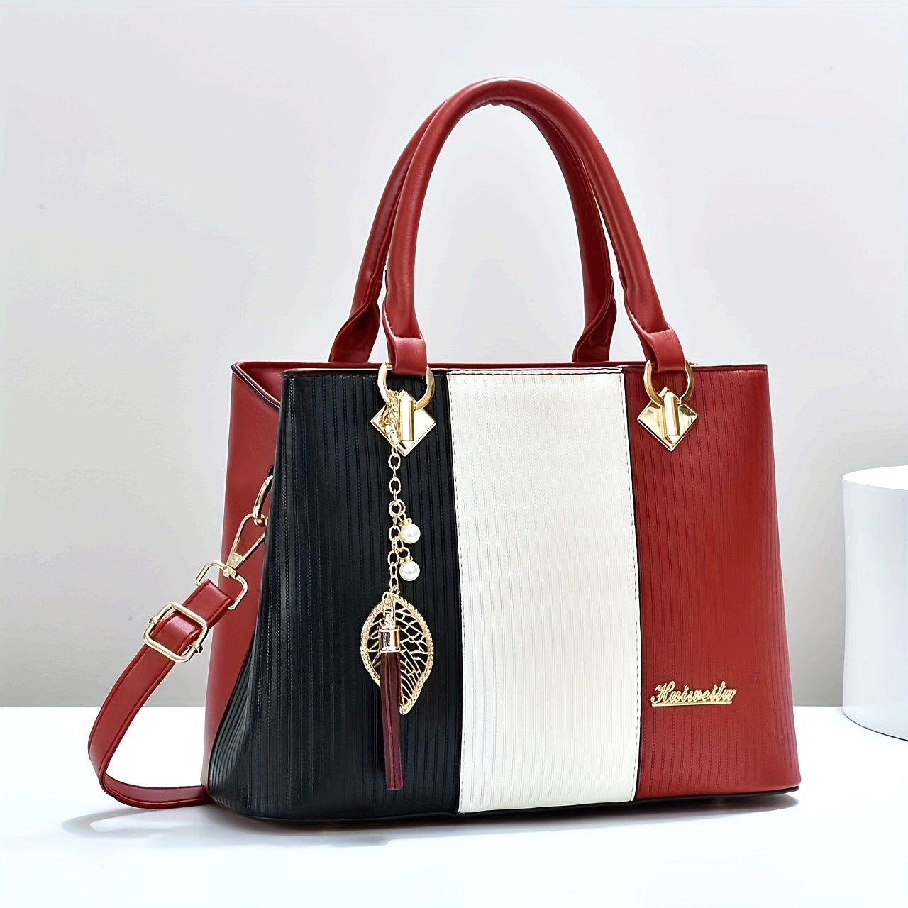 Elegant Red & Black Striped Handbag with Golden Accents - Adjustable Shoulder Strap, Zipper Closure, Polyester Lining, Stylish Mom & Everyday Bag, Everyday Handbag|Striped Pattern Tote|Durable Handle Tote