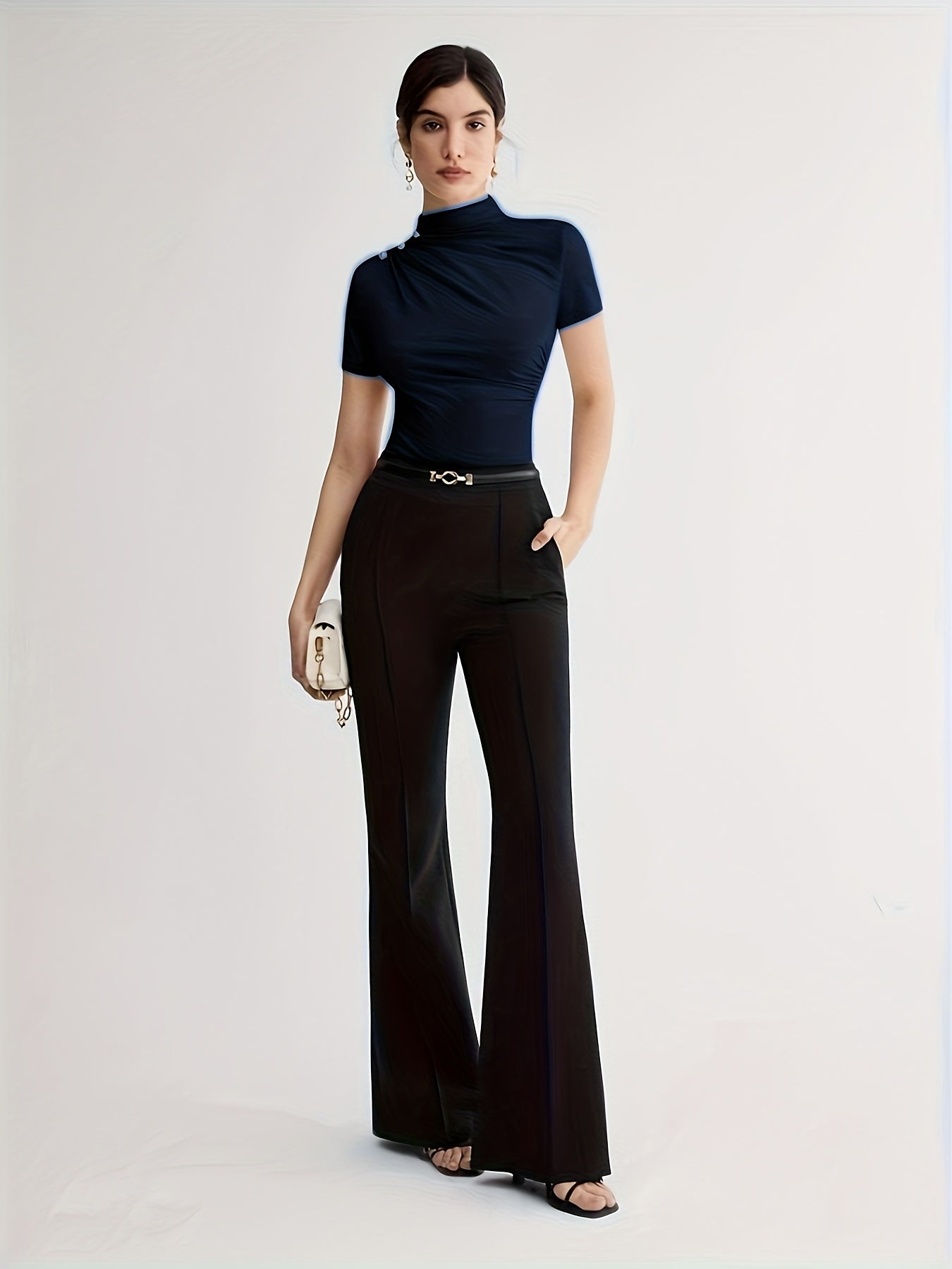 Elegant White Short Sleeve Turtleneck Top with Button Detail - Versatile Summer Blouse for Women, Casual Attire|Minimalist Style|Sleek Fit