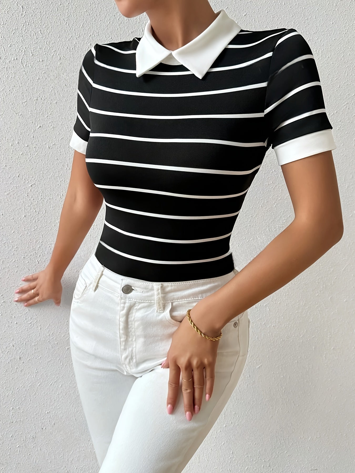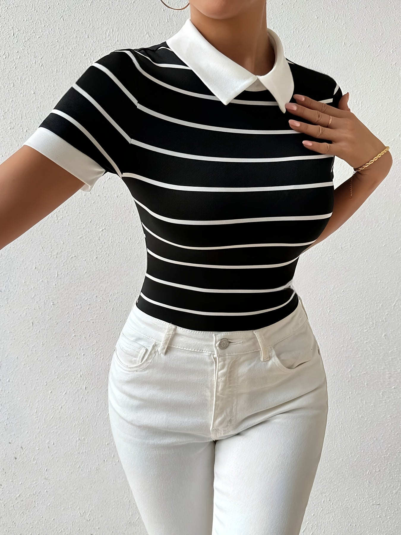 Elegant Women's Black & White Striped Short Sleeve T-Shirt with Chic Collar - Polyester Blend, Machine Washable, Perfect for Summer