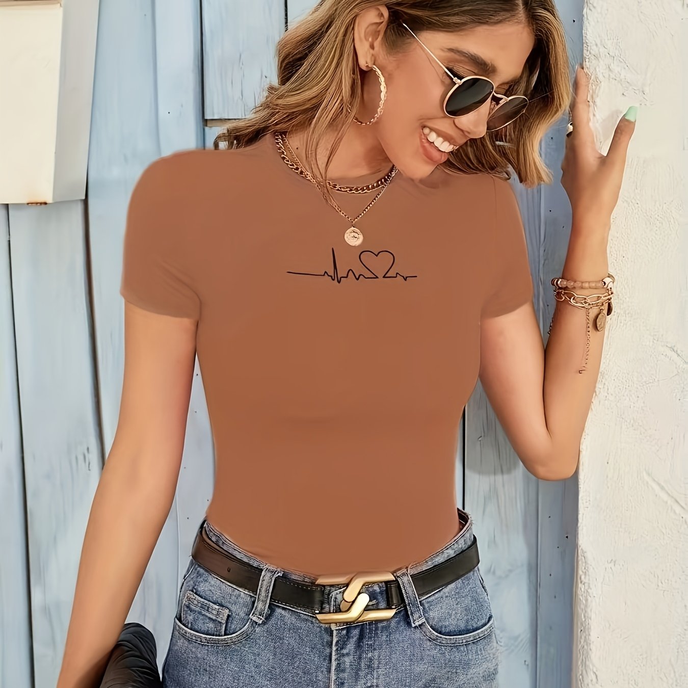 Essnce Women's Elegant Heart Print Short Sleeve Tee - Vibrant Purple, Medium Stretch Round Neck, Machine Washable, All-Season Casual & Dressy Top, Versatile Clothing, Comfortable Fit