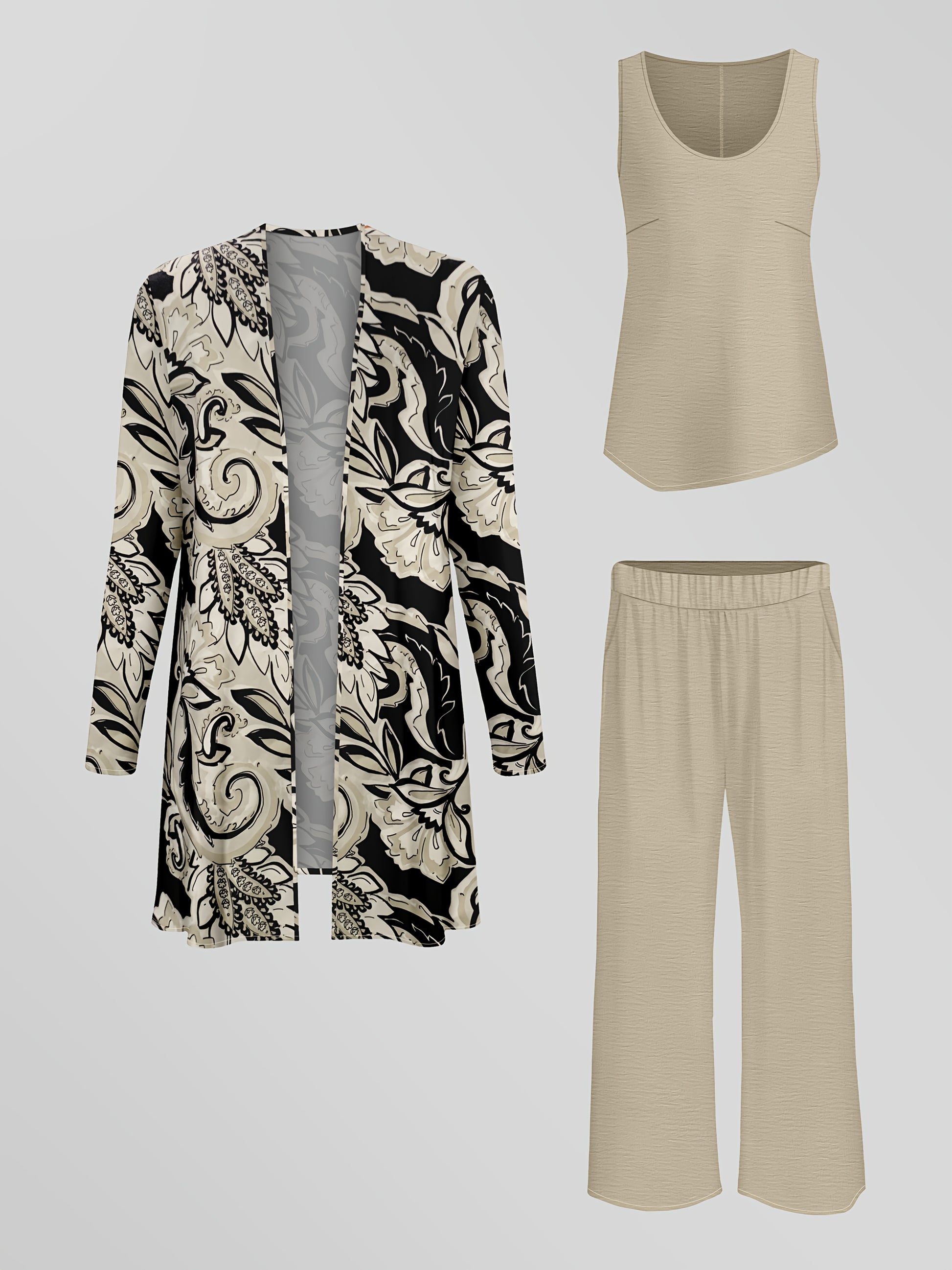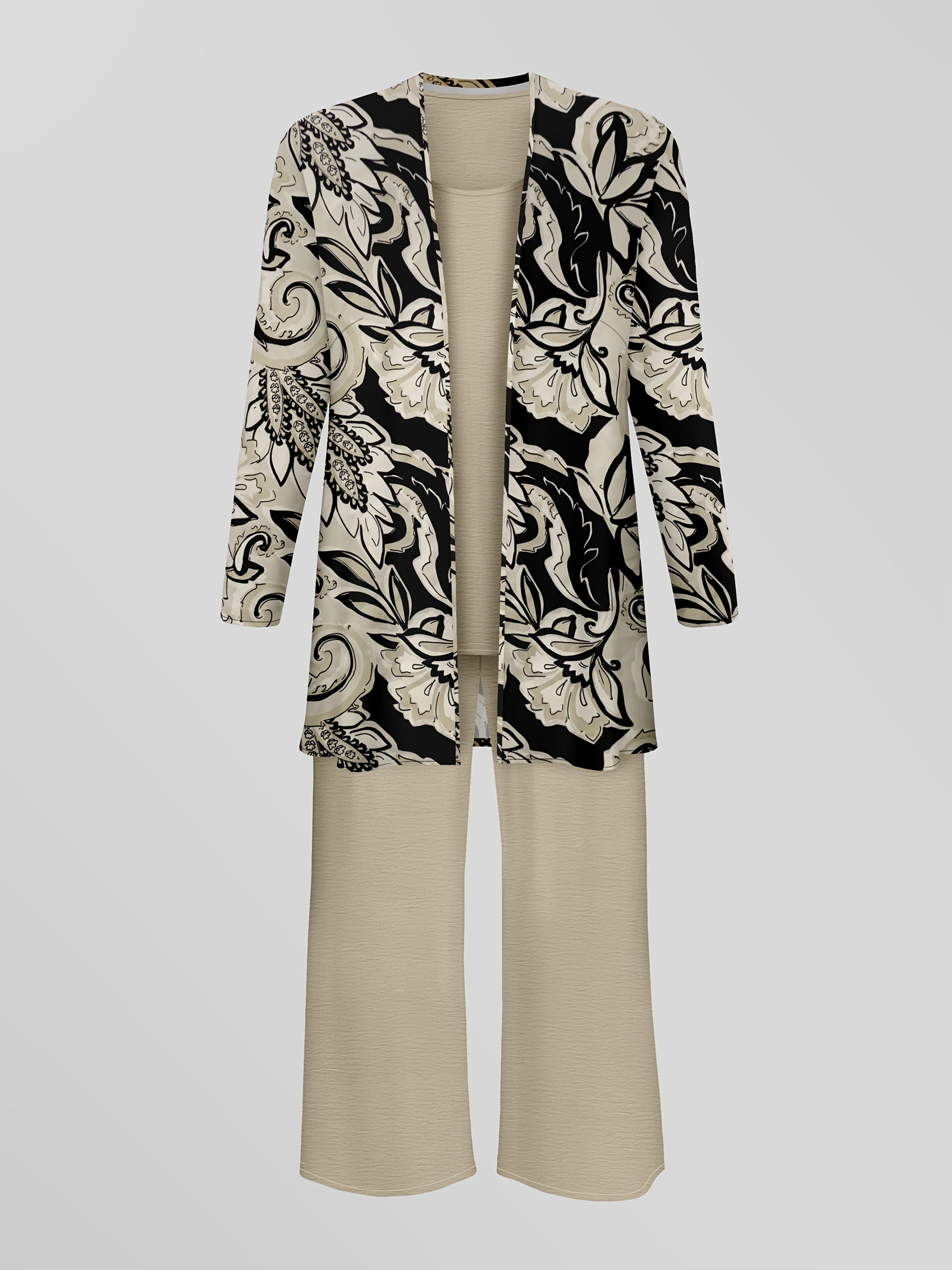 Fashionable and suit, printed long-sleeved cardigan jacket with solid color vest and casual trousers, daily three-piece suit