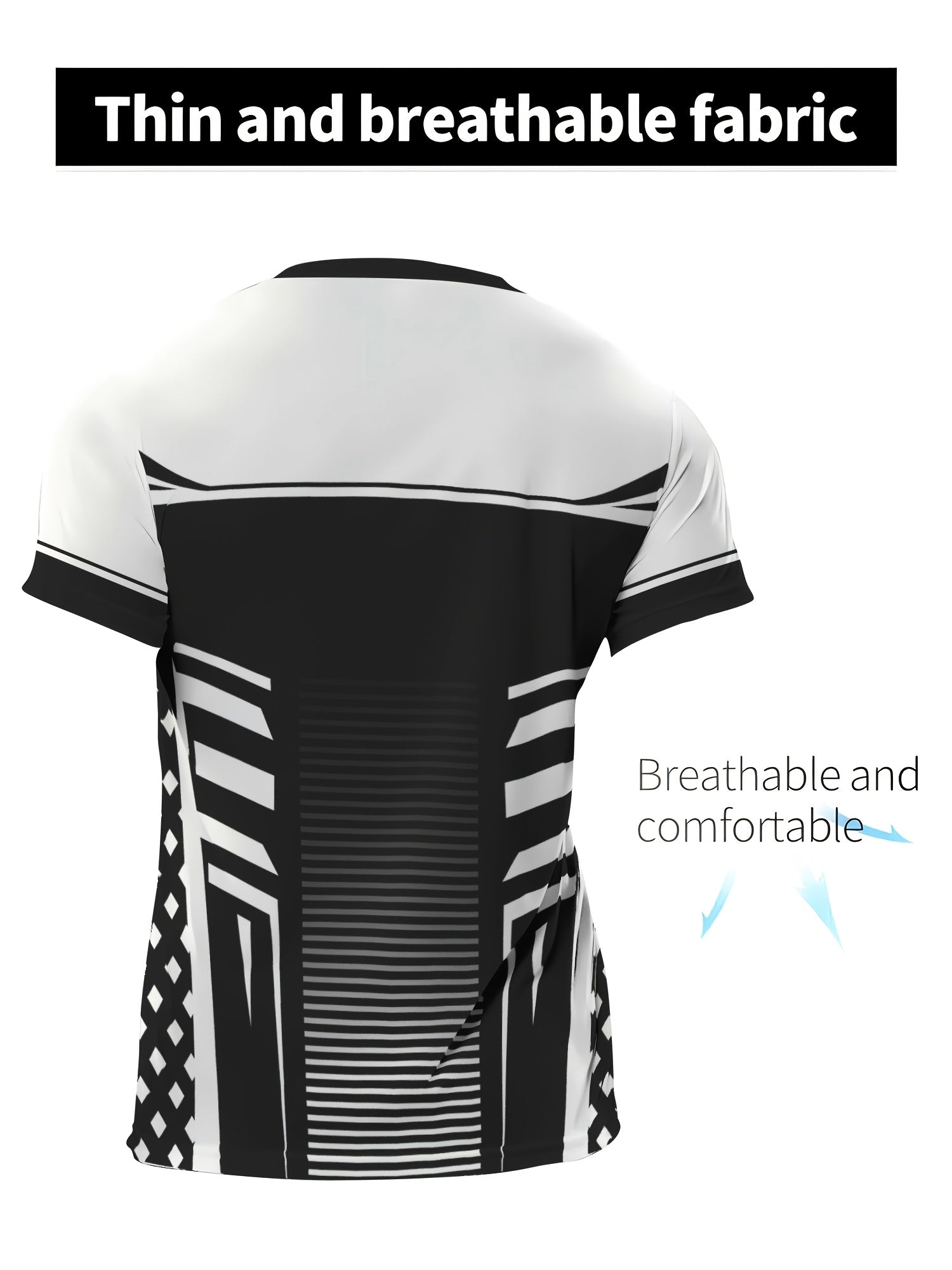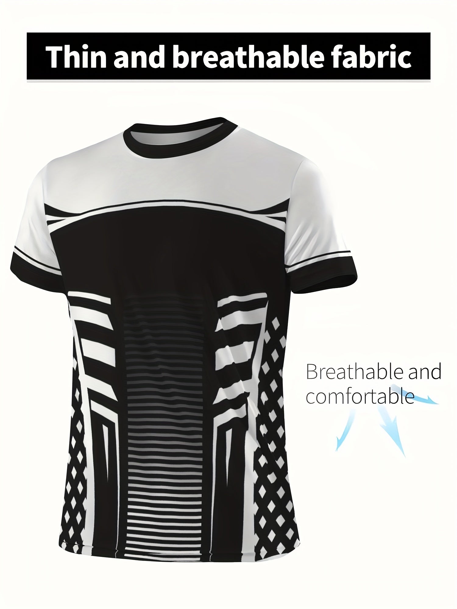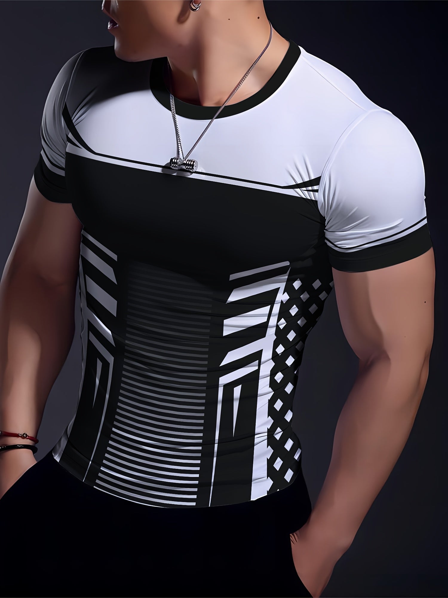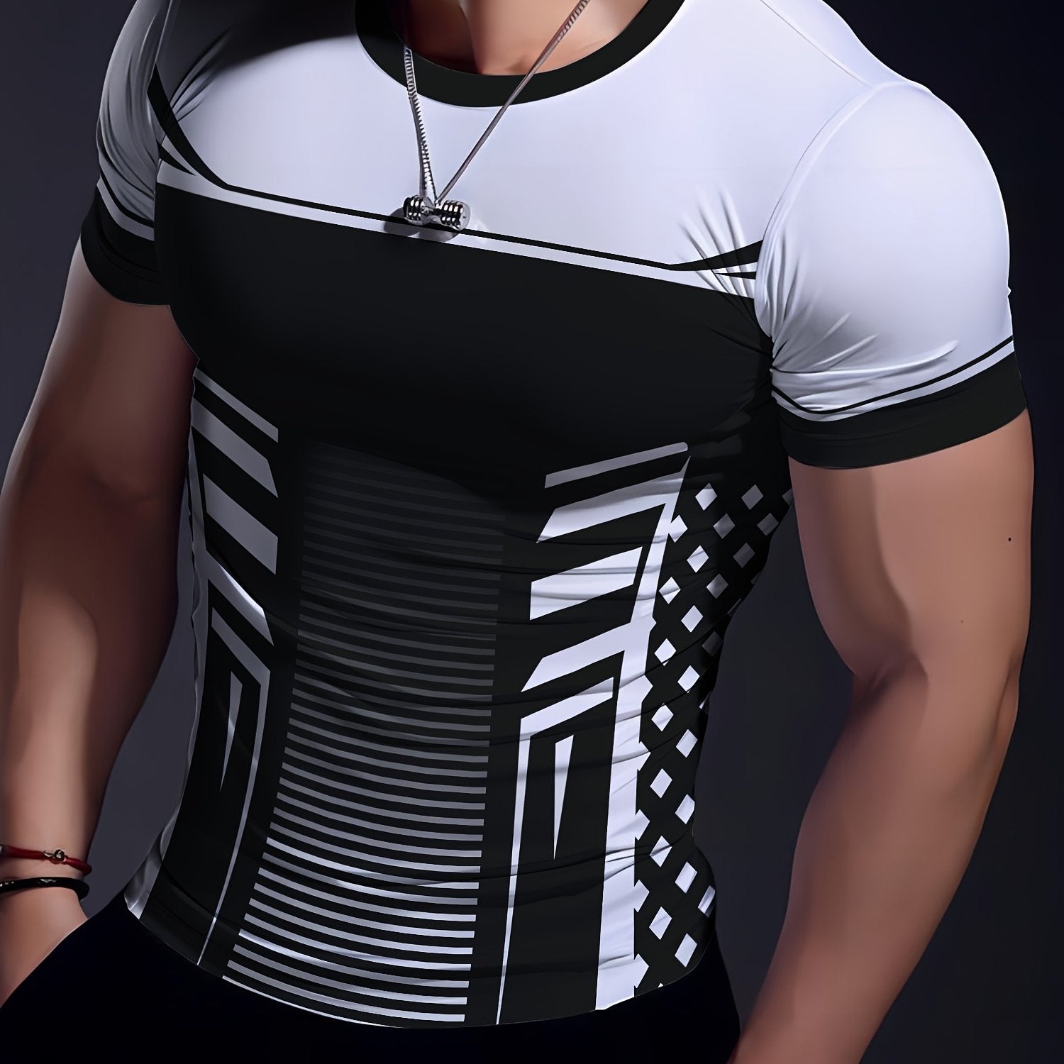 Geometric print high stretch skinny fit short sleeve crew neck T-shirt, quick-drying sports top for summer fitness, training and gym wear