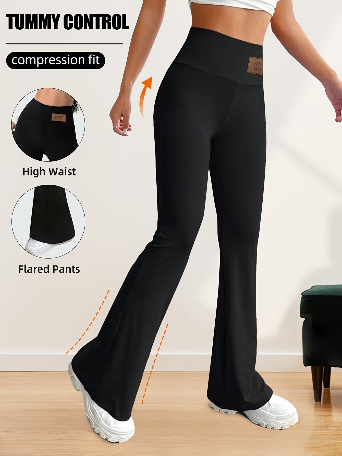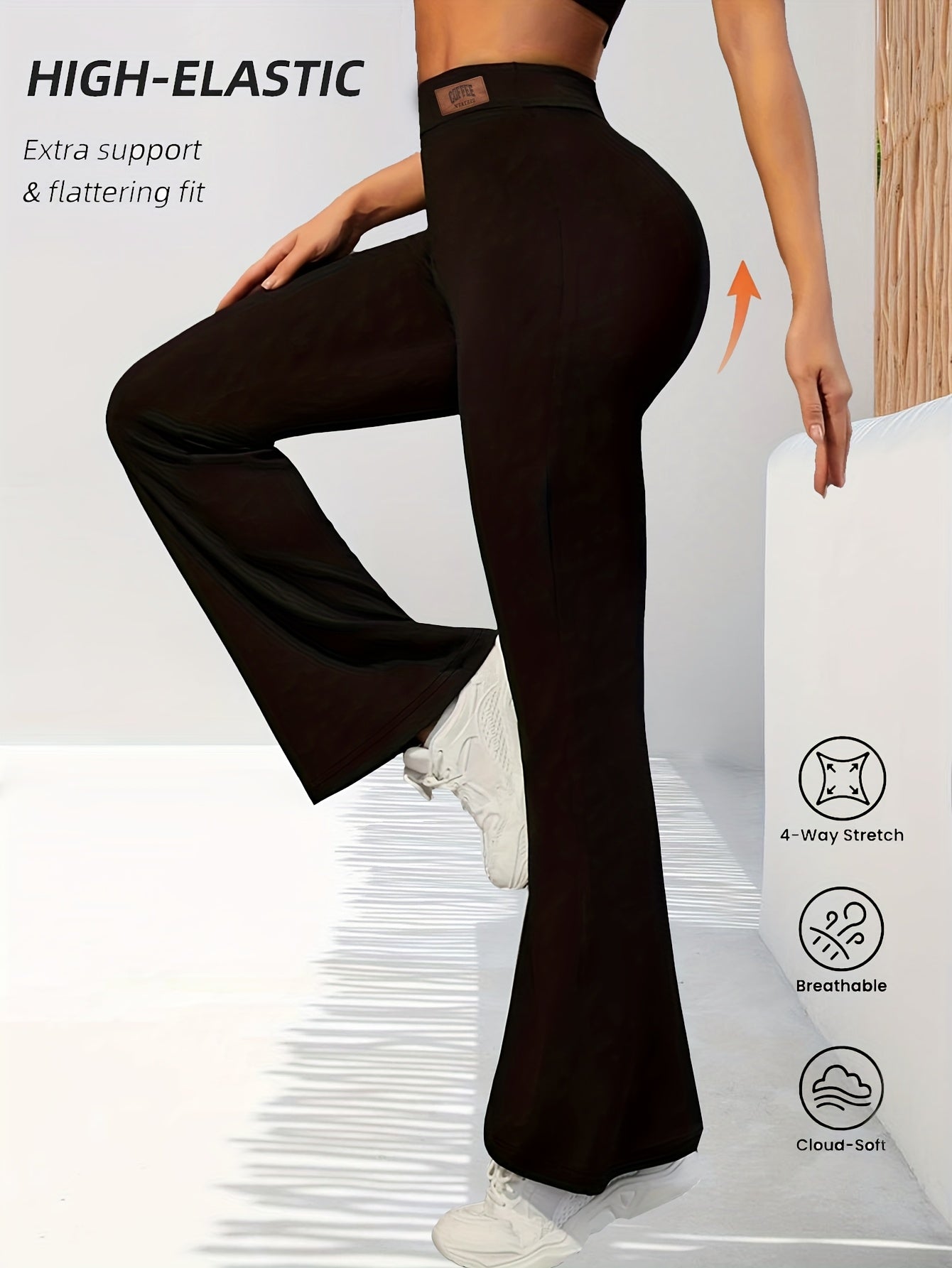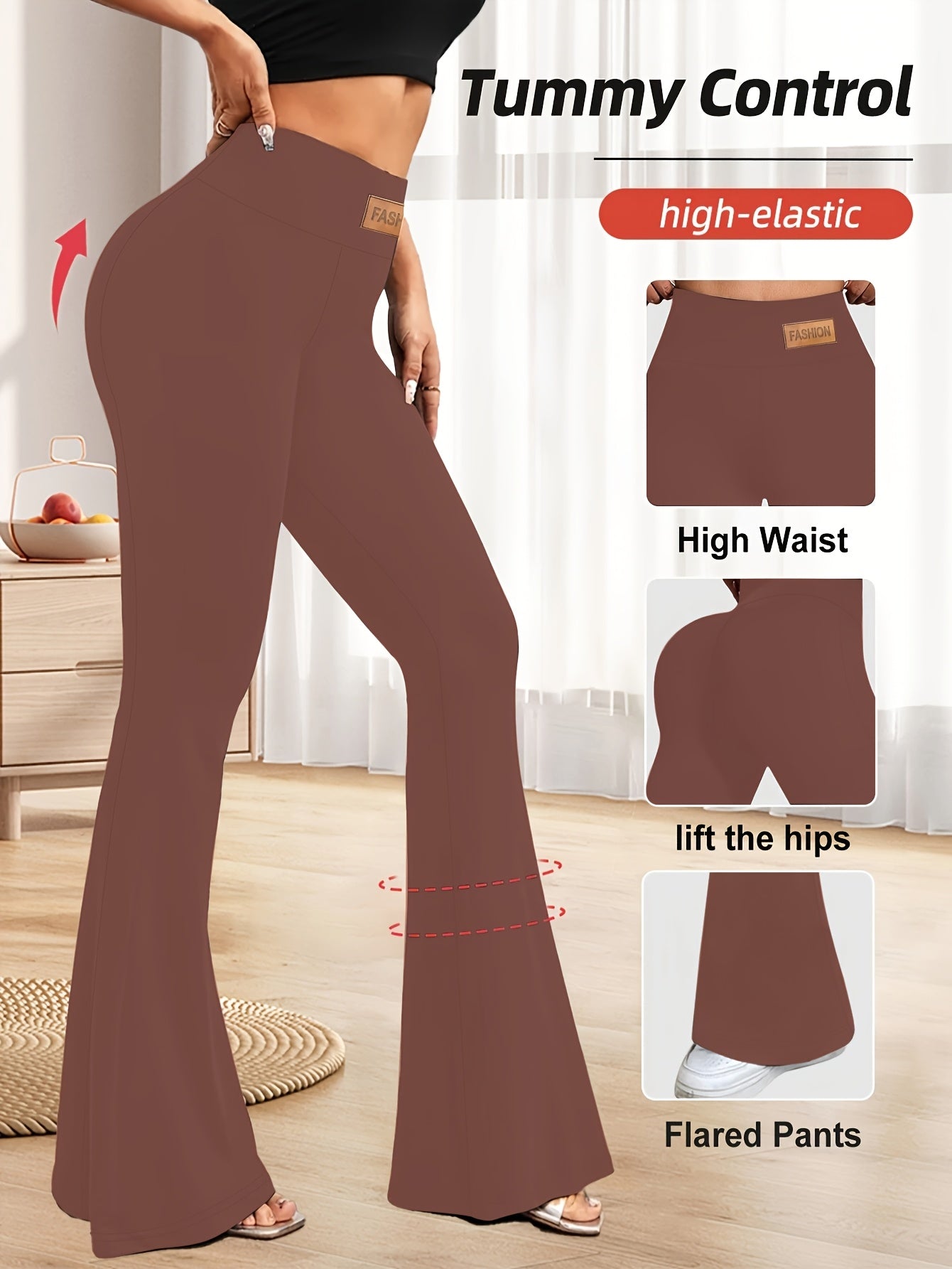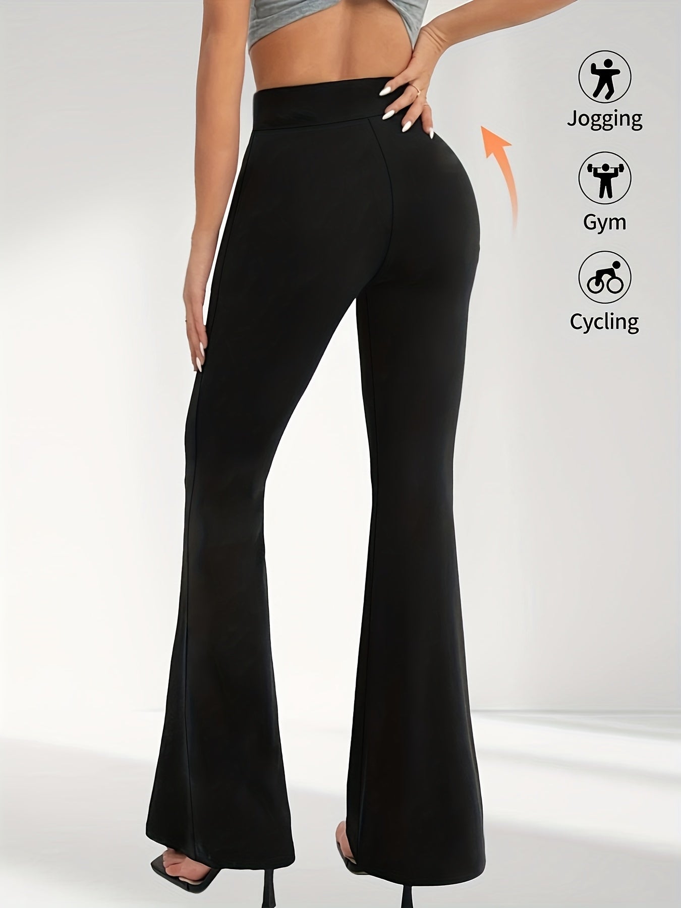 High-Waisted Flared Leggings for Women - Stretchy Black Polyester Pants with Tummy Control, Slimming Fit, and Breathable Design for Spring/Summer/Fall Casual Wear, Spring Summer Leggings | Fitted Leggings | Elastic Waistband