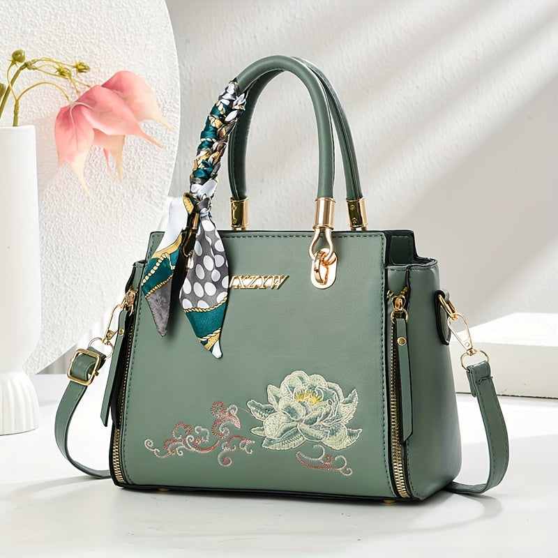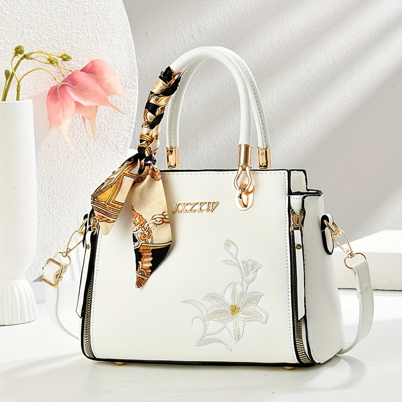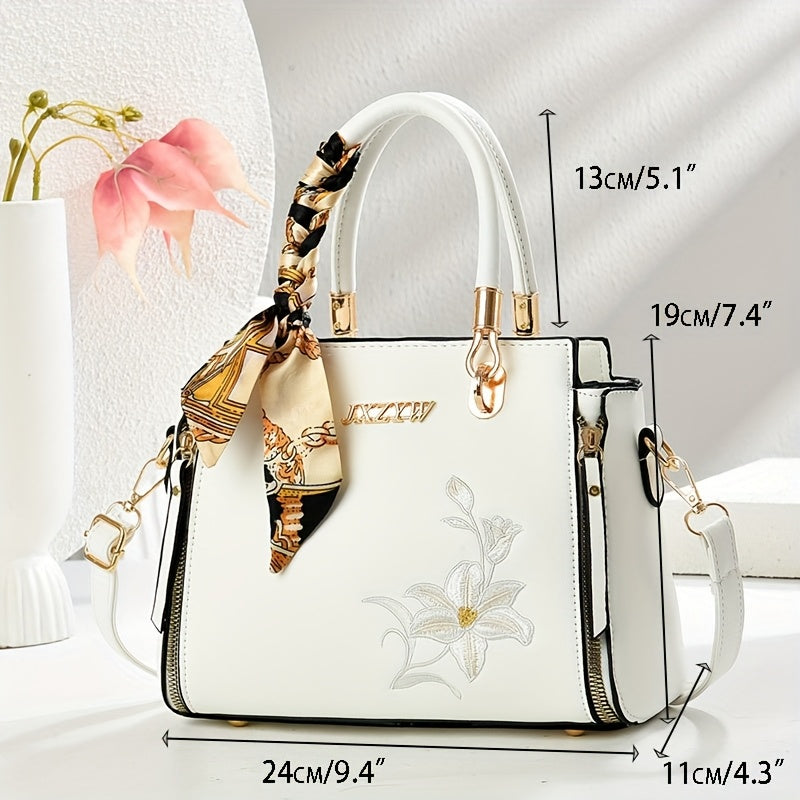 JXZYW Women'S Floral Embossed Large Capacity Tote Bag - Stylish White Shoulder Handbag with Golden-Tone Hardware, Black Handles & Floral Design for Commuting, Shopping, and Casual Outings, Versatile Carryall, Sophisticated Ac
