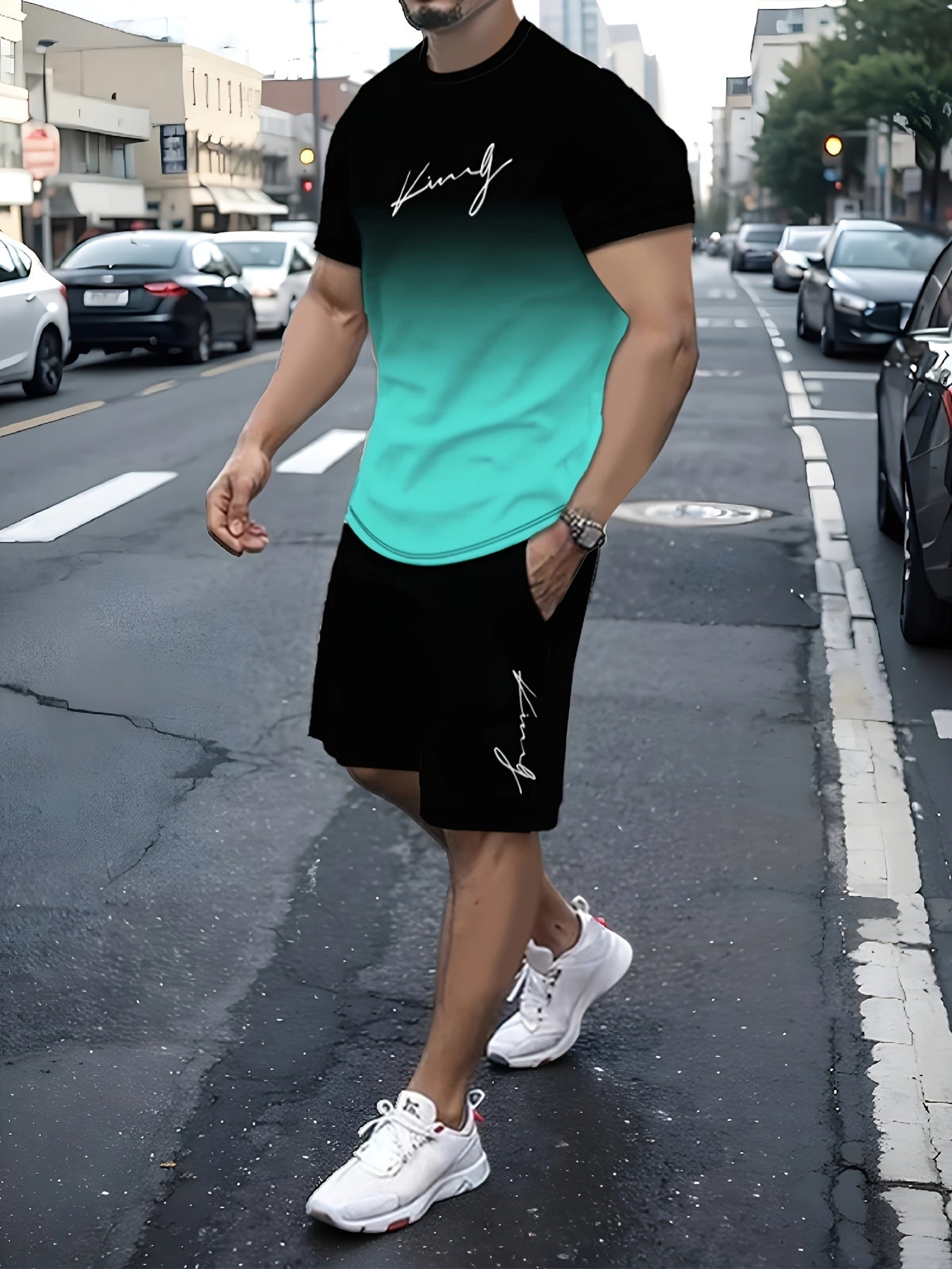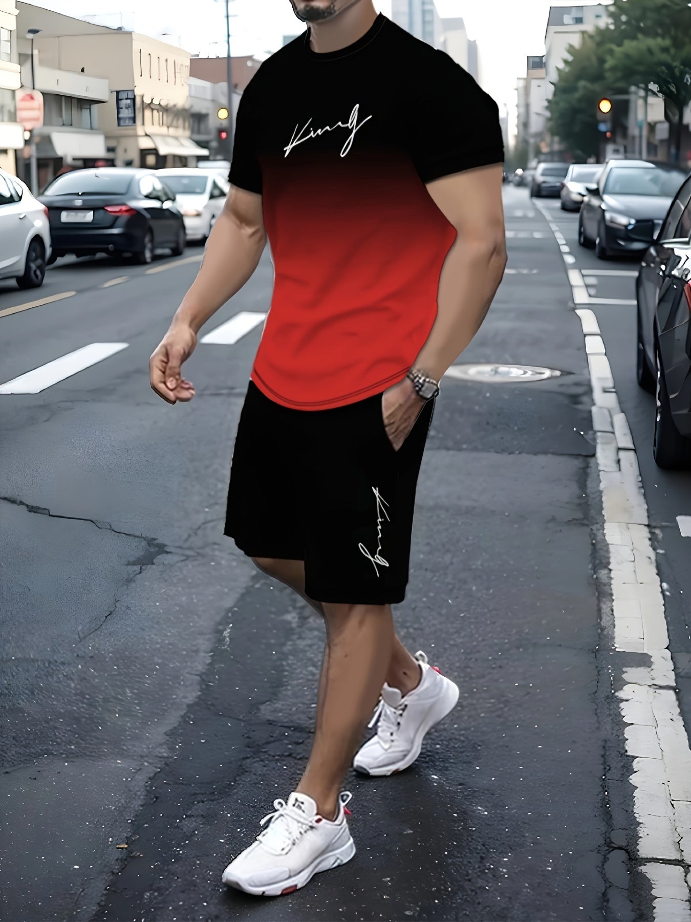 King Signature Men's Two-Piece Athletic Outfit: Graduated Color T-Shirt and Shorts - Summer Collection - High-Quality King Print - Men's Casual Sportswear - Middle East