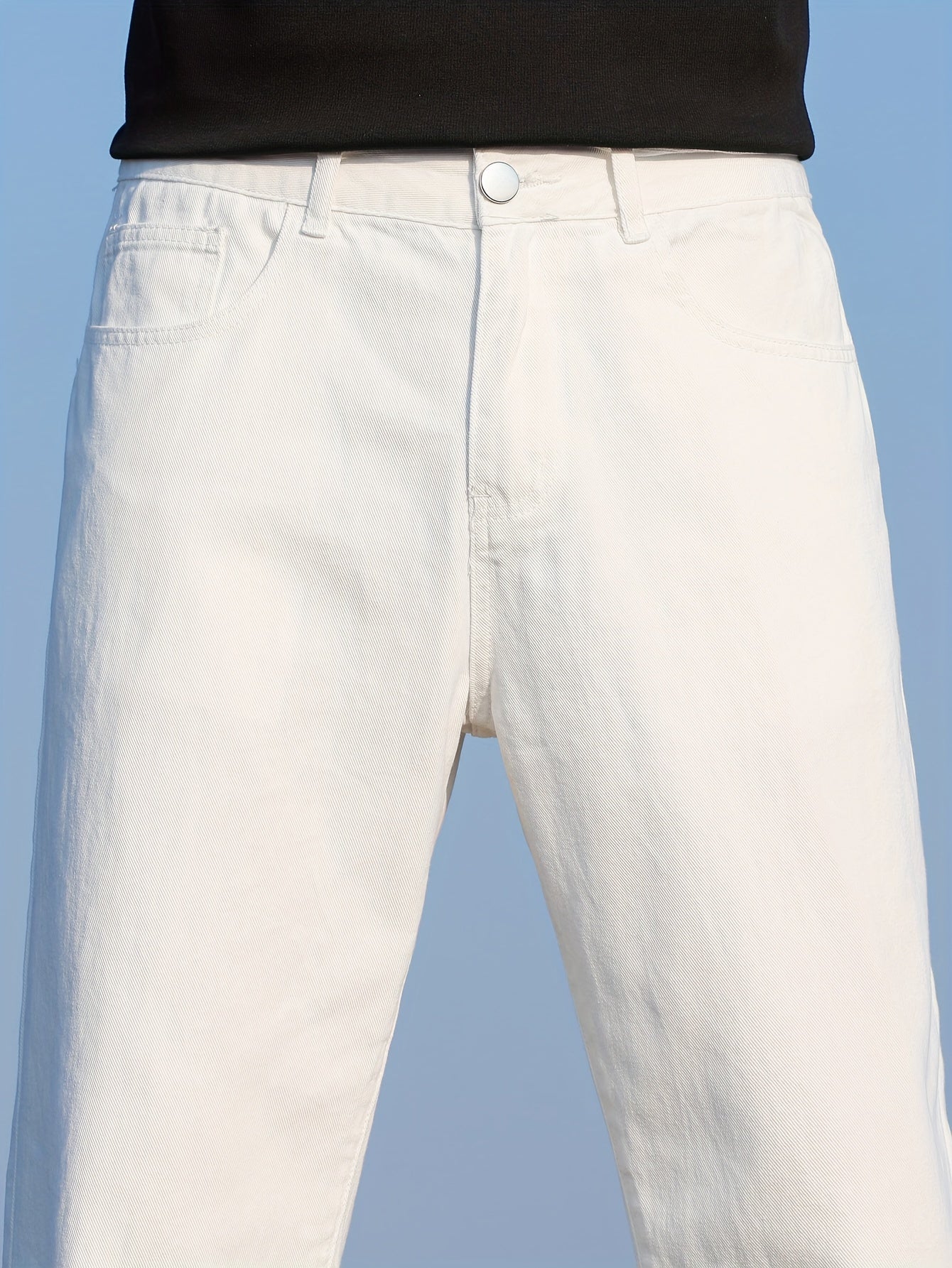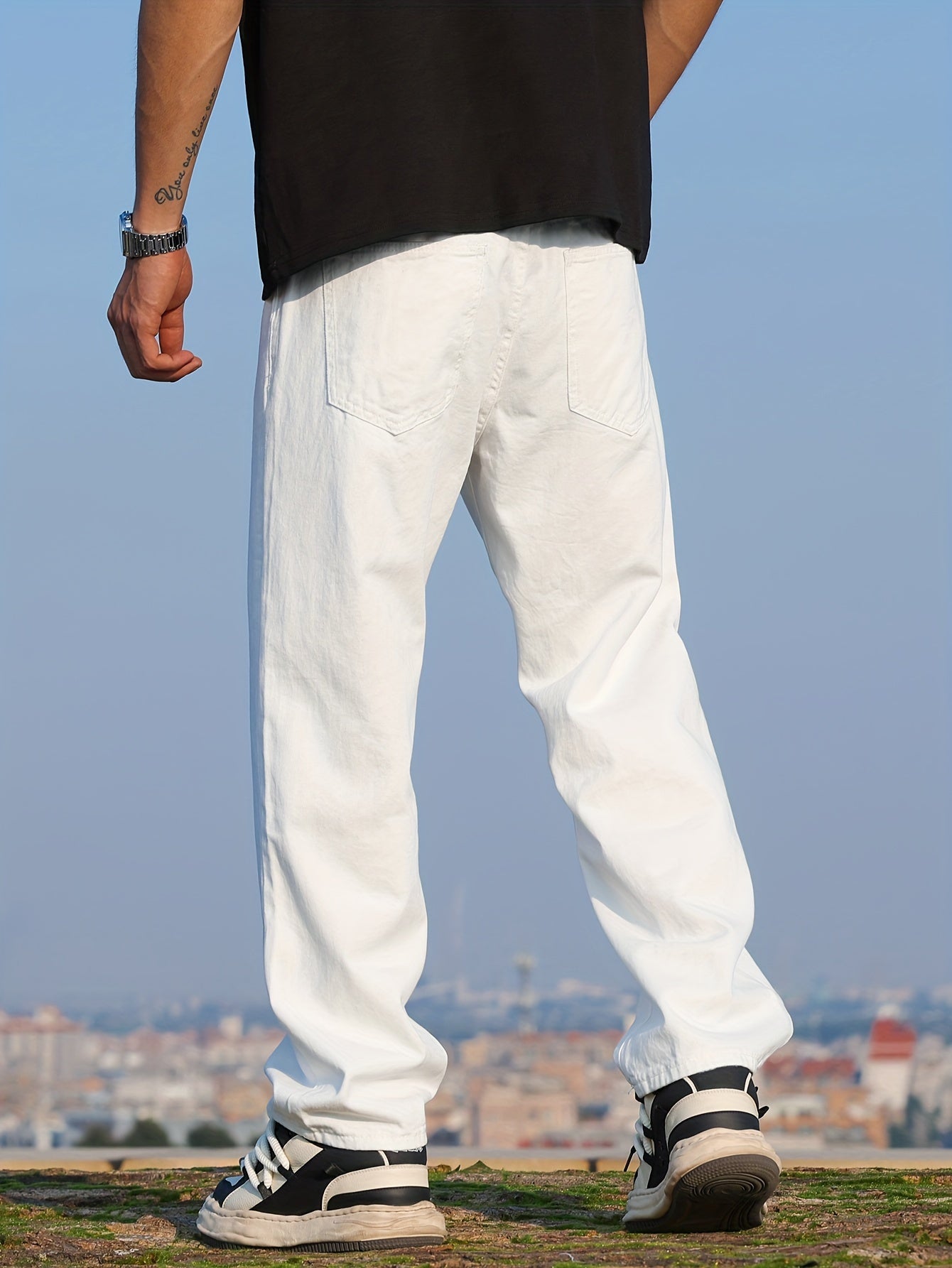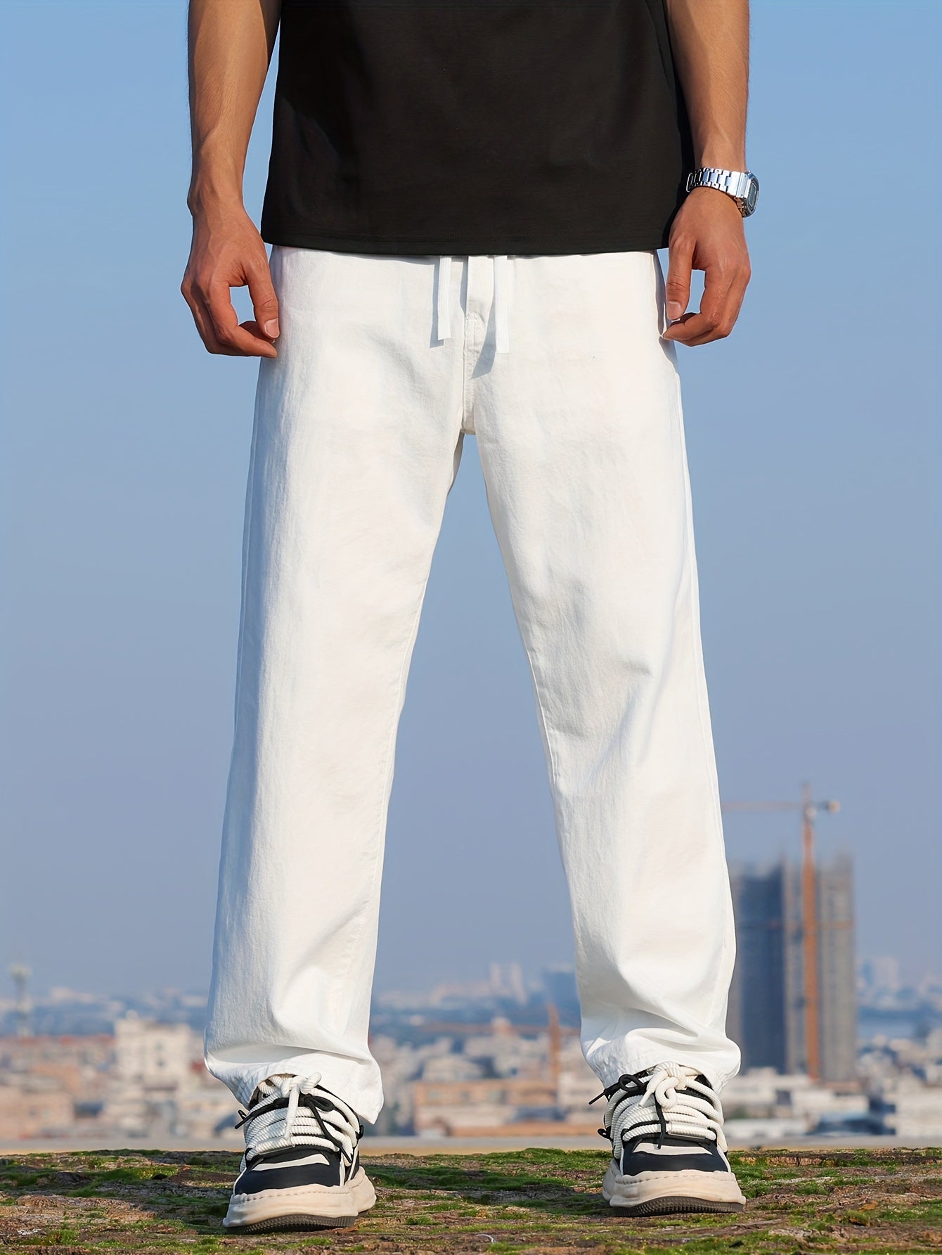 Loose Cotton Blend Men's Solid Wide Leg Pants, Men's Casual Denim Pants, All Seasons