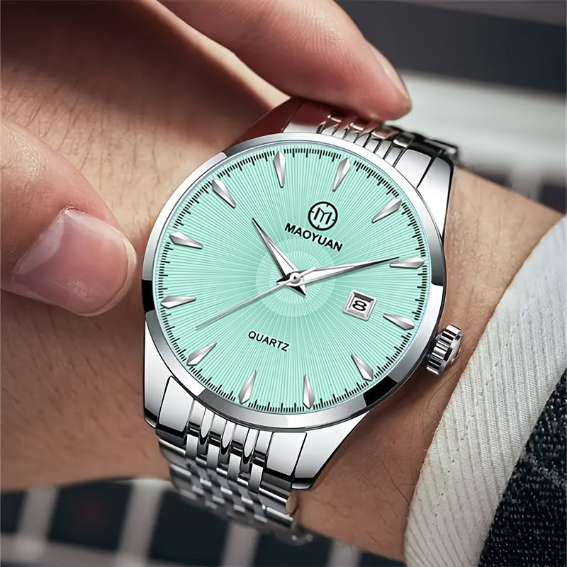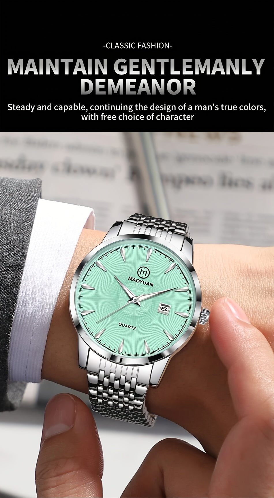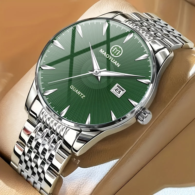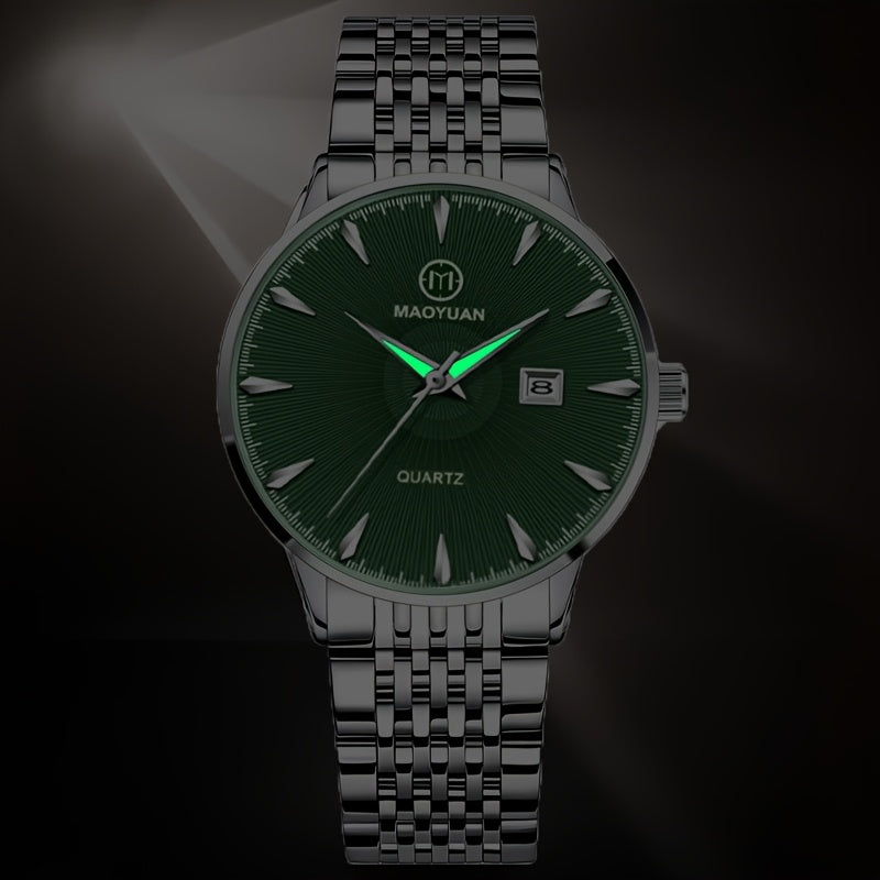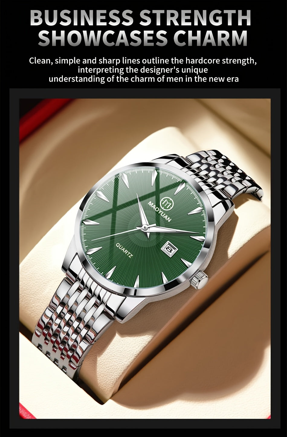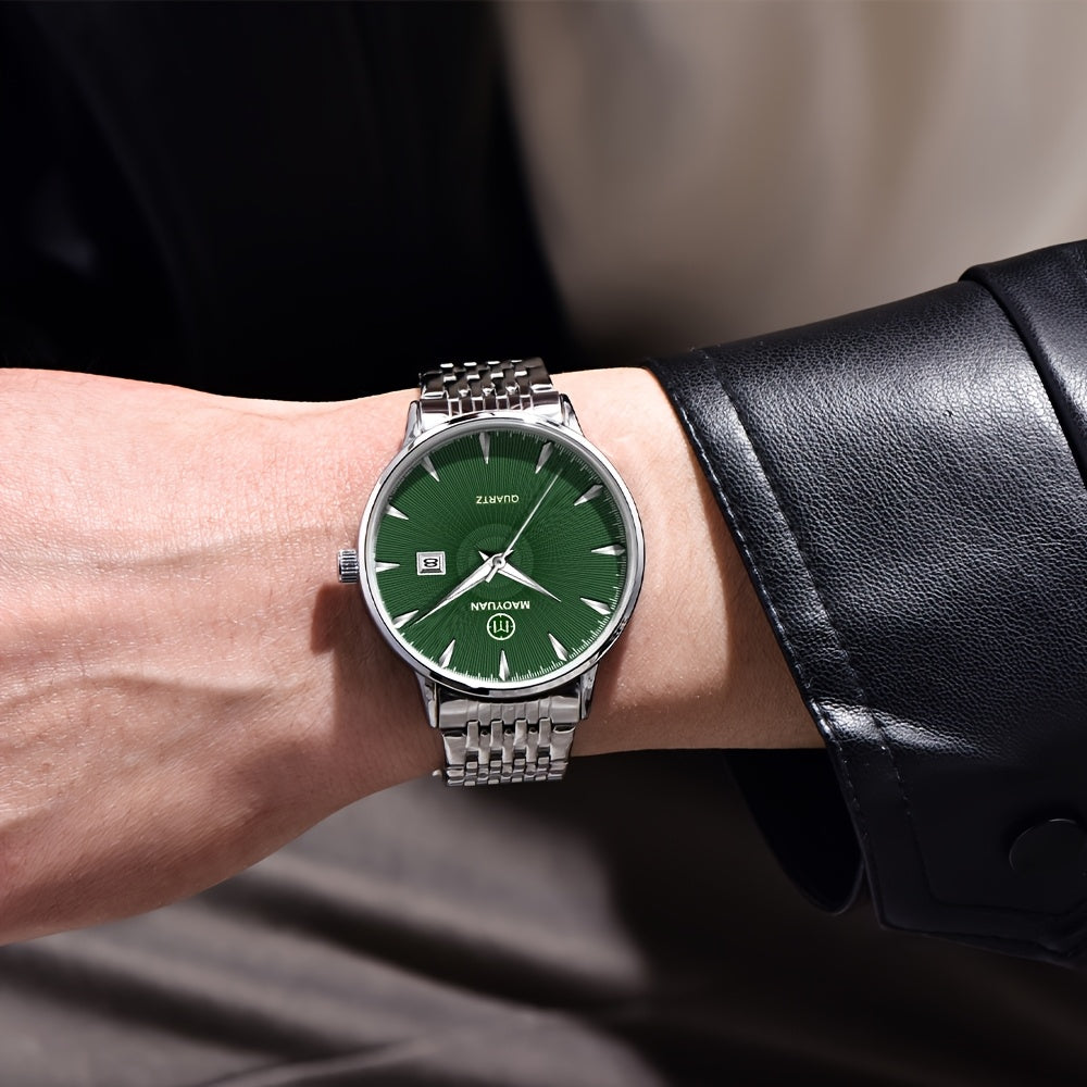 MAOYUAN Men'S Luxury Stainless Steel Quartz Watch with Date Display and Luminescent Hands - Elegant Green Dial, Metal Bracelet, Perfect for Business and Casual Attire, Ideal Gift for Men, Casual Watch | Elegant Watch | Quartz