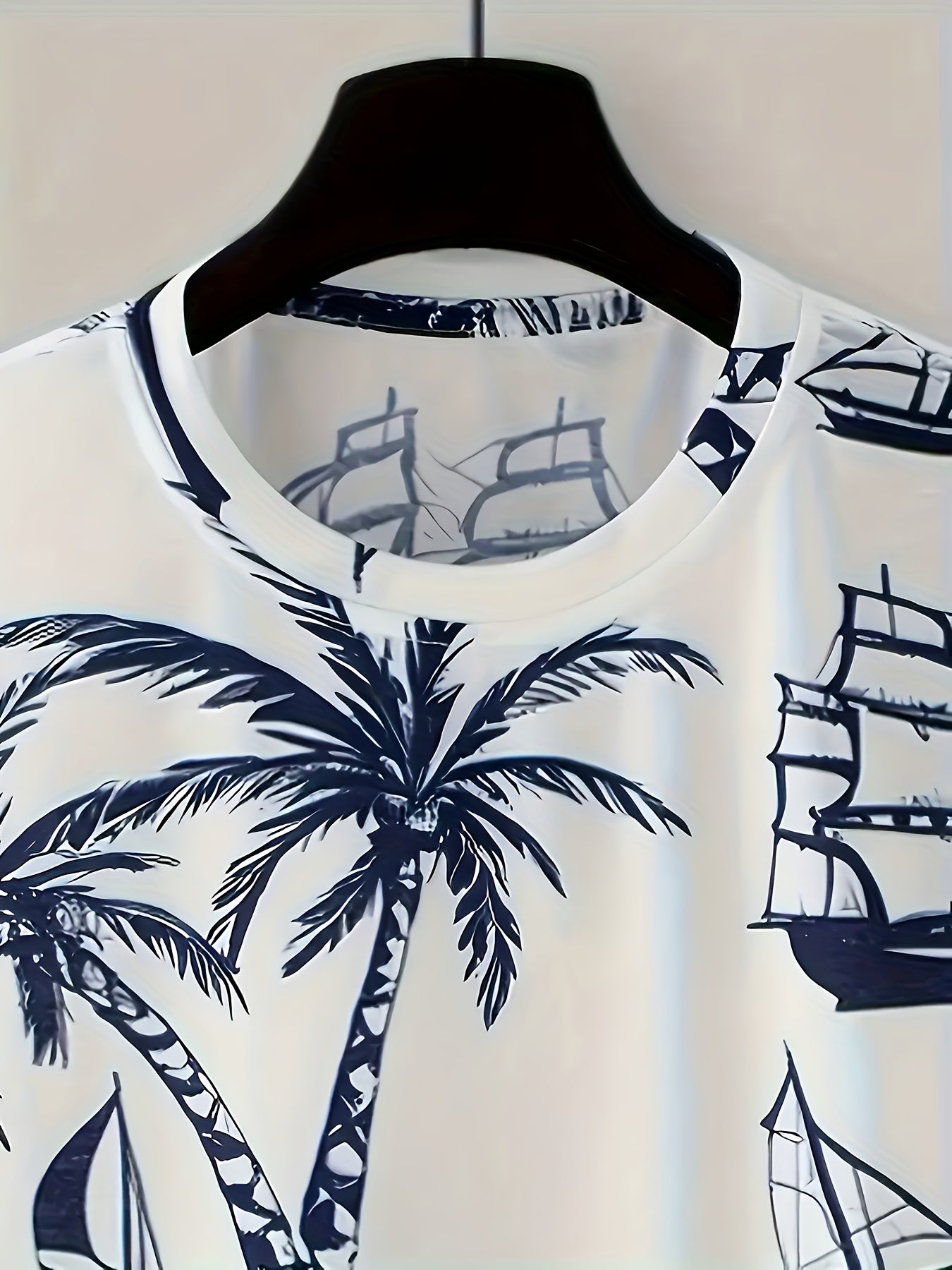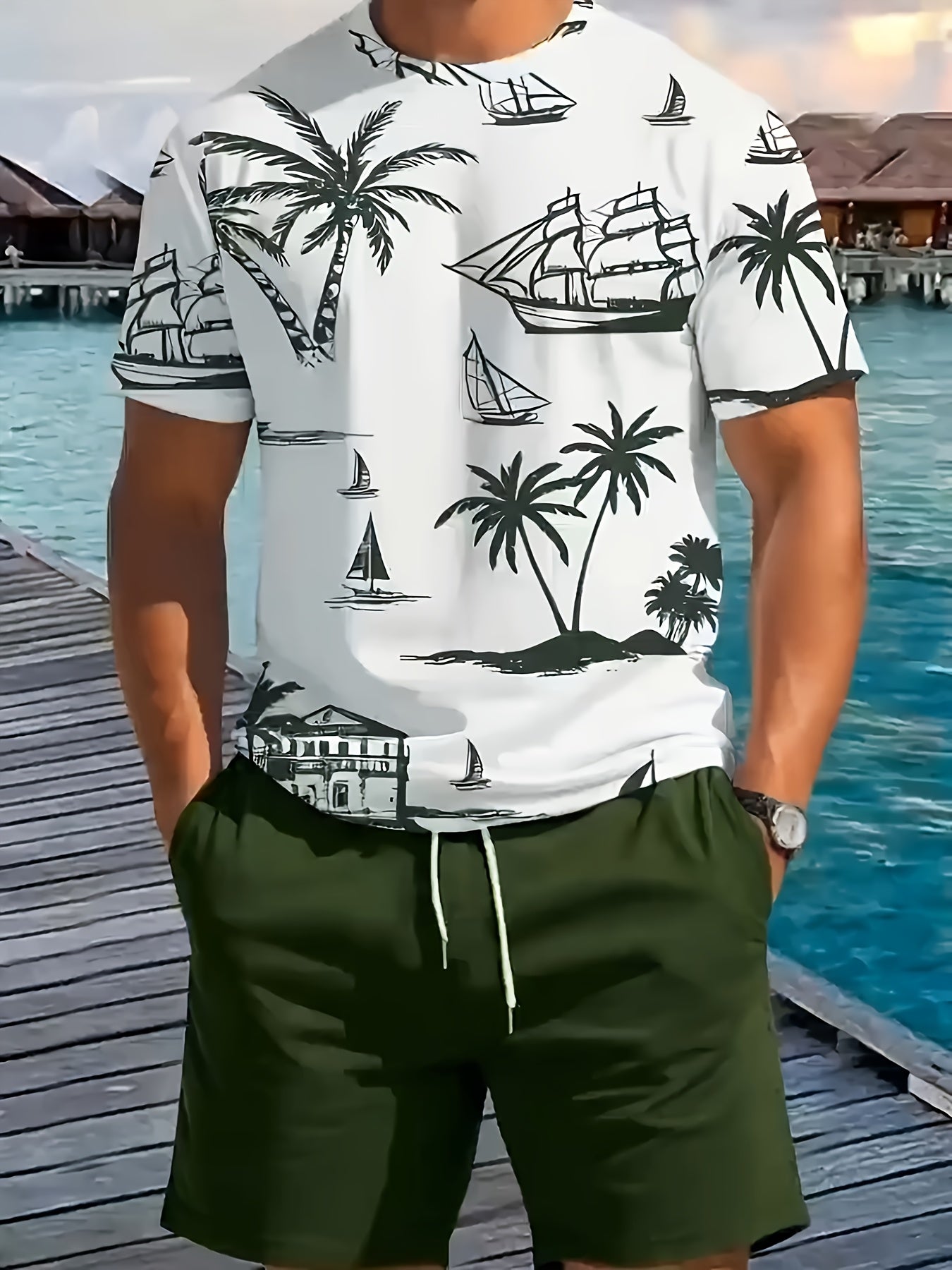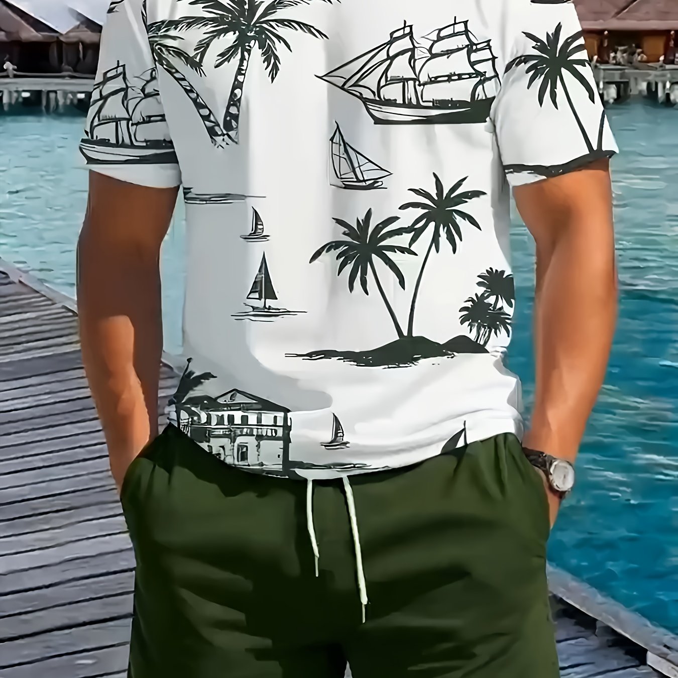 Men's 2025 Summer New Short Sleeve Shorts Set: Beach Casual 3D Coconut Tree Print, 2pcs Fashionable Palm Pattern T-Shirt and Shorts with Slight Stretch Polyester Knit Fabric, Slim Fit for Outdoor Activities & Family Gathering