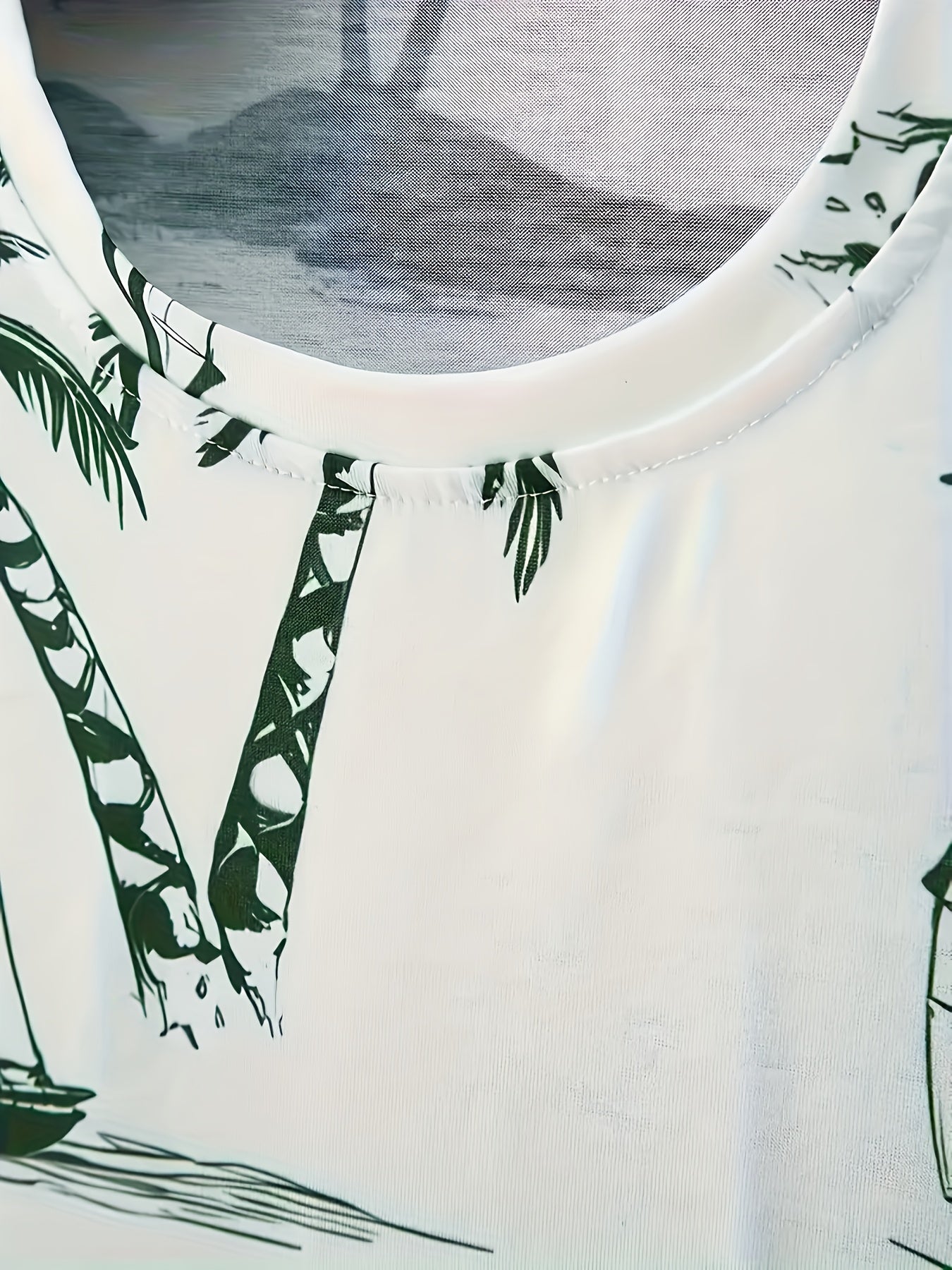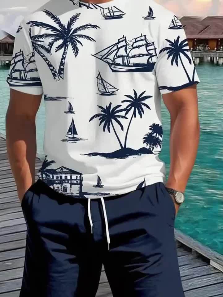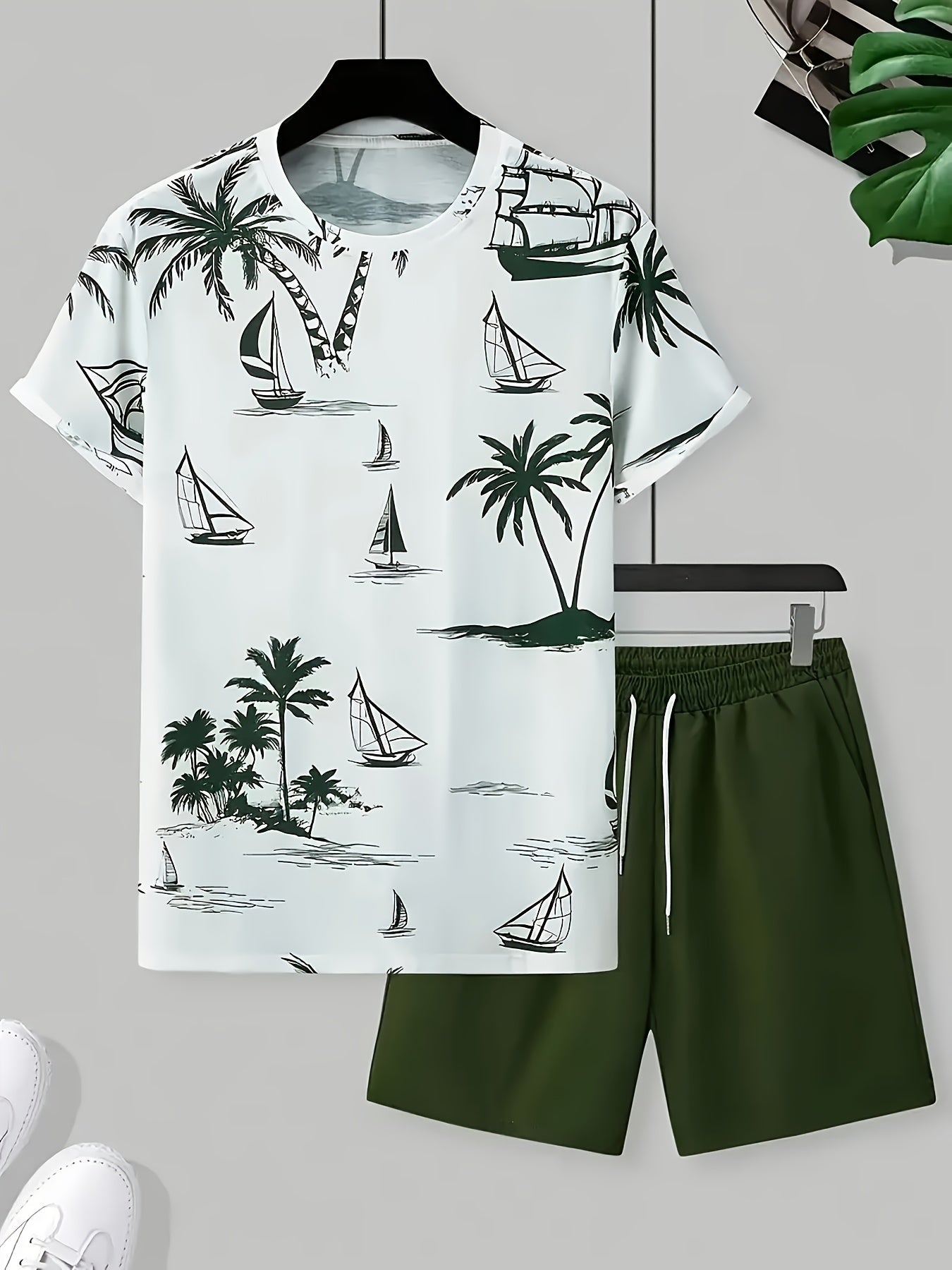 Men's 2025 Summer New Short Sleeve Shorts Set: Beach Casual 3D Coconut Tree Print, 2pcs Fashionable Palm Pattern T-Shirt and Shorts with Slight Stretch Polyester Knit Fabric, Slim Fit for Outdoor Activities & Family Gathering