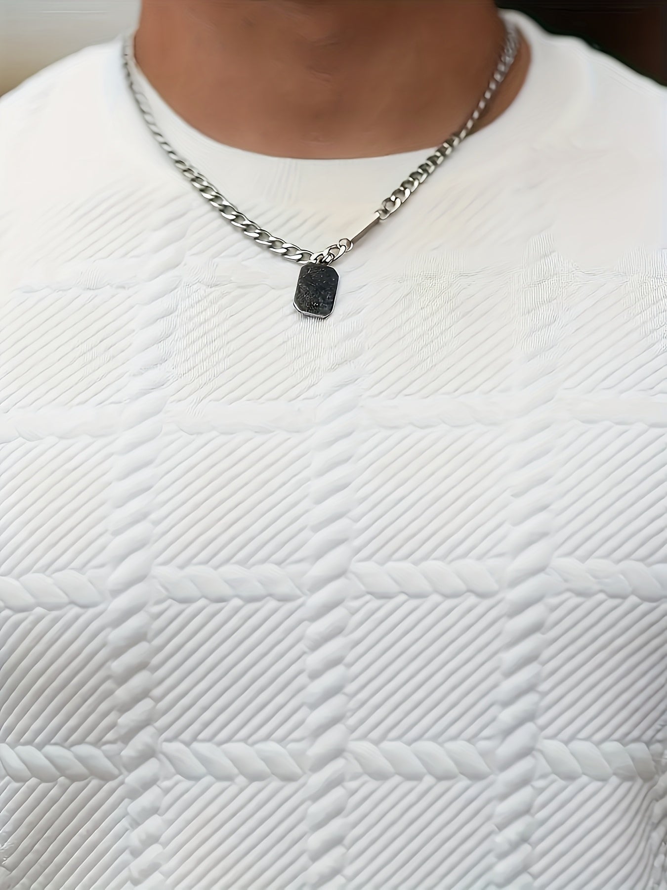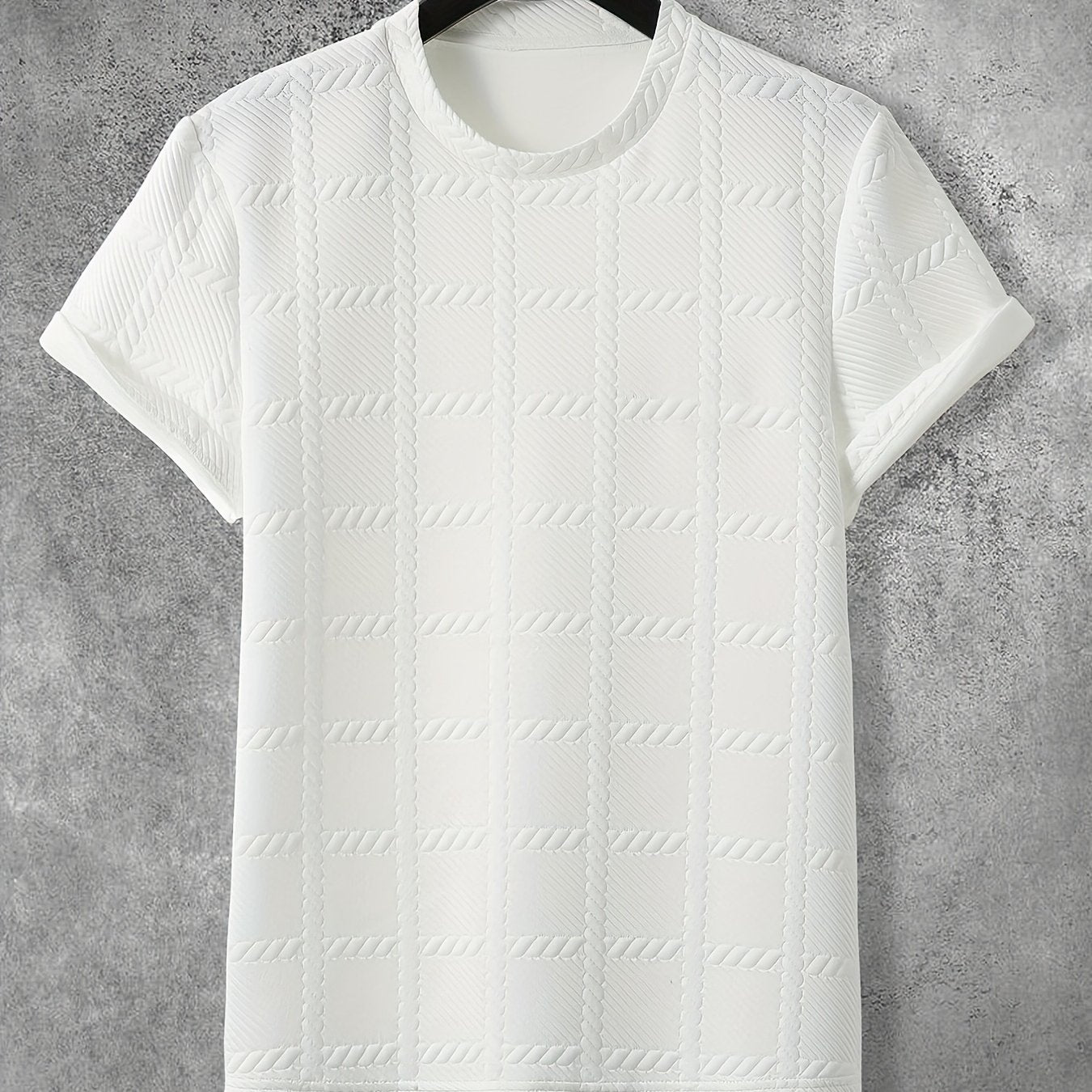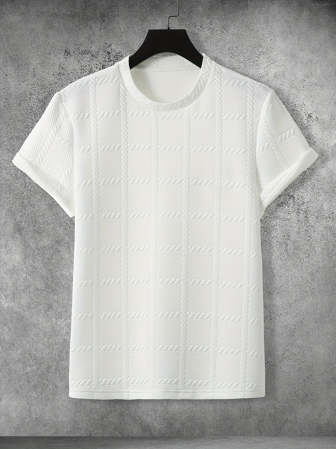 Men'S Casual Embossed Pattern Short Sleeve T-Shirt, 100% Polyester Crew Neck Knit Fabric, Slight Stretch, Solid Color Top