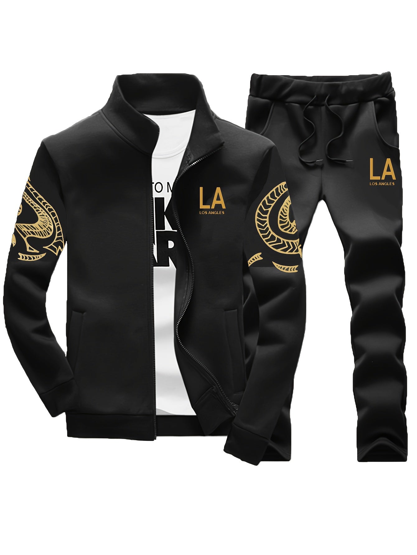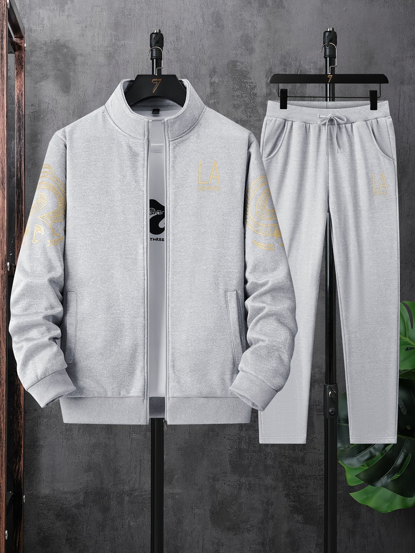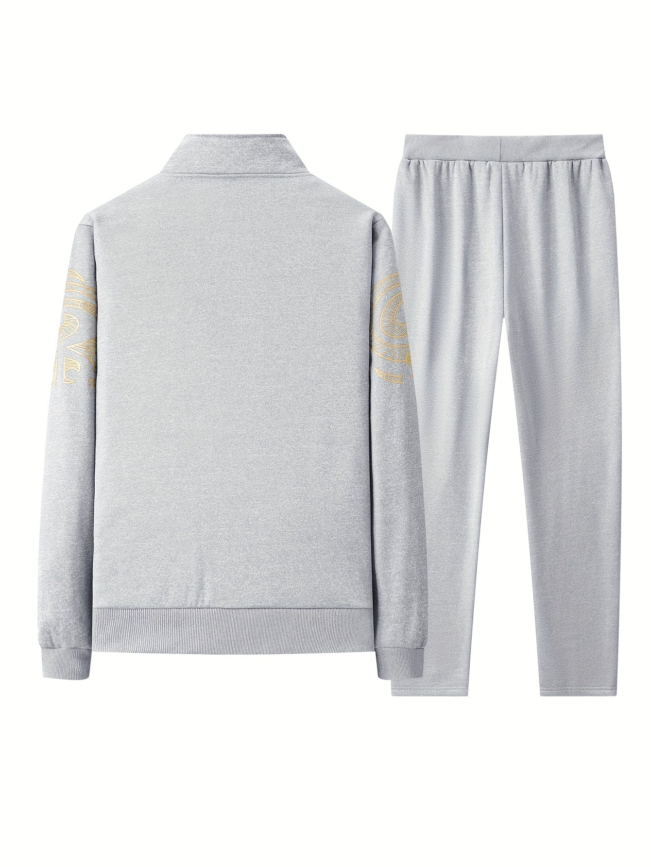 Men's Casual Print Sweatshirt & Joggers Set - Polyester, Stand Collar, Zip-Up Jacket for Spring/Fall