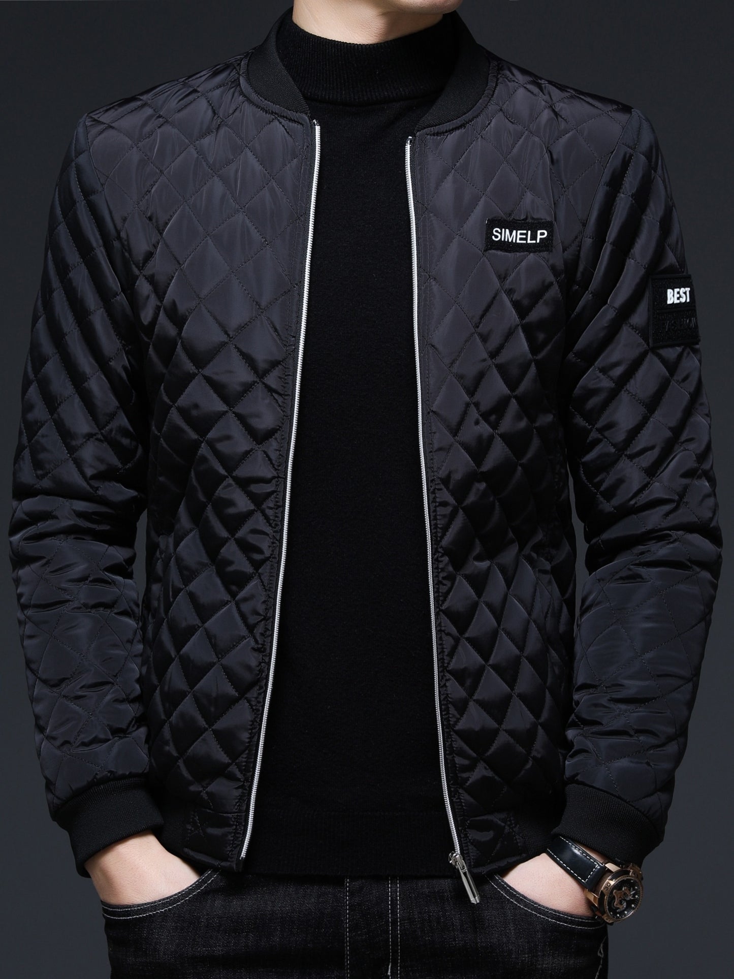 Men's Casual Quilted Zip Up Jacket, Chic Baseball Collar Jacket For Fall Winter