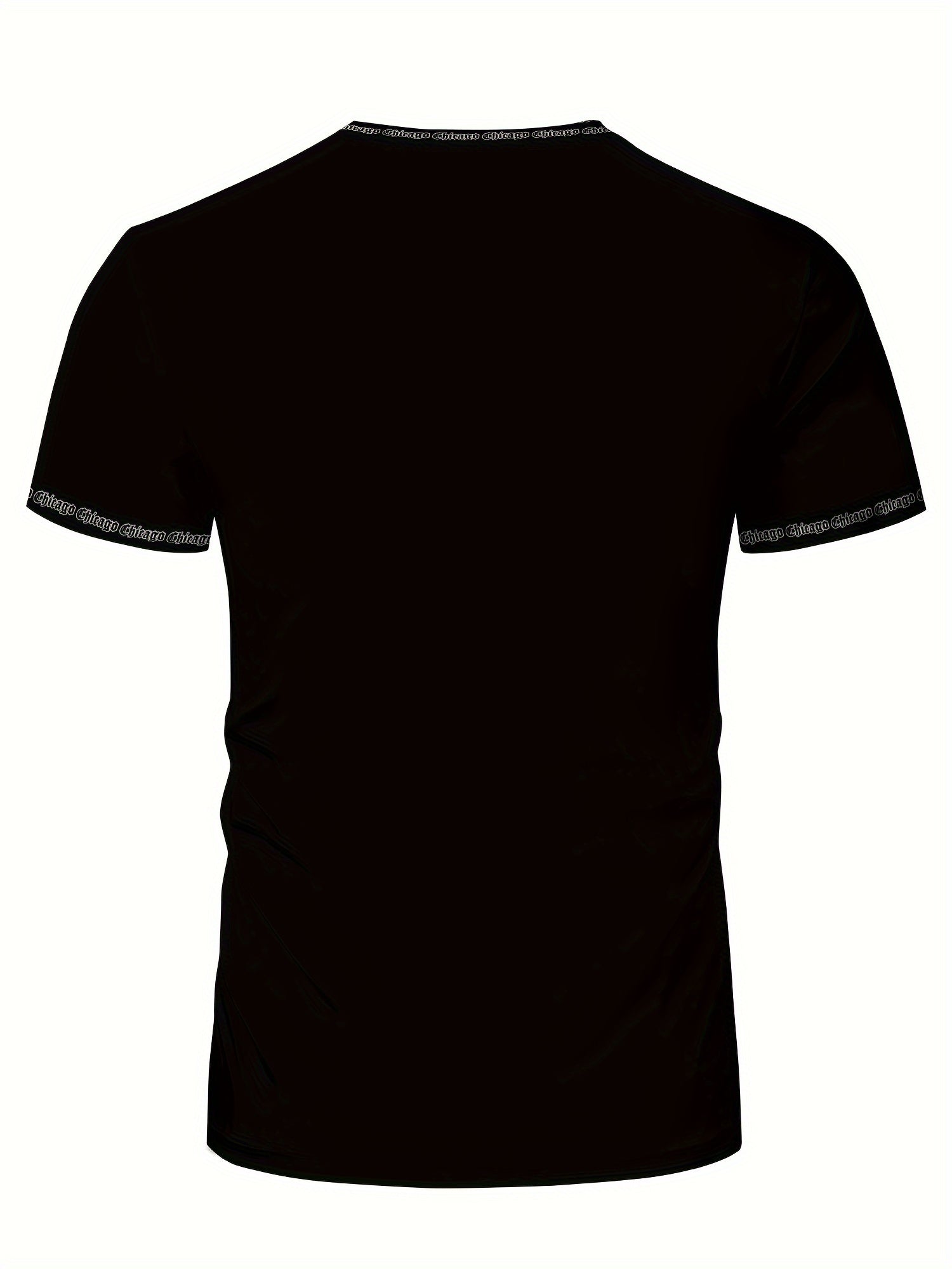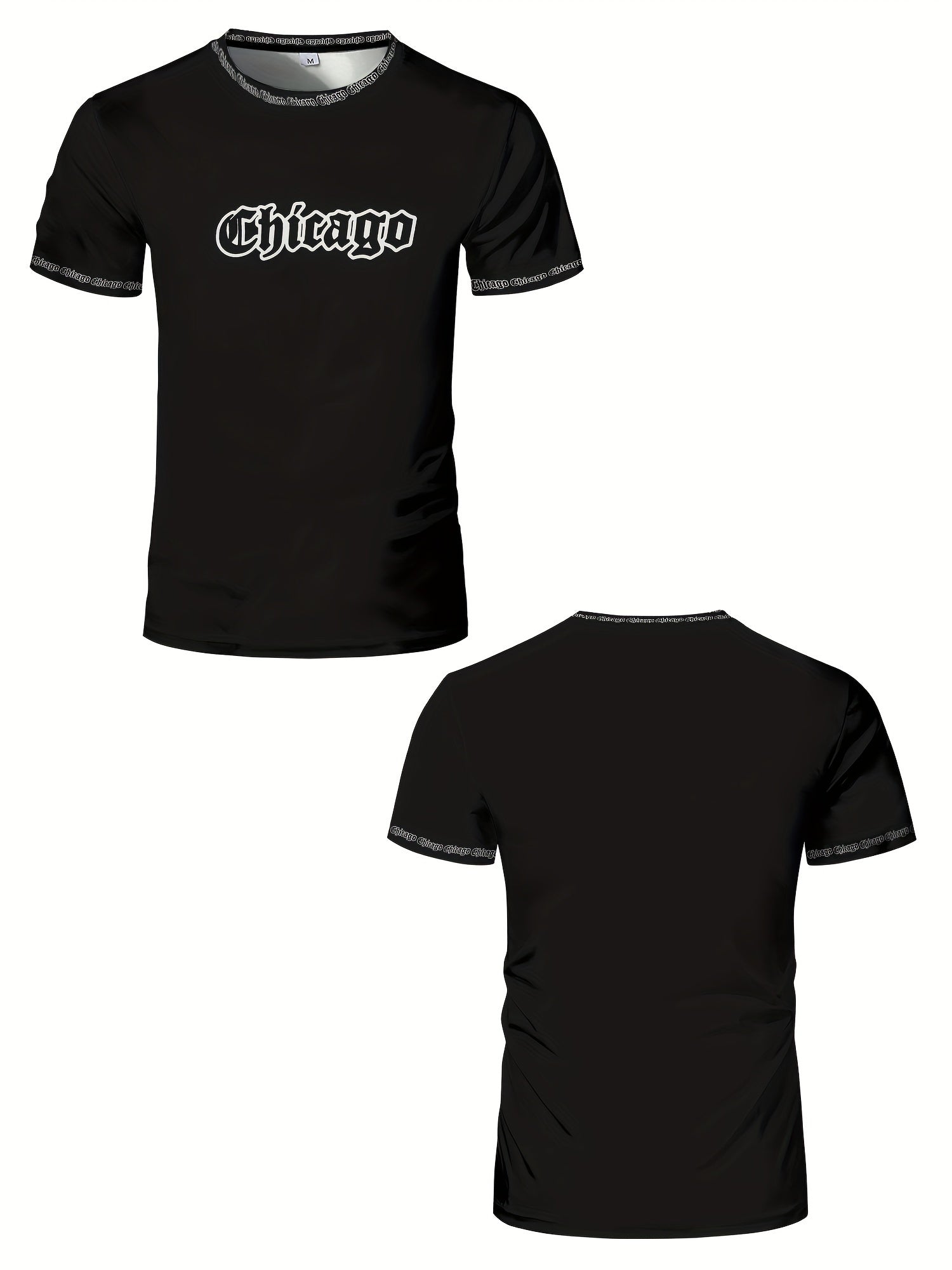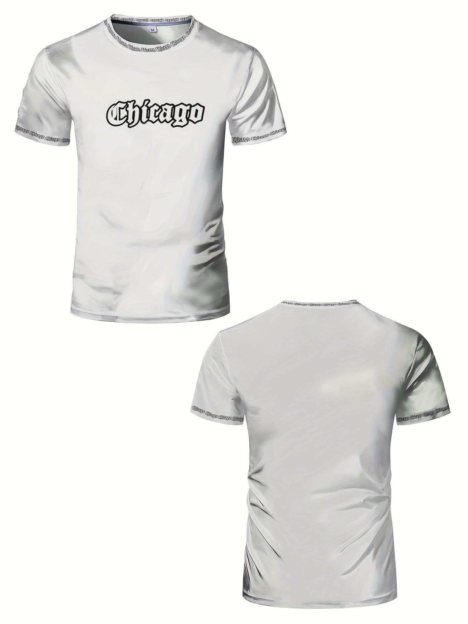 Men'S Chicago Print T-Shirt, Polyester-Spandex Blend, Crew Neck, Short Sleeve, Geometric Pattern, High Stretch, Tear Resistant, Sports Casual Style, Summer Fit Top for Training, Yoga, Hiking Festive Occasions