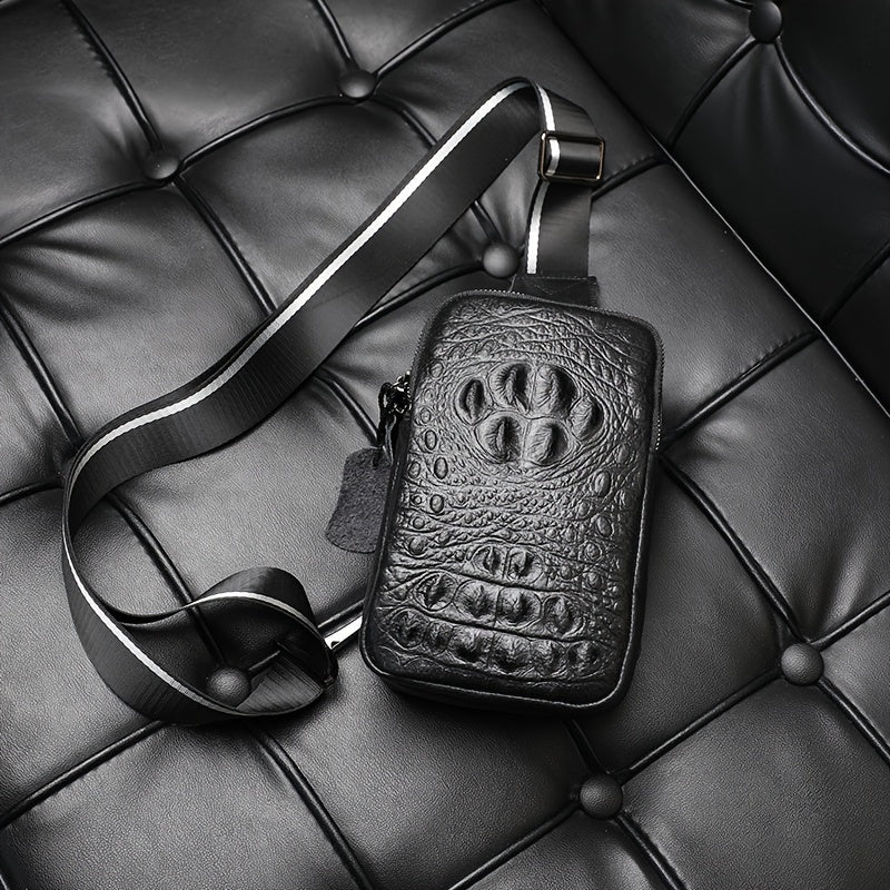 Men's Genuine Leather Crossbody Bag with Crocodile Pattern - Stylish Black Chest Bag for Casual Outings, Paw Print Design, Adjustable Strap, Perfect for Commuting or Travel, Small Crossbody Bag