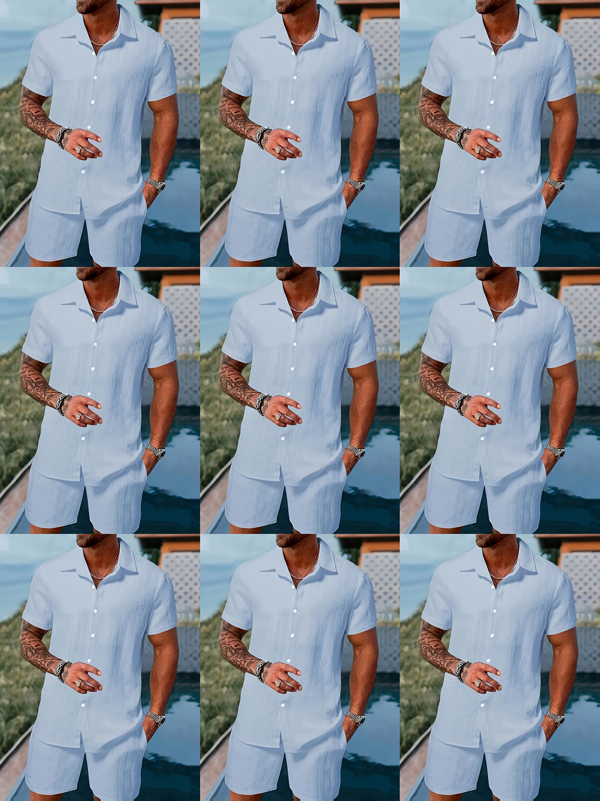 Men's Outfit, Checkered Print Lapel Short Sleeve Button Up Shirt & Shorts 2pcs co ord set for Outdoor Activities