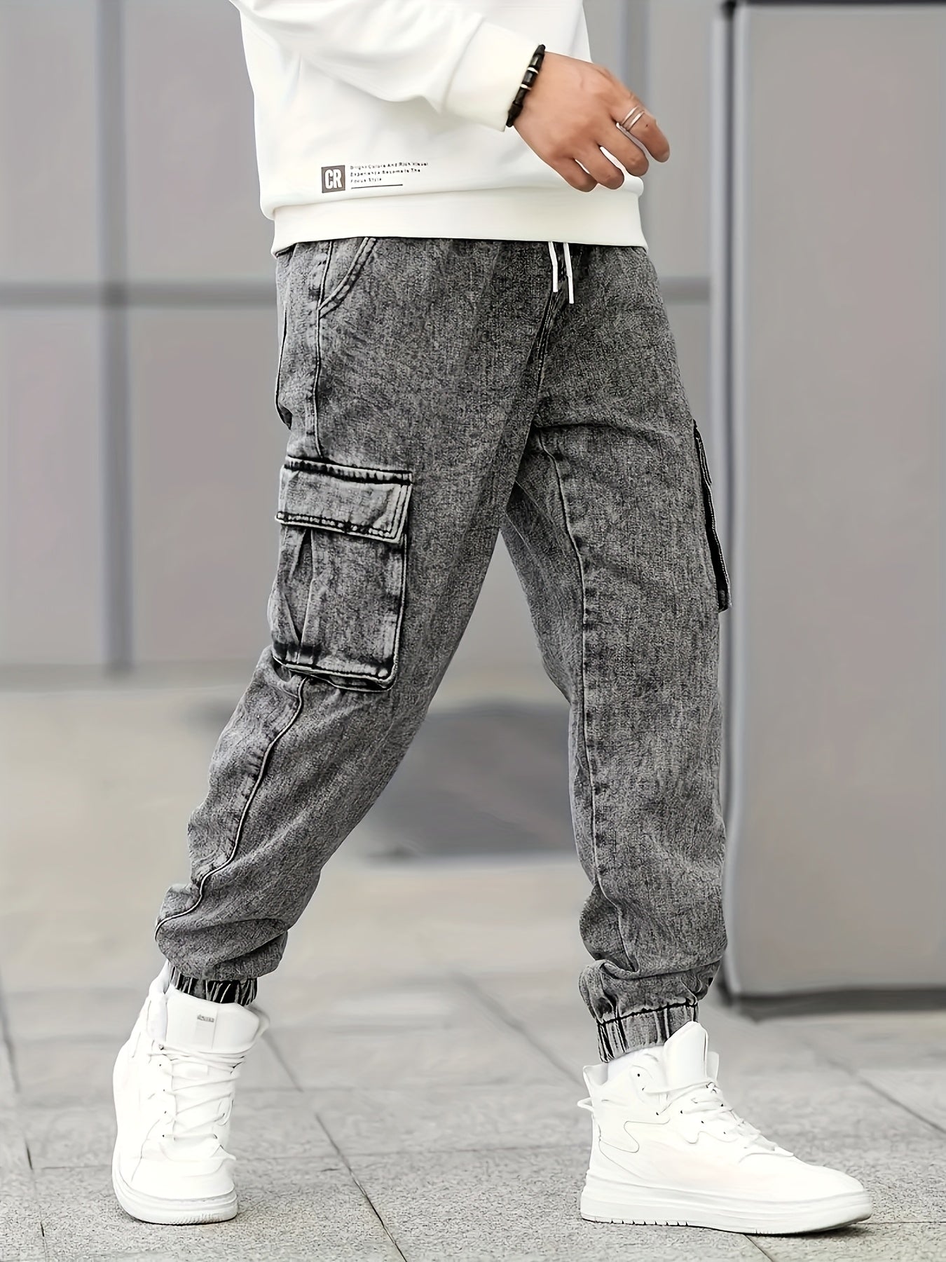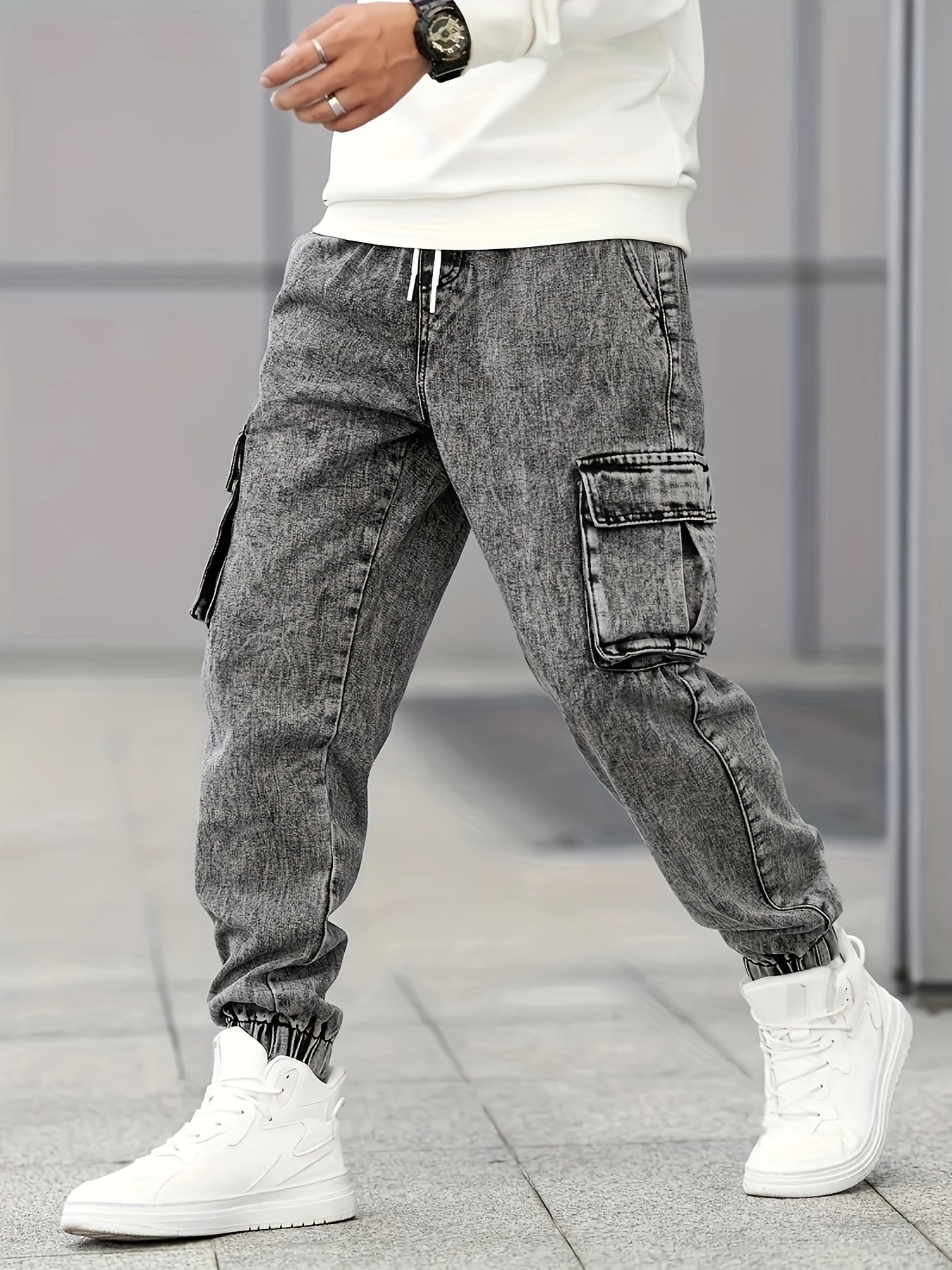 Men's Slim Fit Cargo Jeans - Stylish Gray Denim with Multiple Pockets, Durable Cotton/Polyester Blend, All-Season Wear