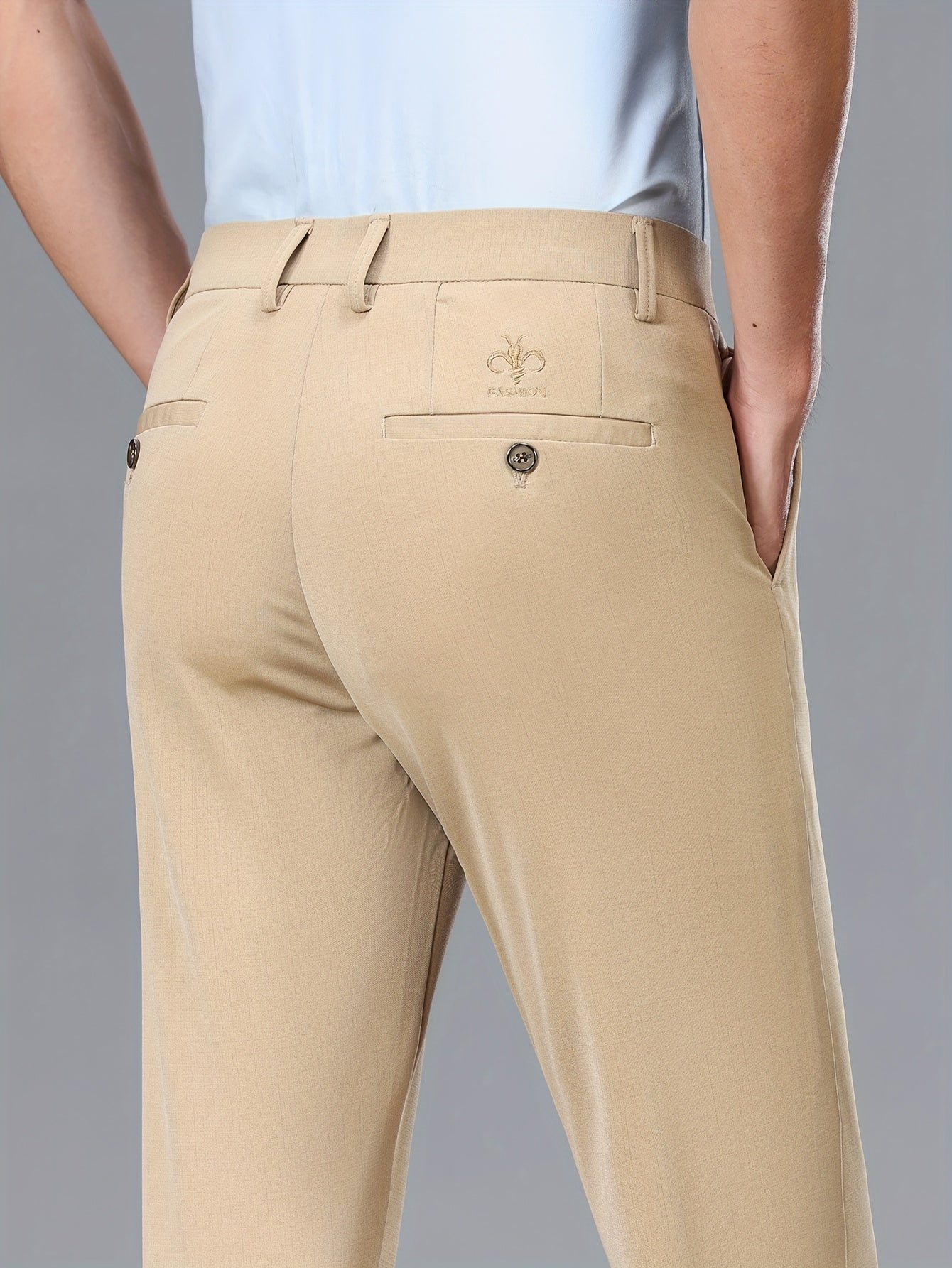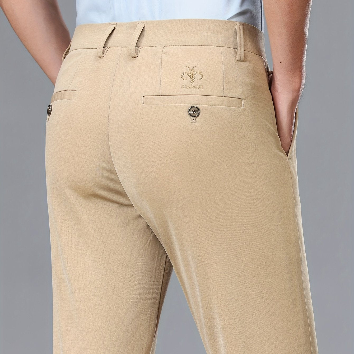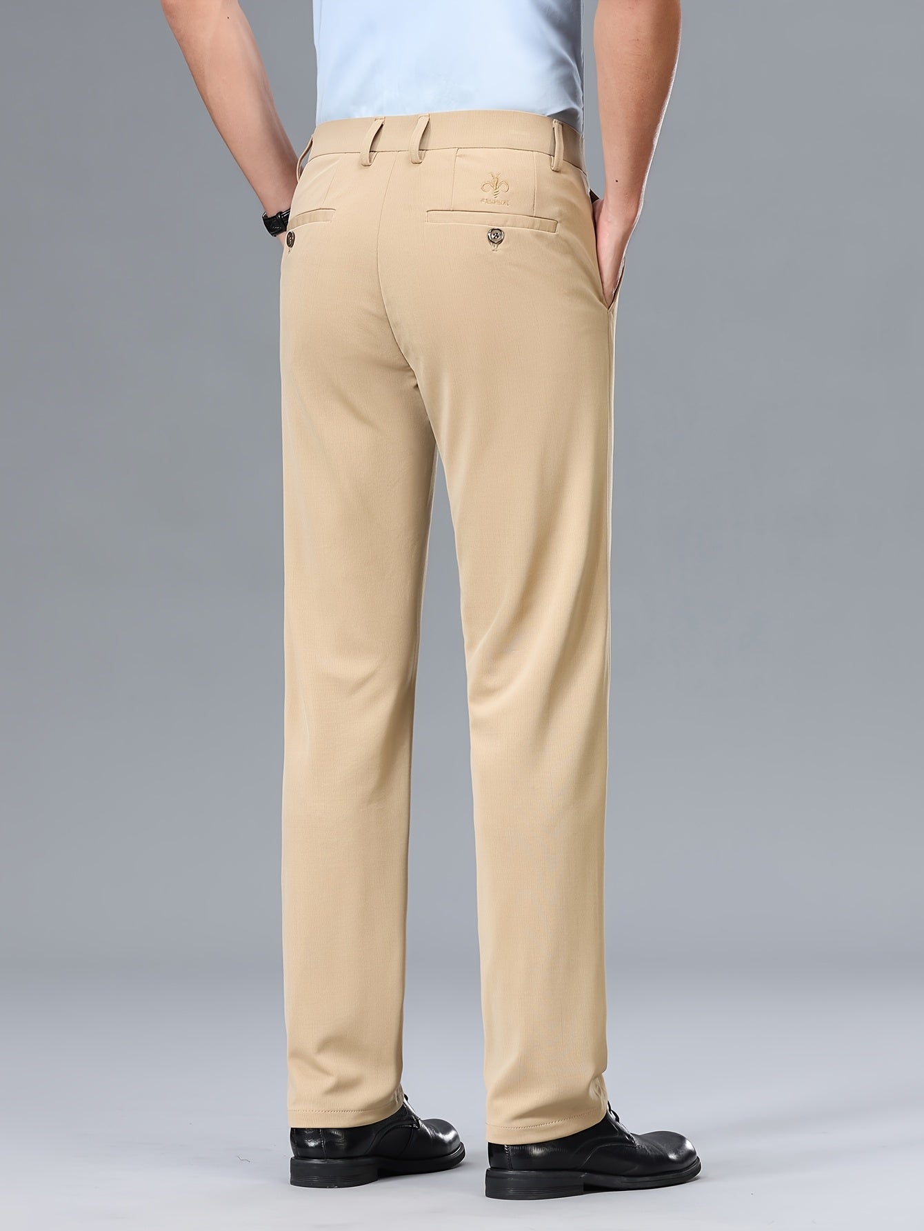 Men's Stretch Dress Pants, Beige with Embroidered Logo - Straight Fit, Wrinkle-Resistant, Polyester Blend, Ideal for Business Casual or Formal Occasions, Allseason Wear|Straight Cut Pants|Stretch Fabric