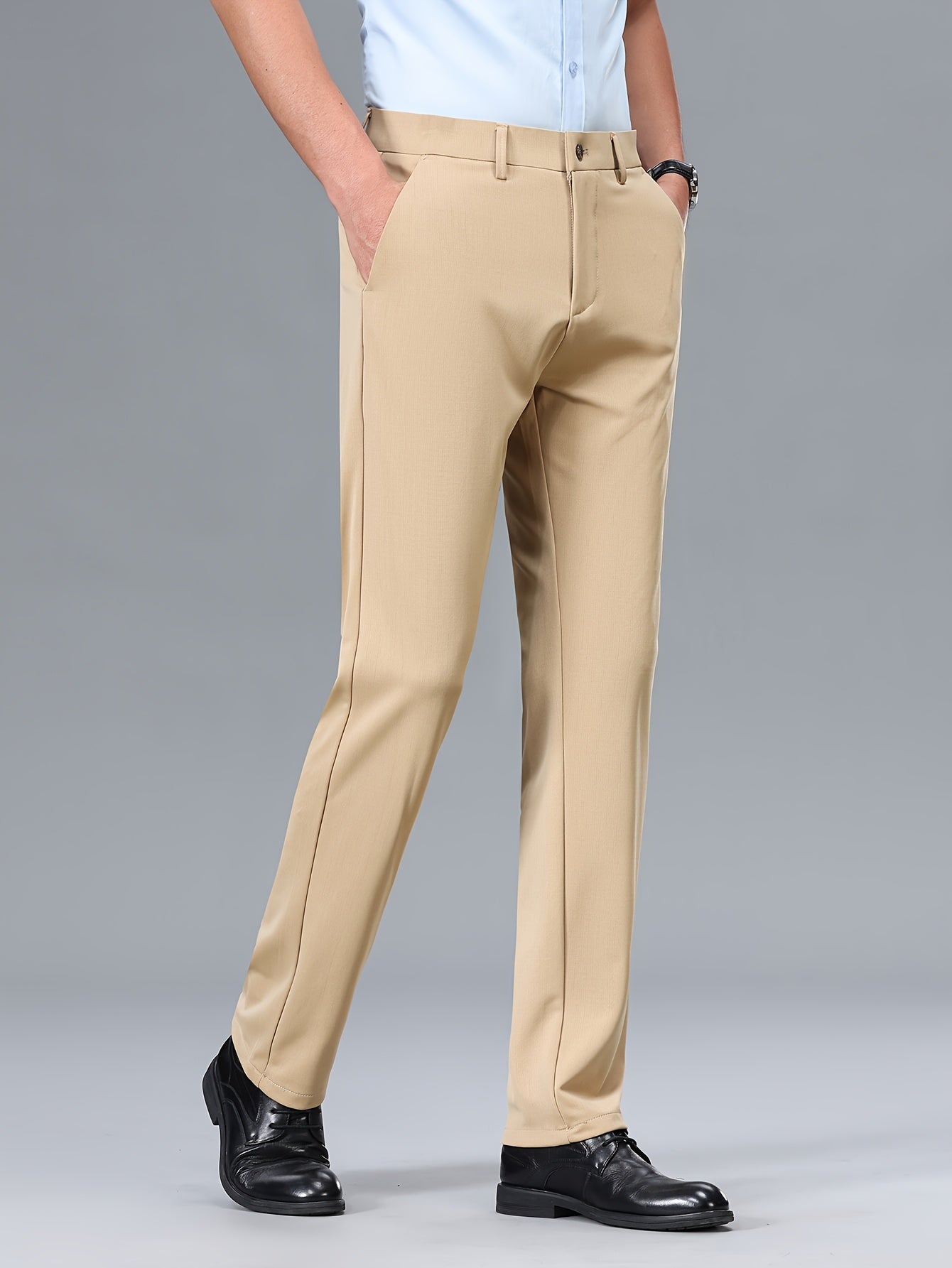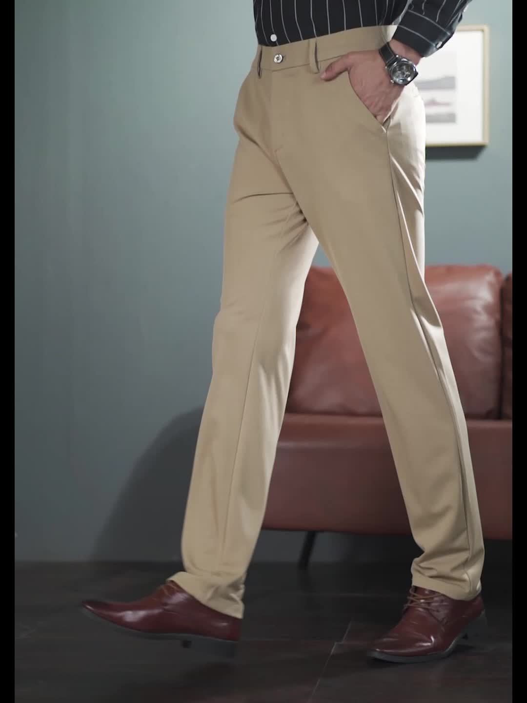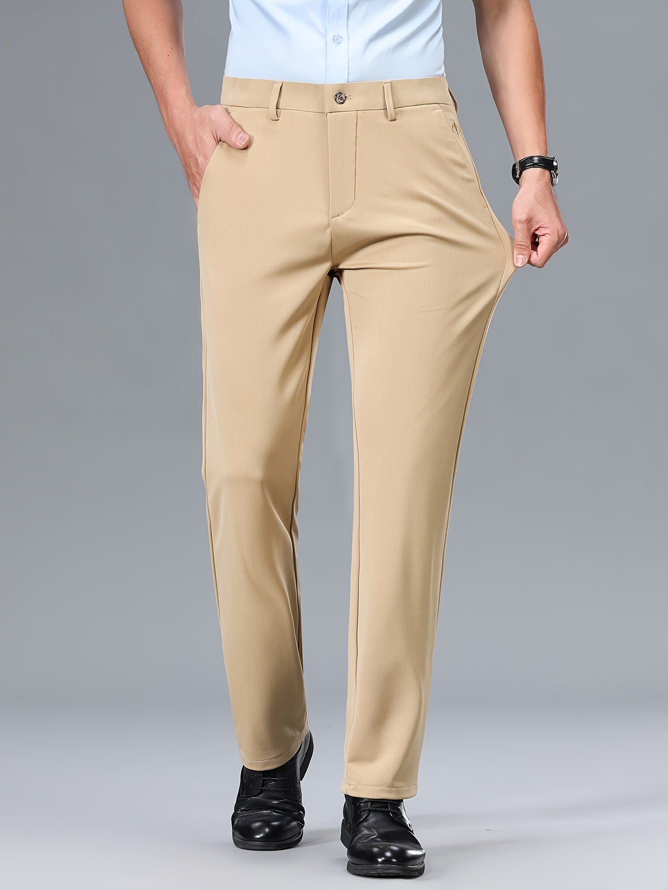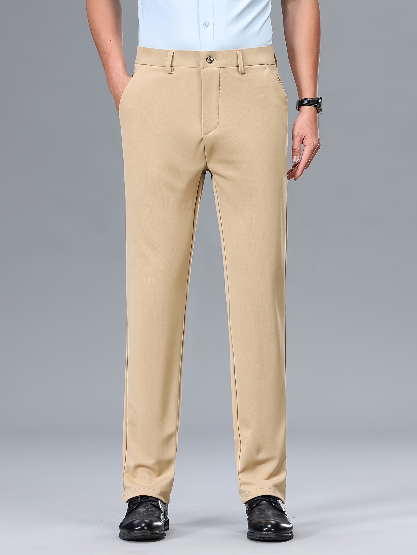 Men's Stretch Dress Pants, Beige with Embroidered Logo - Straight Fit, Wrinkle-Resistant, Polyester Blend, Ideal for Business Casual or Formal Occasions, Allseason Wear|Straight Cut Pants|Stretch Fabric