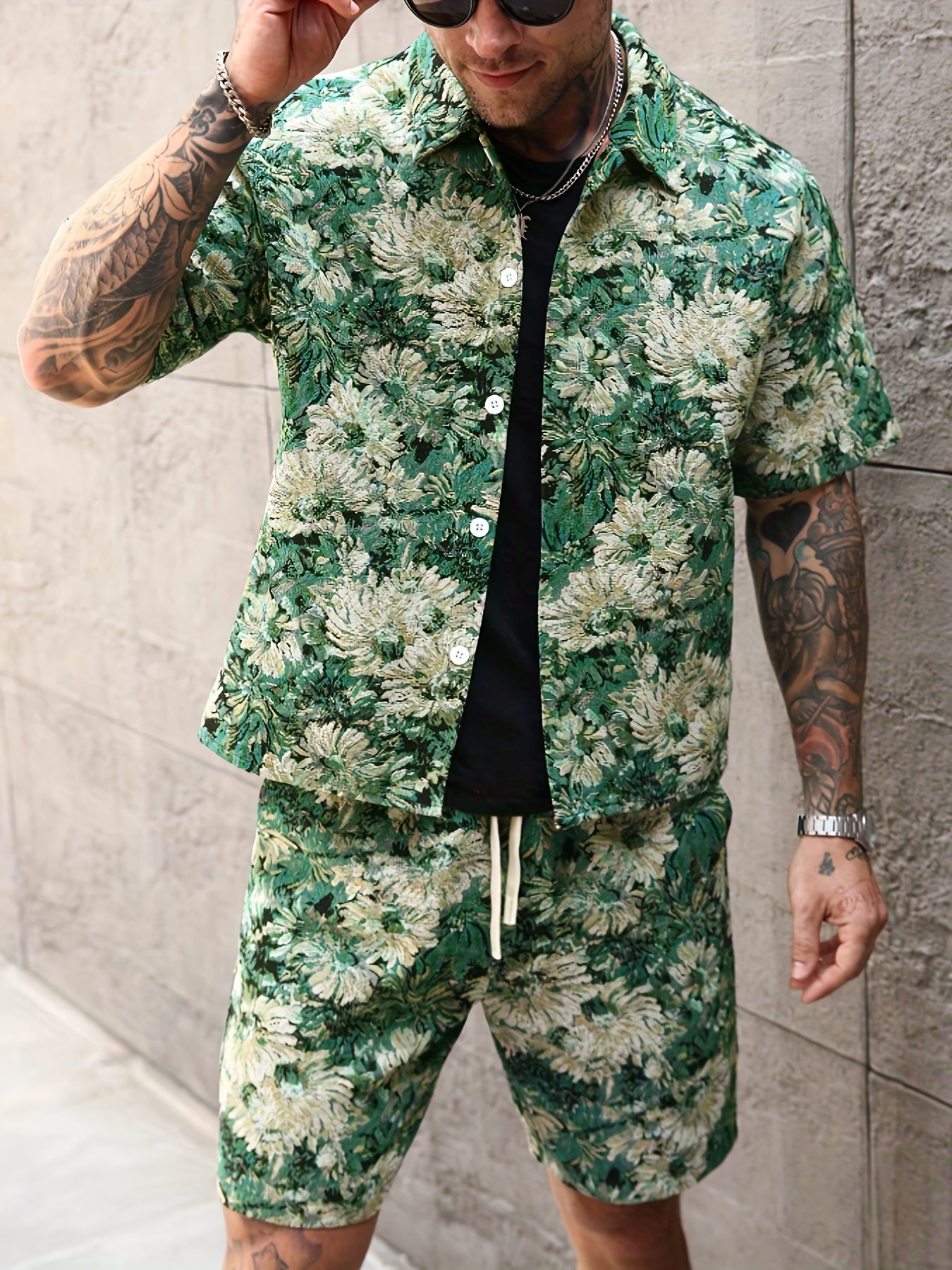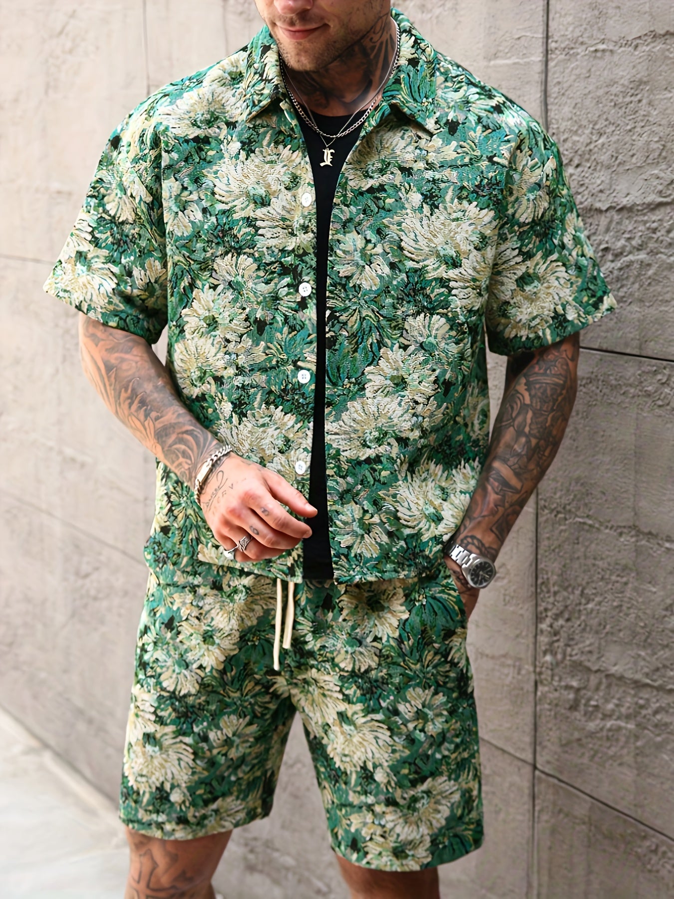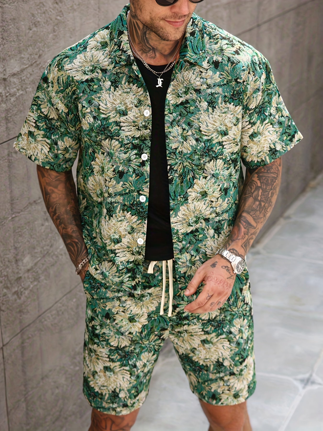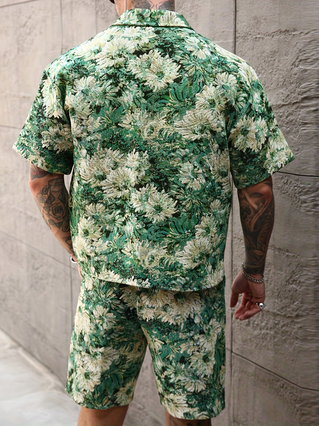 Men'S Summer Casual Short Sleeve Shirt & Shorts Set - Tropical Print, Loose Fit, Button-Up with Collar, Lightweight Polyester Fabric for Outdoor & Leisure Activities, Summer Casual Wear | Tropical Print Shirt | Lightweight Fa