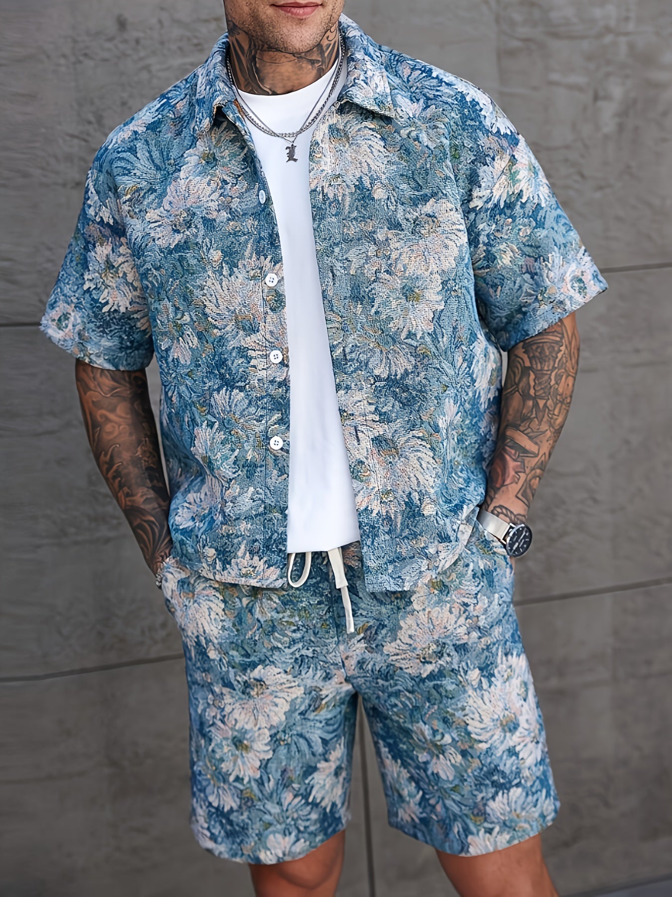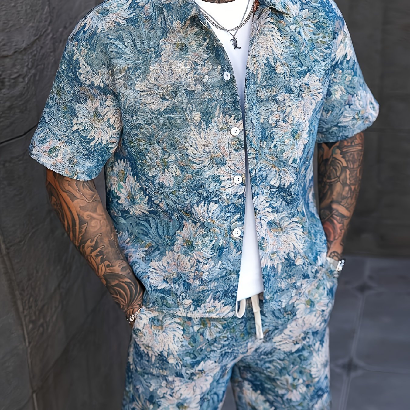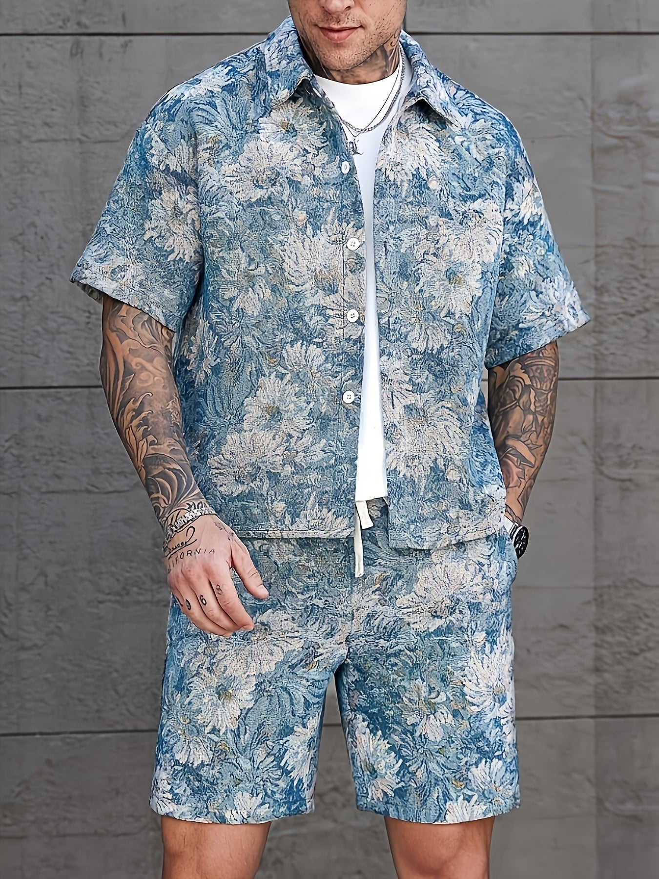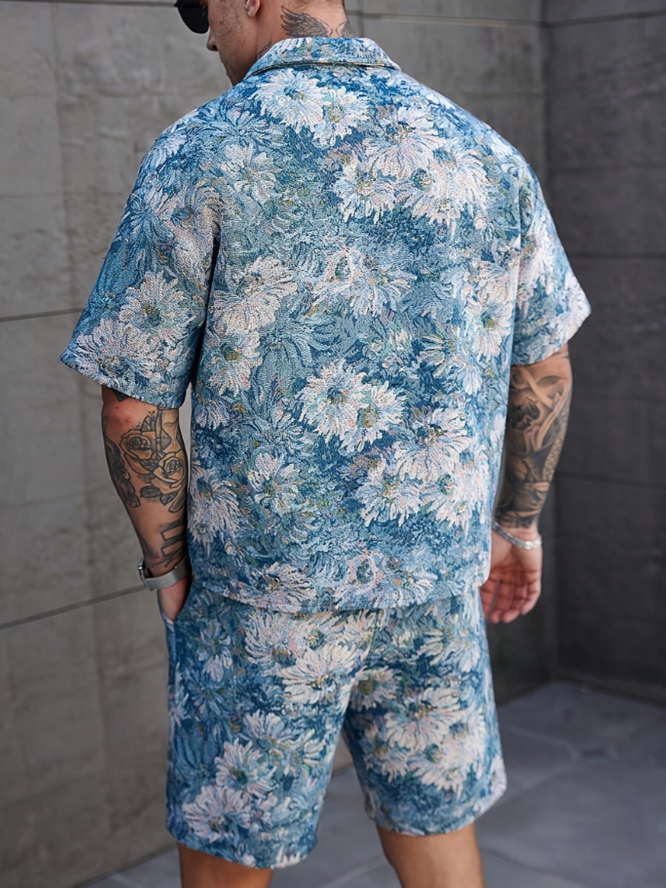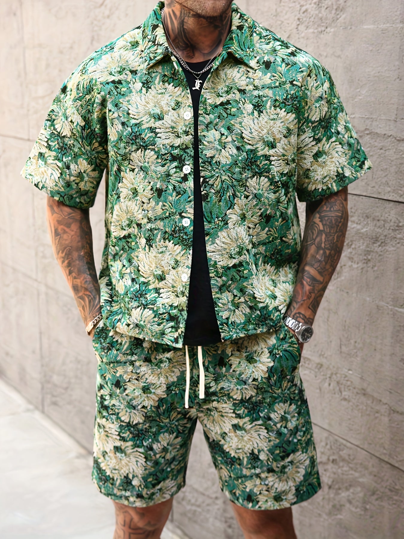 Men'S Summer Casual Short Sleeve Shirt & Shorts Set - Tropical Print, Loose Fit, Button-Up with Collar, Lightweight Polyester Fabric for Outdoor & Leisure Activities, Summer Casual Wear | Tropical Print Shirt | Lightweight Fa