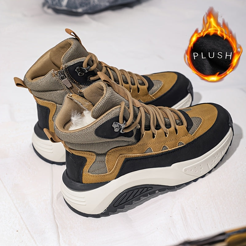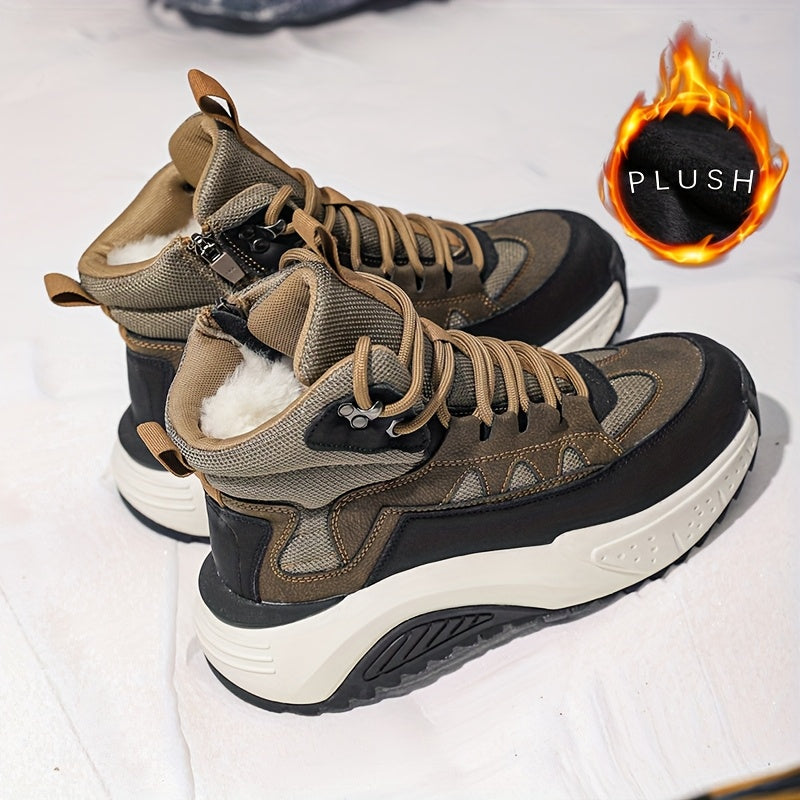 Men's Thermal Insulated Winter Boots with Lining - PU/Fabric Upper, Zipper & Lace Closure, Cushioned Insole & Arch Support, Brown/Black/White/Beige - Low-Top Round Toe for Snow, Ice, and Casual Attire - Ideal for Skiing, Hik