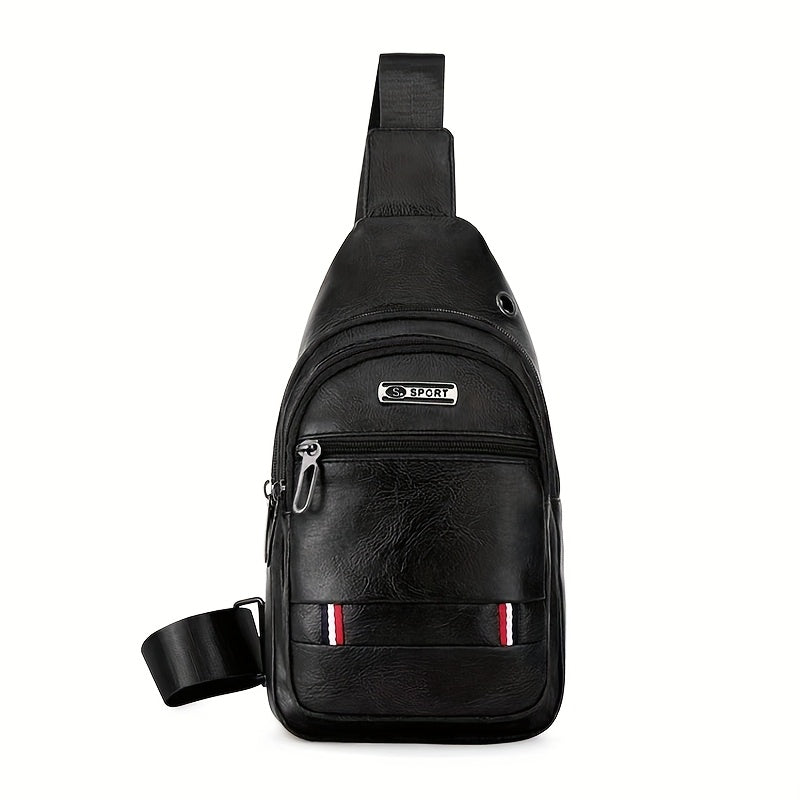 Men'S Vintage Faux Leather Chest Bag - Crossbody Sling Style, Multi-Layer Zippered Front, Brown with Red White Stripes, Perfect for Casual Outings, Crossbody Bag, Secure Zipper Closure