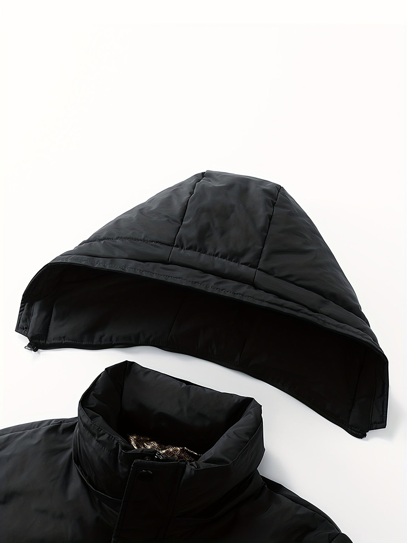 Men's Winter Jacket 100% Polyester Windproof Thermal Insulated Hooded with Detachable Hood, College Style Letter Pattern Zipper Front, Regular Fit for Skiing Outdoor Activities & Daily Wear