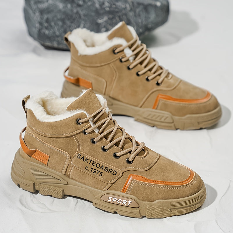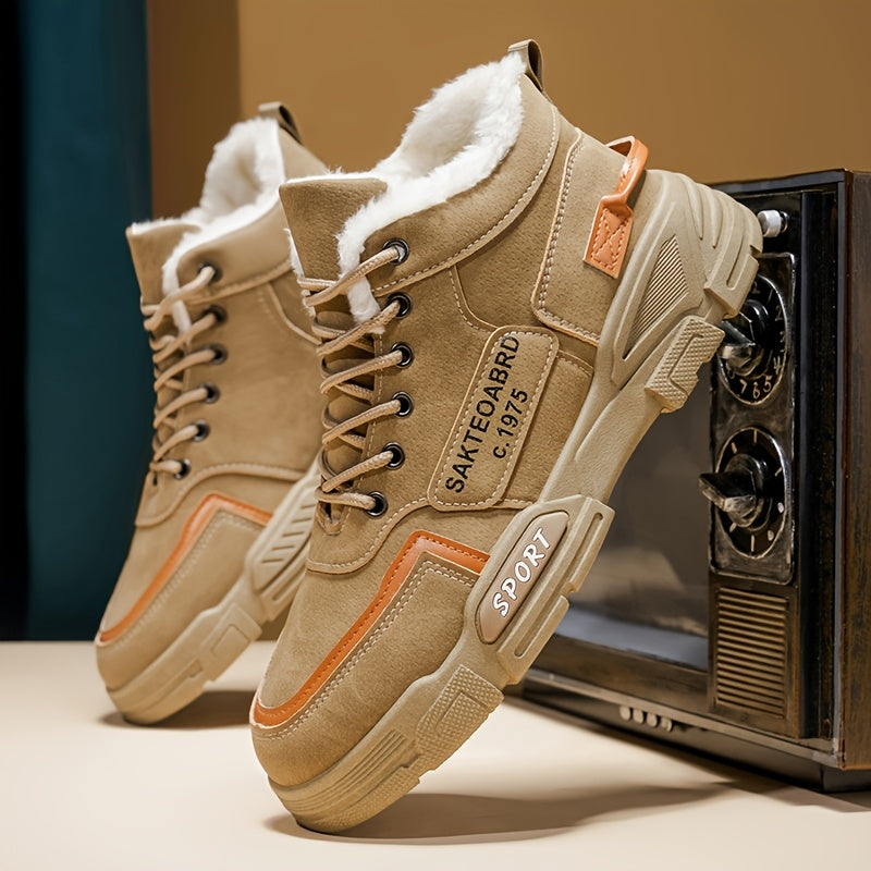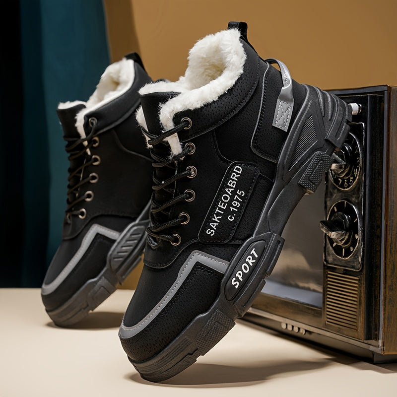 Mid-Top Fleece-Lined Comfortable Warm Gripper Sole Casual Winter Boots for Men and Women, Striped Design. Suitable for Extreme Cold Weather Snowy Conditions with Thick Insulation Lace Closure Anti Slip Durable PVC Outsole Hun