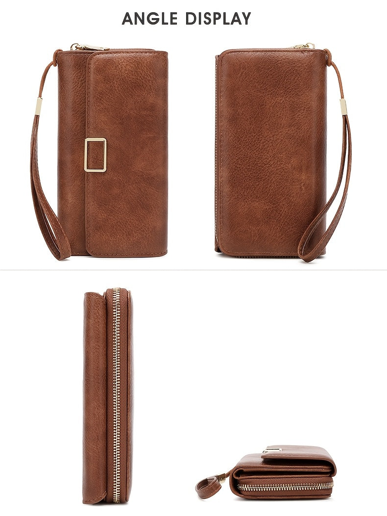 MIYIN Women's Vintage RFID Blocking Large Capacity Wallet with Wrist Strap - Tri-Fold Handbag, Zipper Pocket & ID Slot, Multi-Card Holder (Credit/Debit) - Solid for Professional & Everyday Use