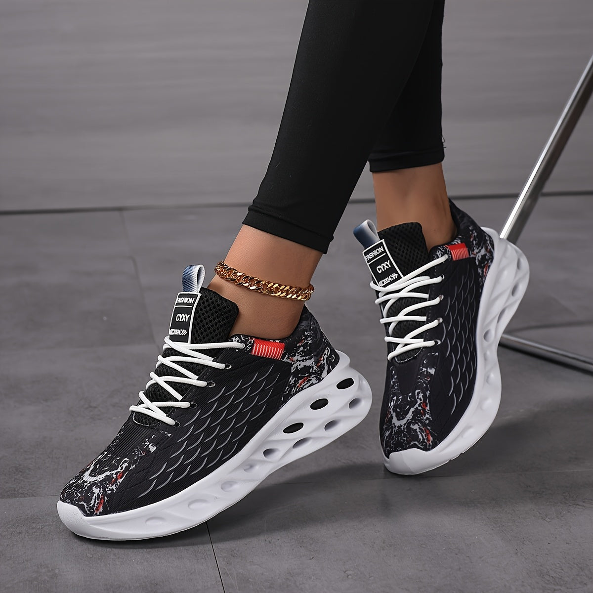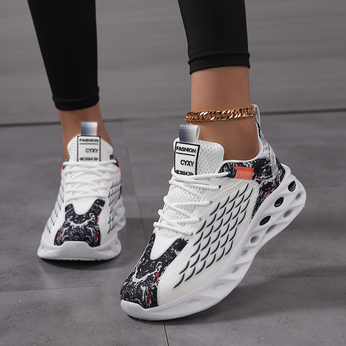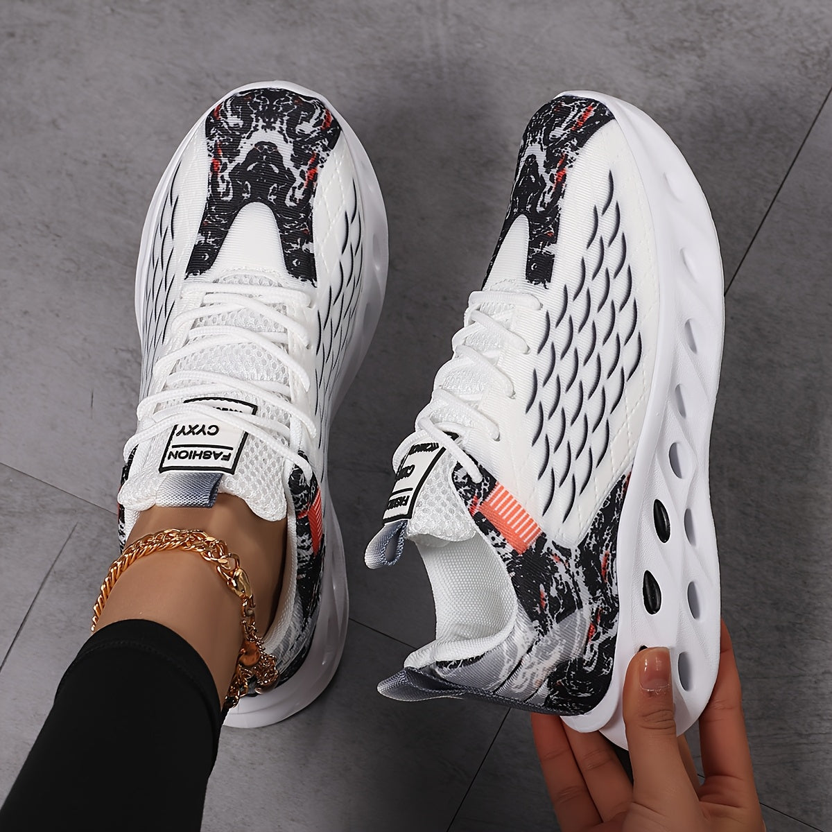 New Fish Scale Large Size Women's Couple Lace-Up Breathable Knitted Running Shoes, Fashion Casual Trendy Sports Sneakers with Perforated Soles and Comfortable High-Top Coconut Design