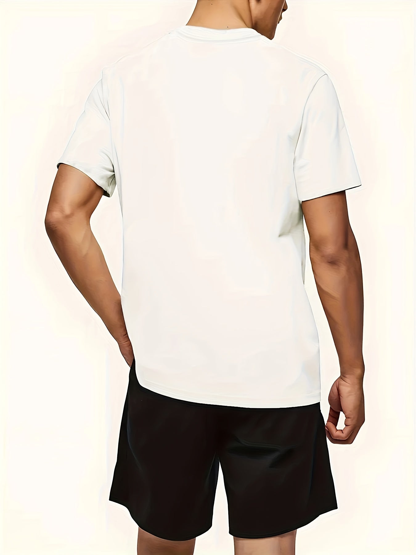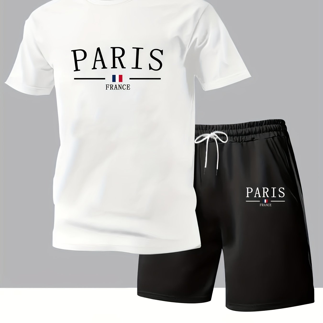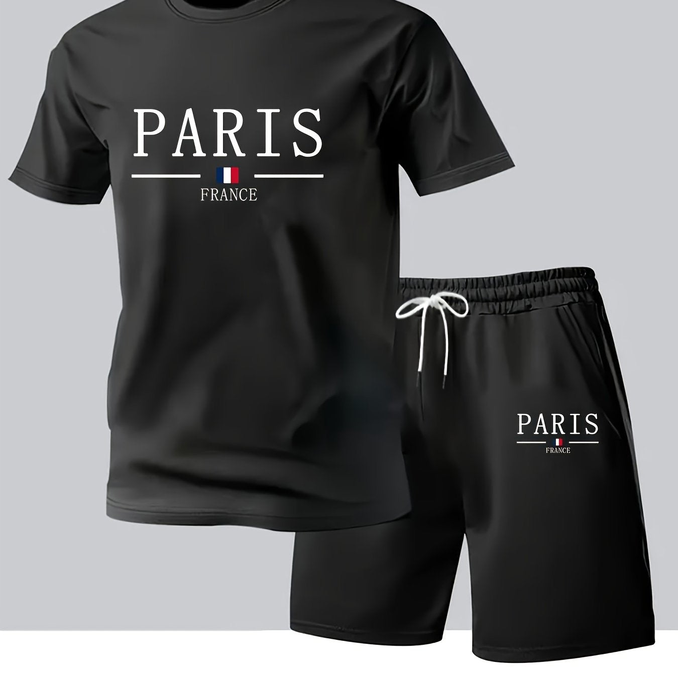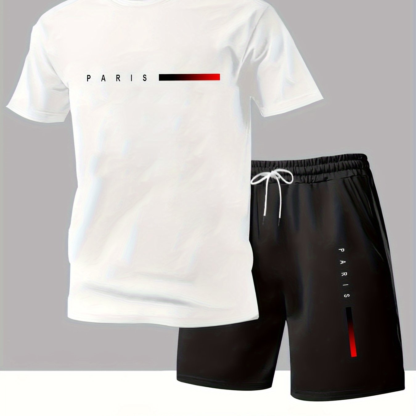 Paris Gradient Letter Print Men's Two-Piece Set: Crew Neck Short Sleeve T-Shirt and Drawstring Shorts Summer Casual Sportswear