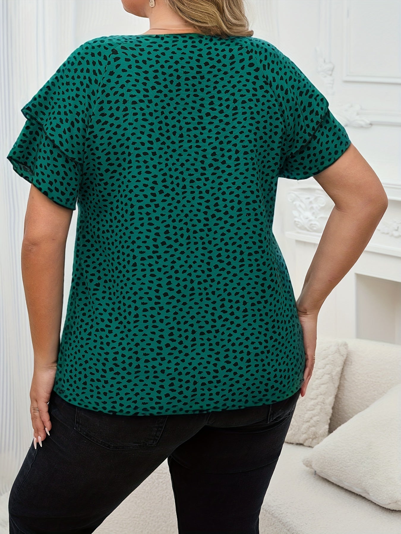Plus Size Allover Print Blouse, Elegant Ruffle Sleeve Crew Neck Top for Spring & Summer, Women's Plus Size Clothing