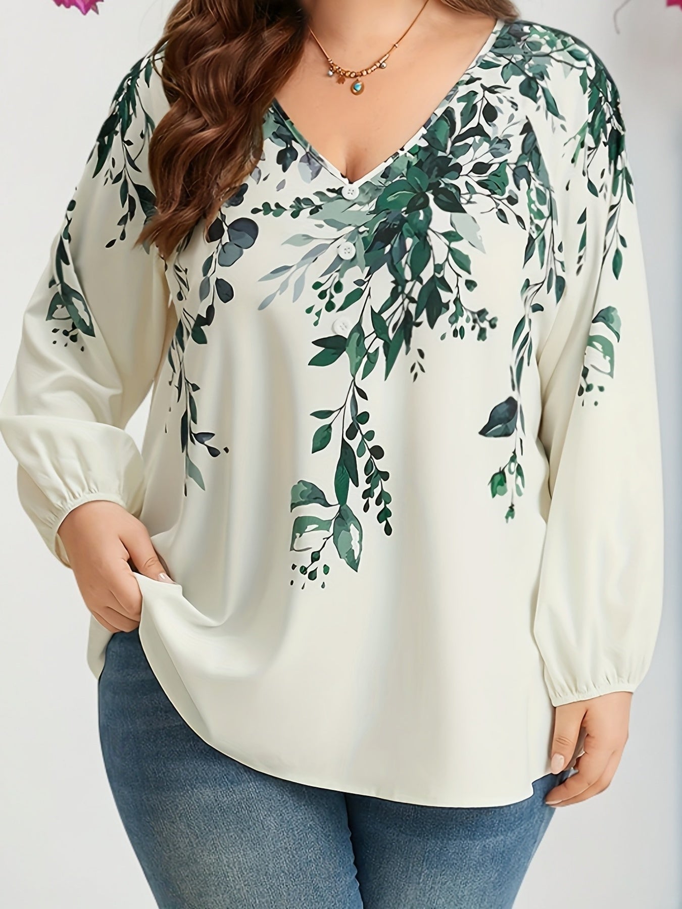 Plus Size Floral Print Blouse, Casual V Neck Long Sleeve Blouse For Spring, Women's Plus Size Clothing