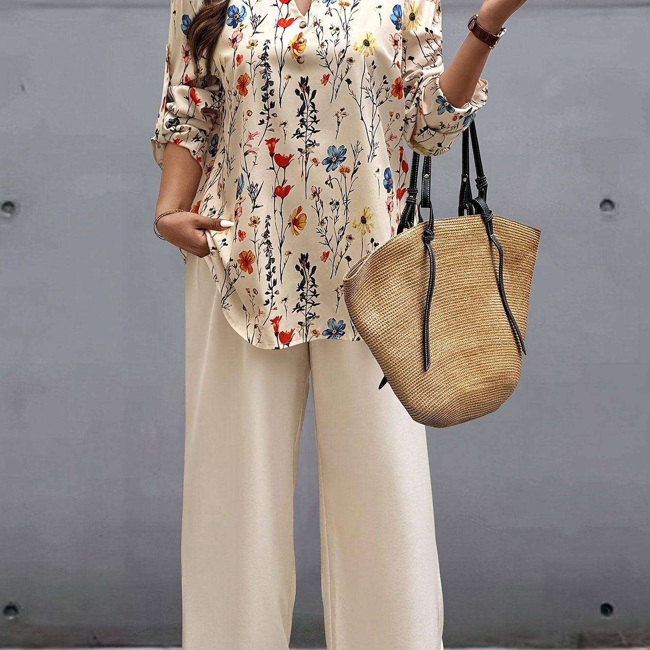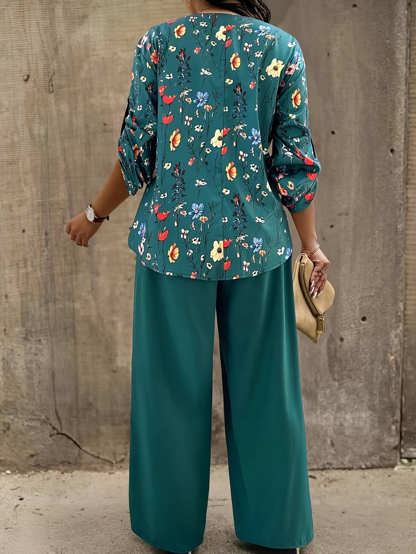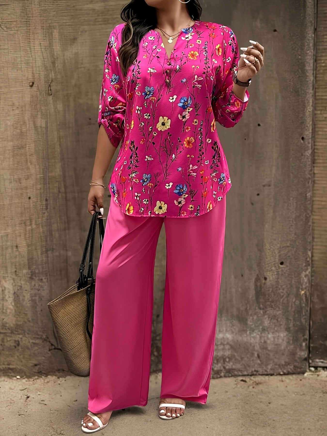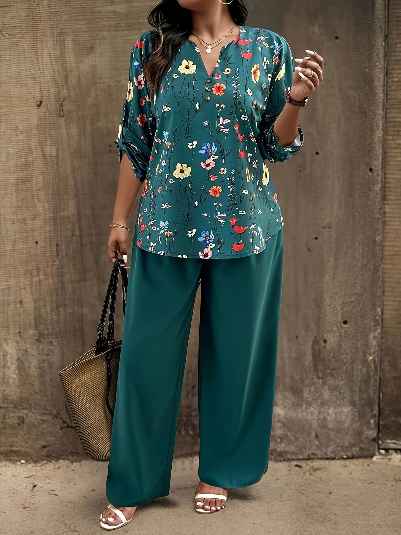 Plus Size, Oriented - Plus Size Women's Vacation Style Floral Shirt and Pants Set