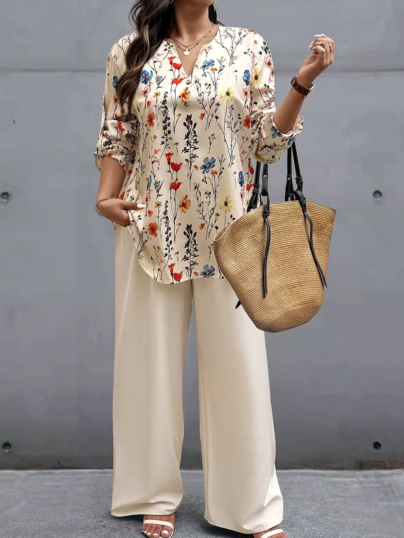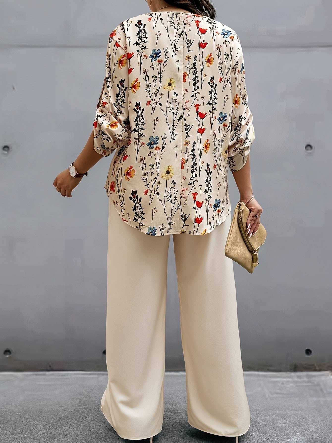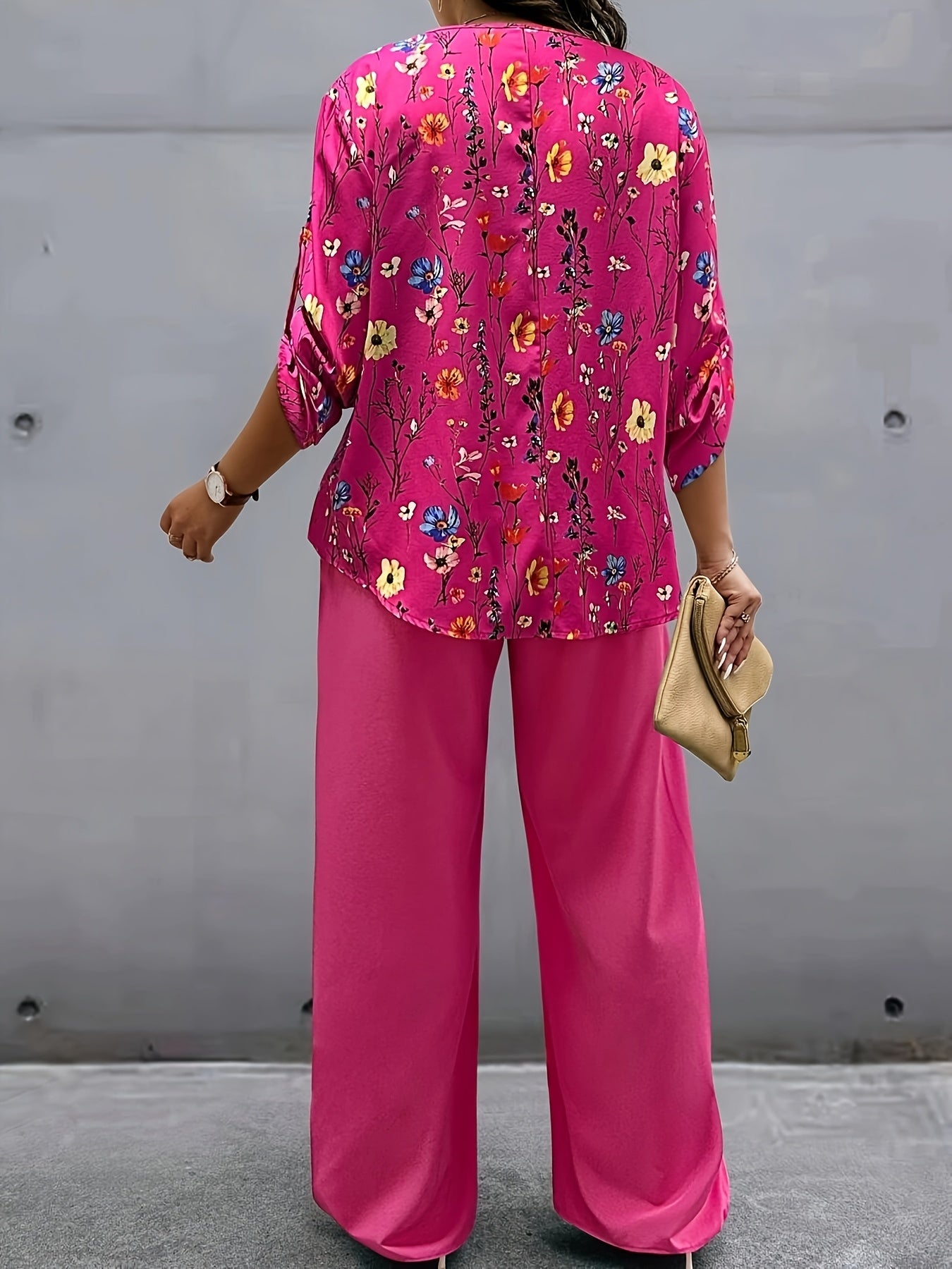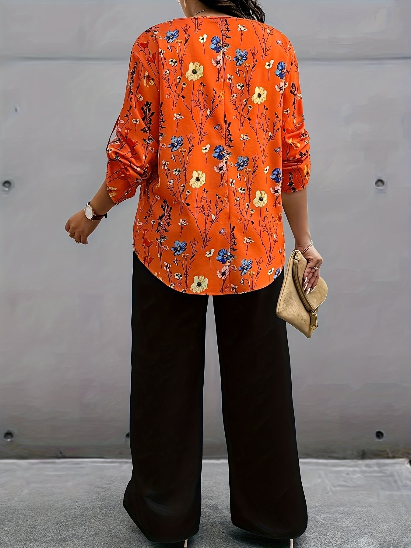 Plus Size, Oriented - Plus Size Women's Vacation Style Floral Shirt and Pants Set