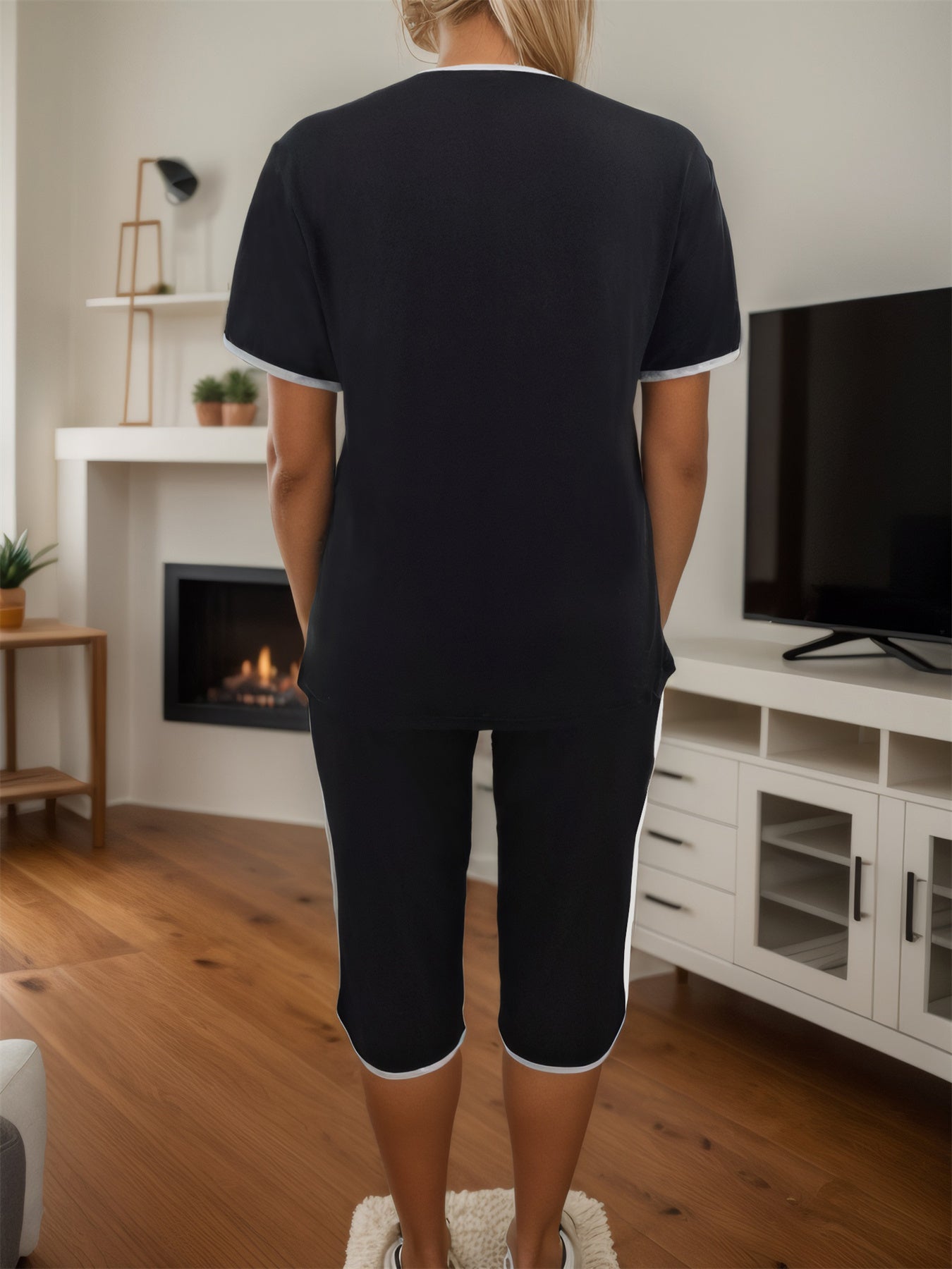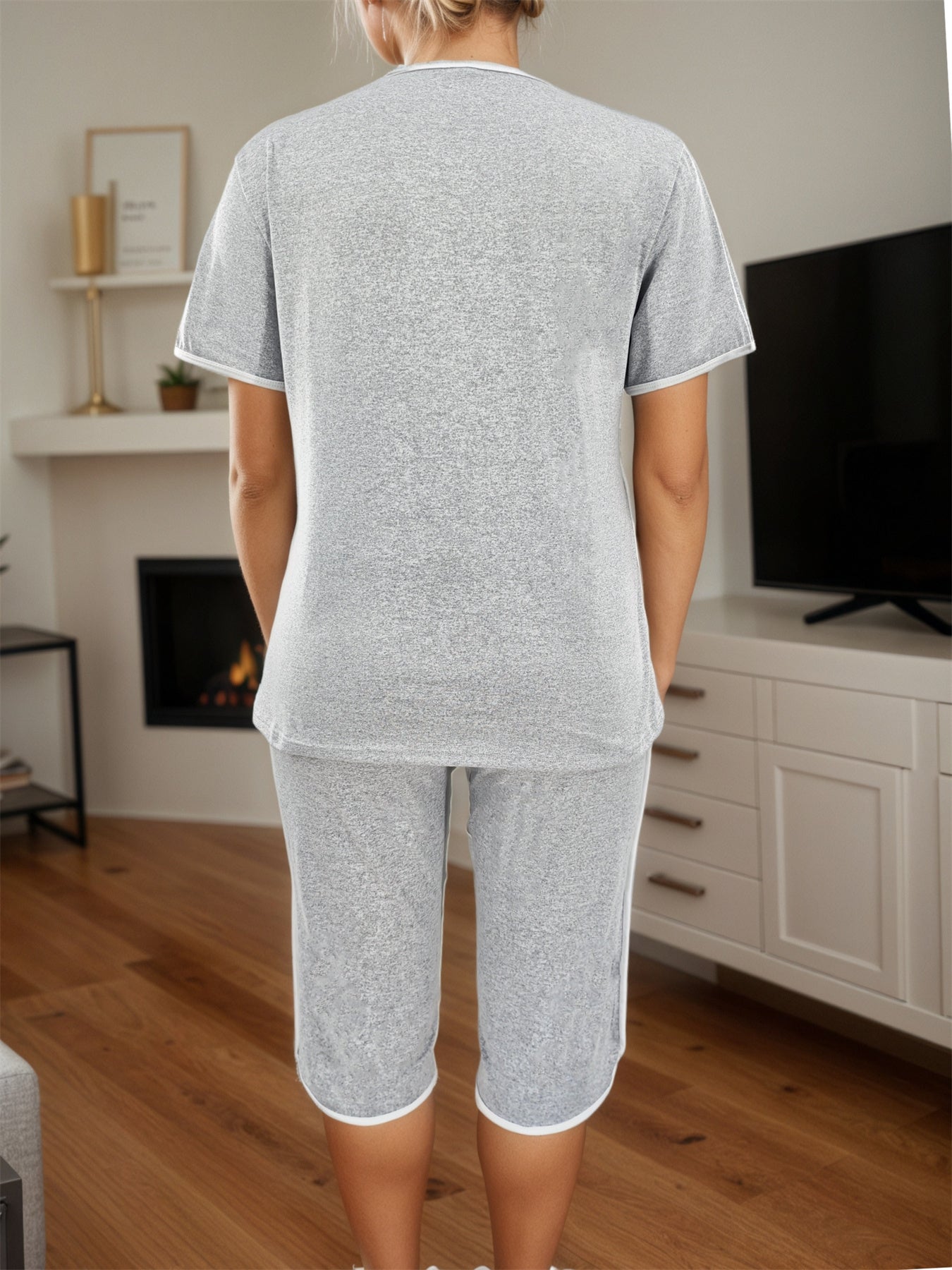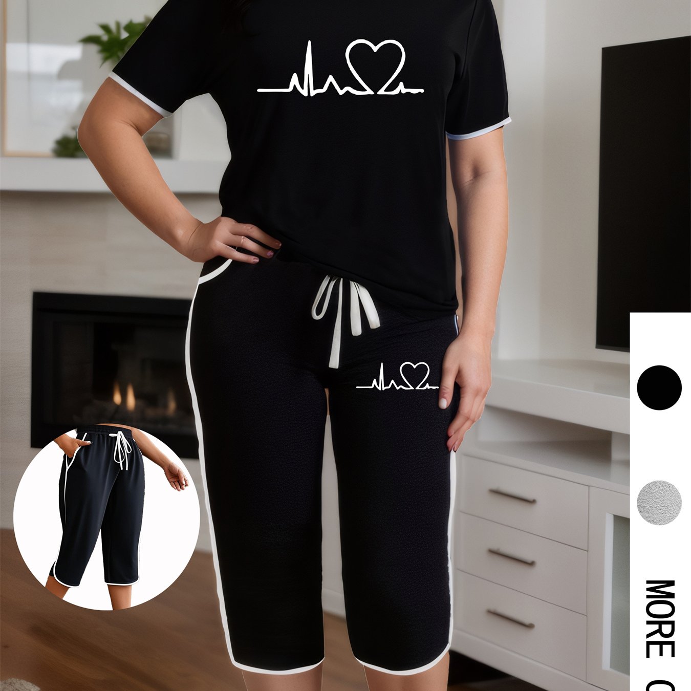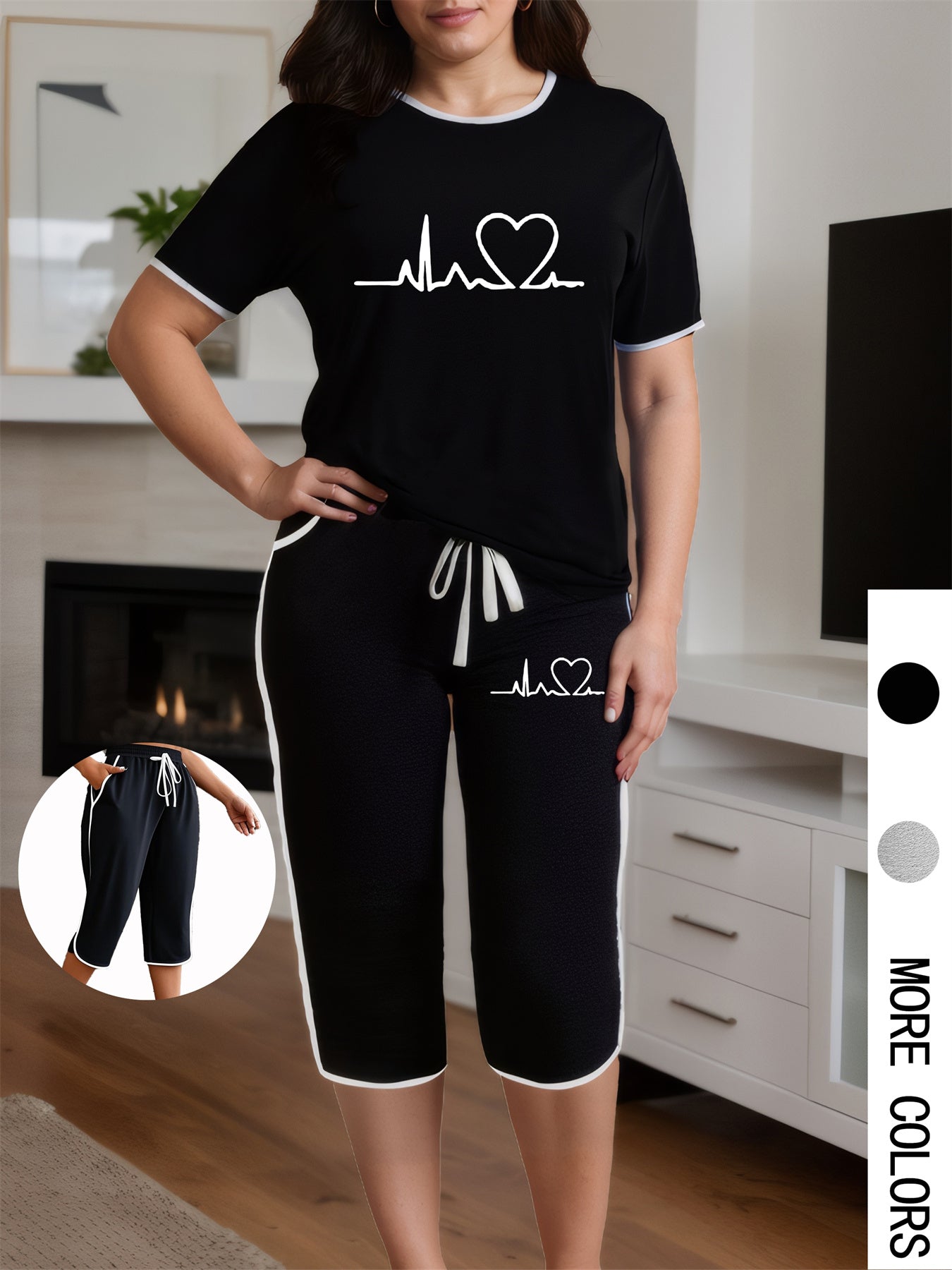 Plus Size - Summer Plus Size Women'S Two-Piece Set with Heart Print Short Sleeve Round Neck Top and Pleated Pockets Cropped Pants Casual Women'S Two-Piece Set