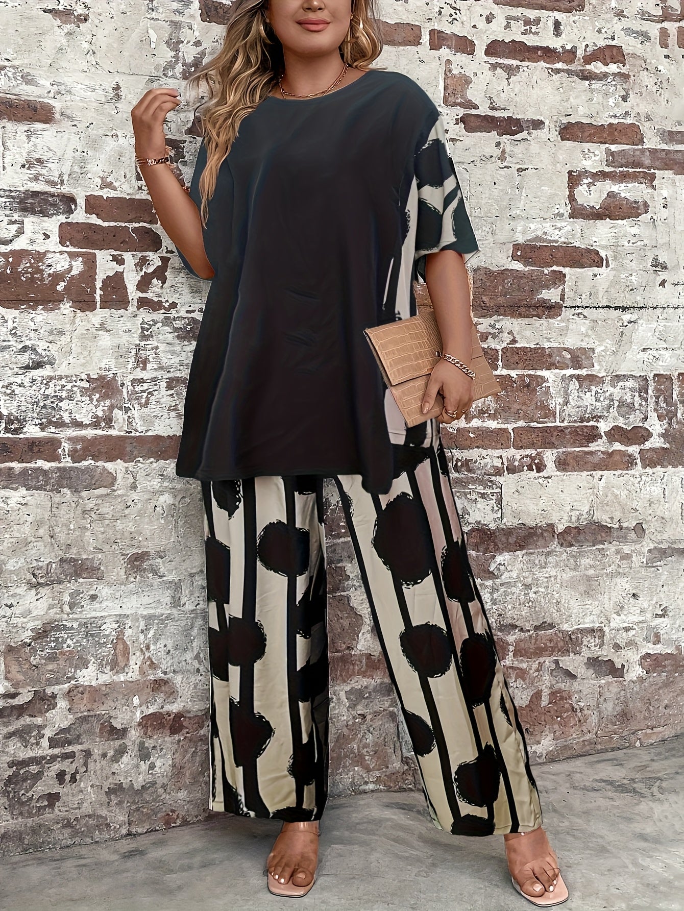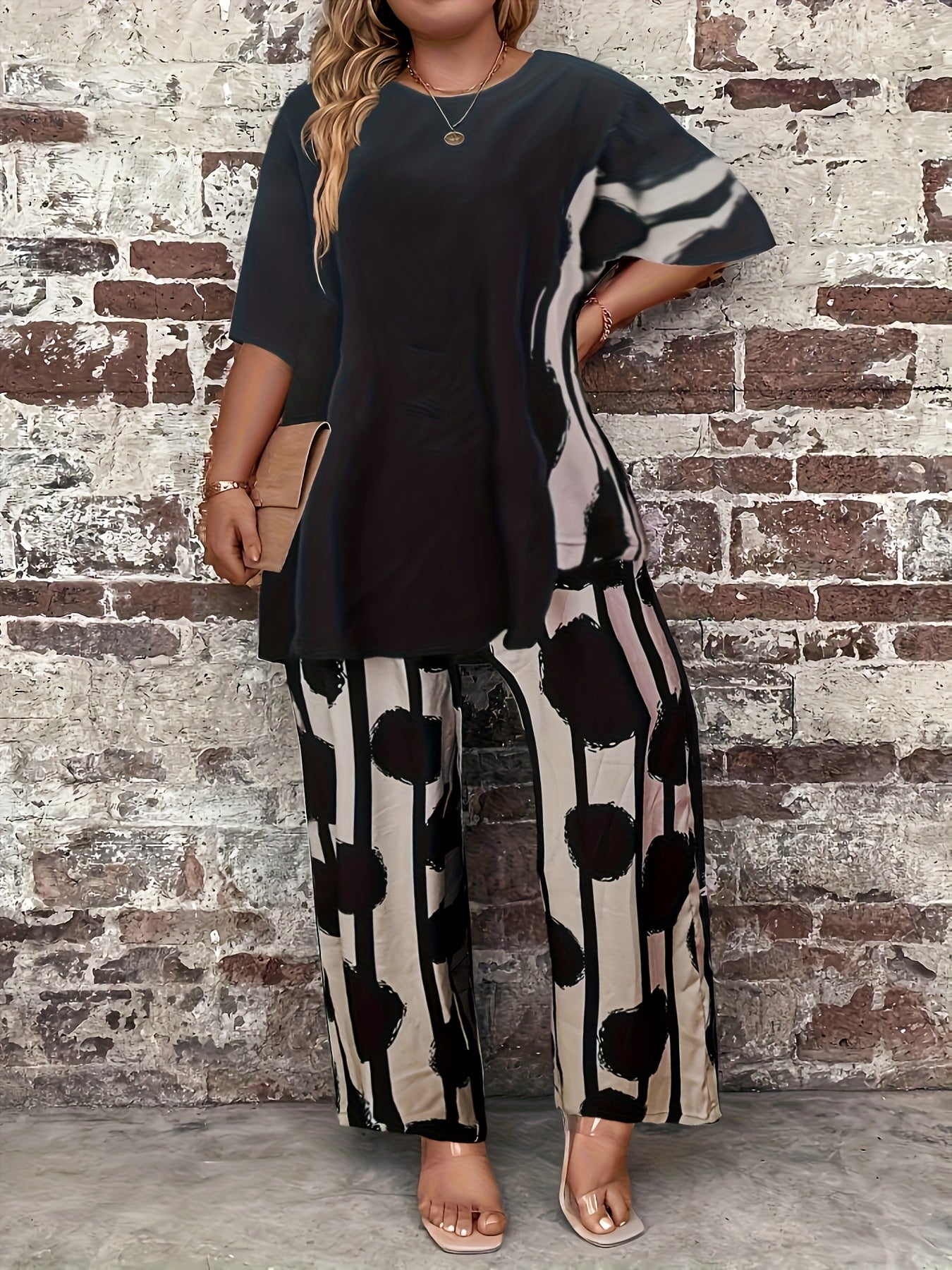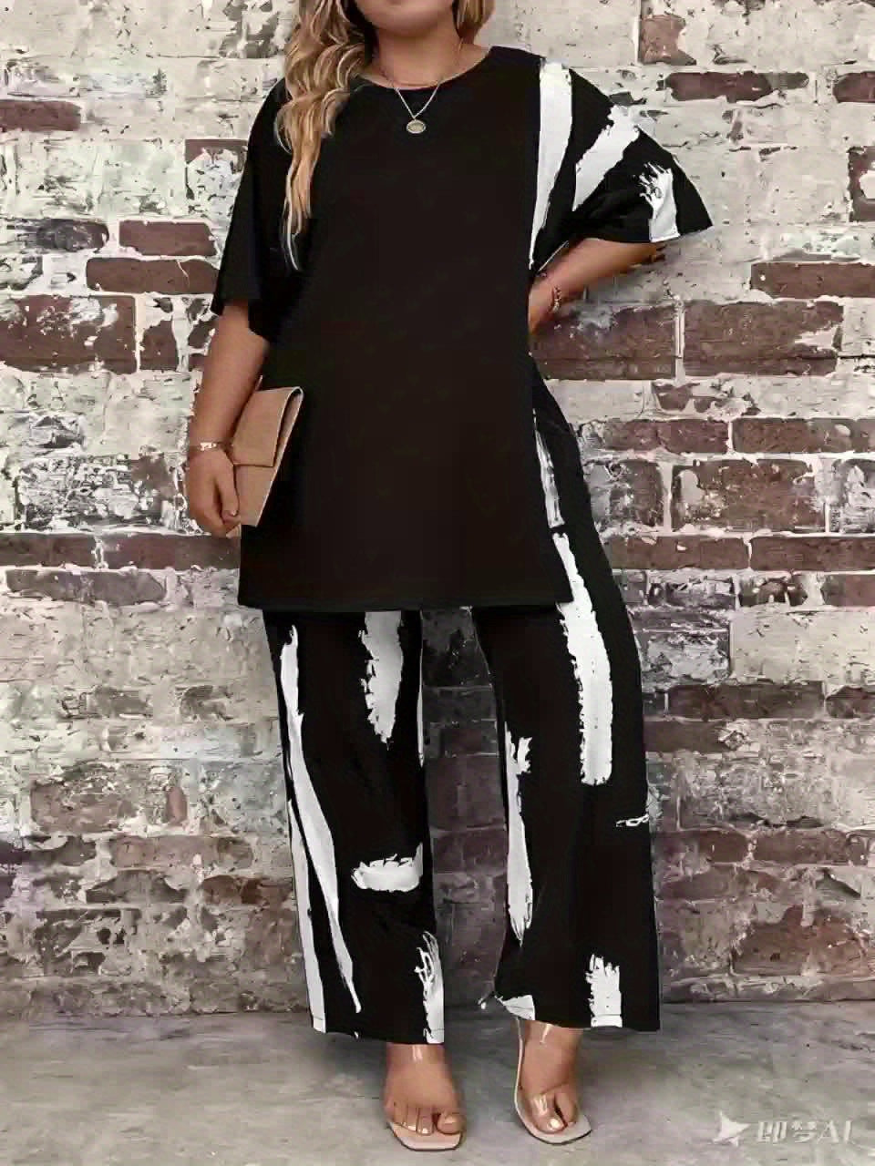 Plus Size Women'S Black Printed Sweater Set - Casual Long Sleeve Pullover with "LOVE" Design, Wide Leg Pants, Non-Stretch Fabric, Perfect for Fall & Winter, Autumn Winter Wear|Casual Style|Comfortable Fit